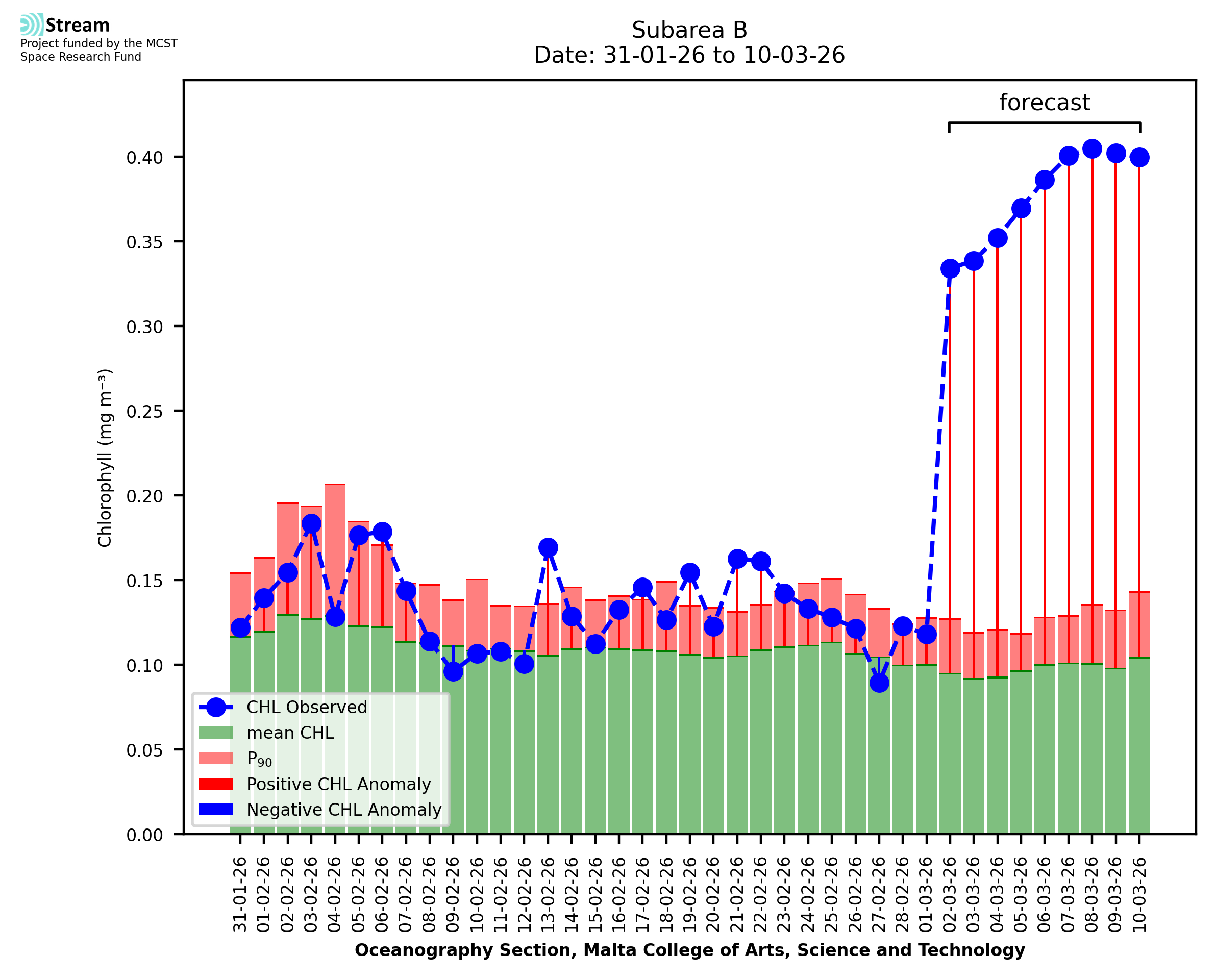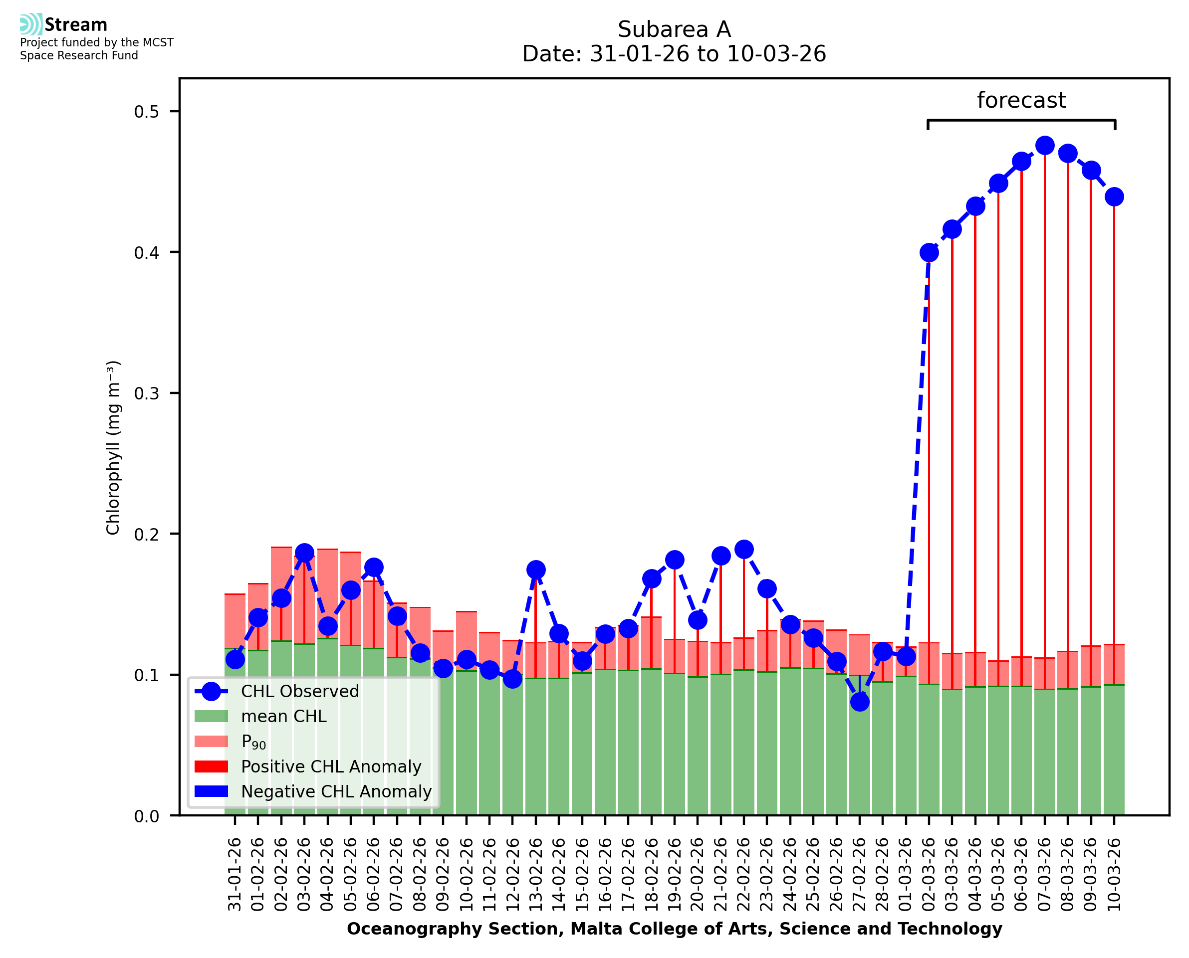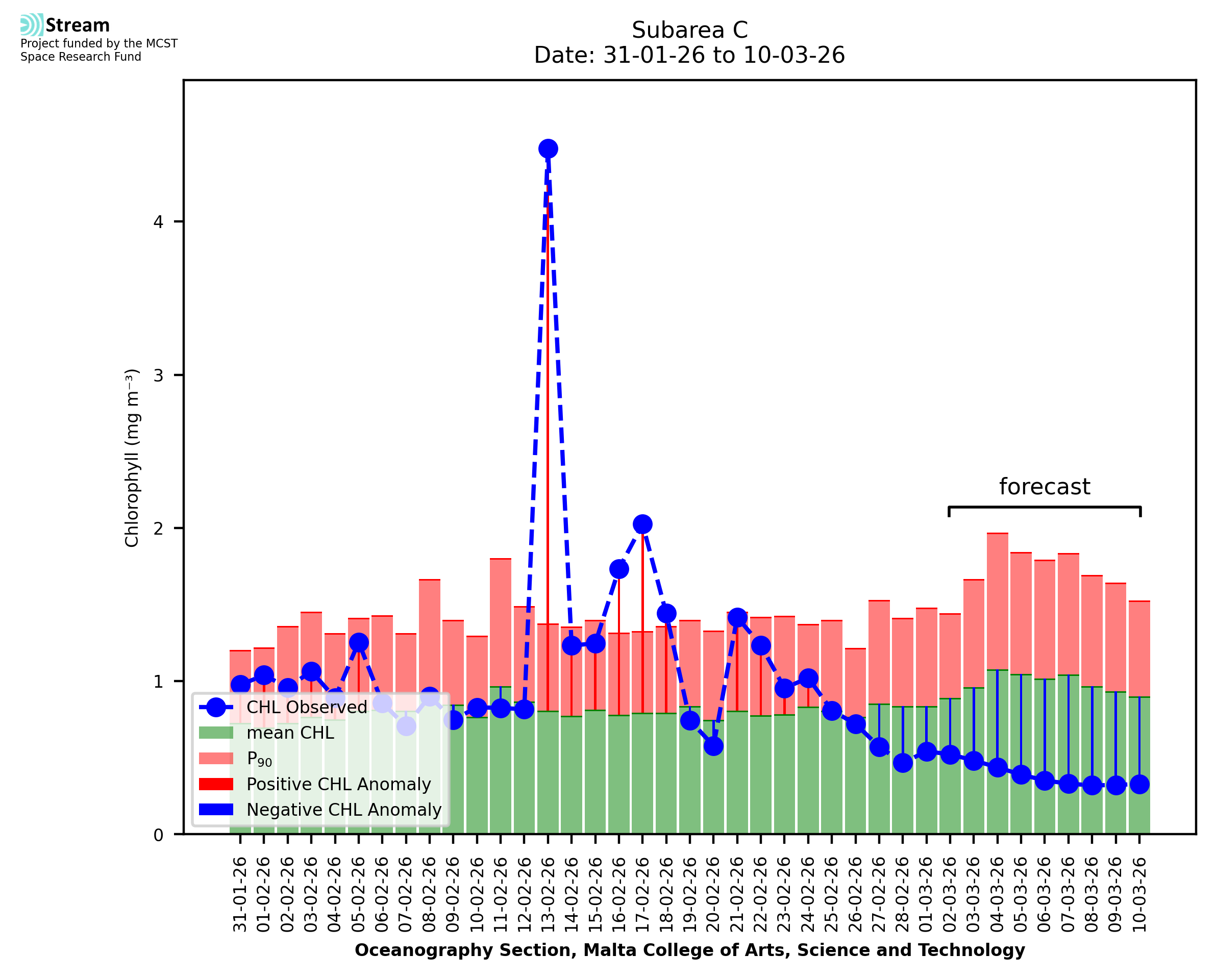 This STREAM service provides daily analysis of mass concentration of chlorophyll-a (CHL) anomalies, including spatial index maps for high chlorophyll occurrence and intensity in the Malta shelf area. User specific requests for data access and visualisation are planned for delivery on the STREAM mobile app. CHL is a core parameter in the Marine Strategy Framework Directive which provides the common framework for the assessment of the state of health of coastal seas to ensure coherence with the set goals of productive, healthy and clean European seas. CHL is considered to be a proxy of phythoplankton biomass and hence for eutrophication. Measuring chlorophyll is an indication of how much primary production is occurring in the sea.