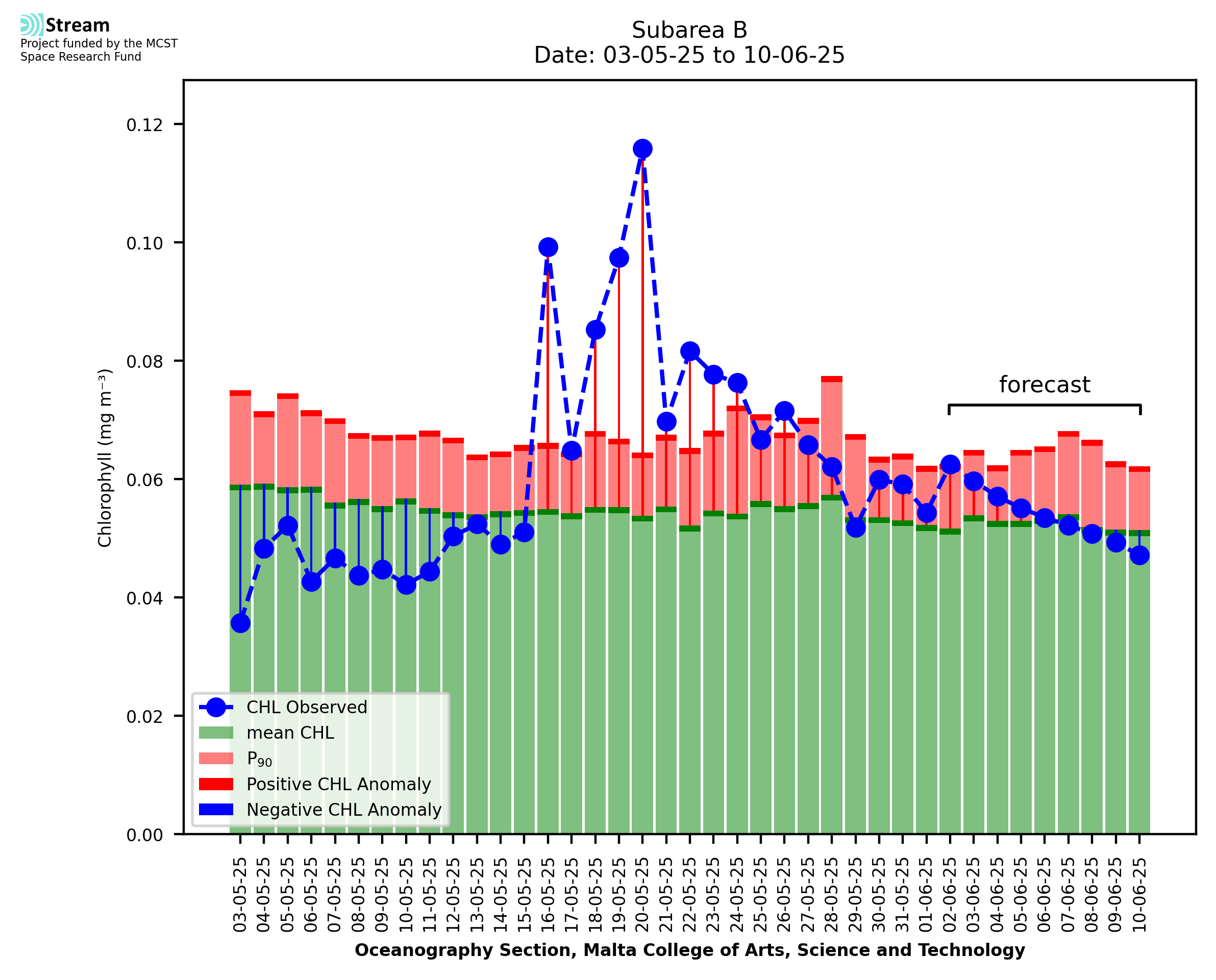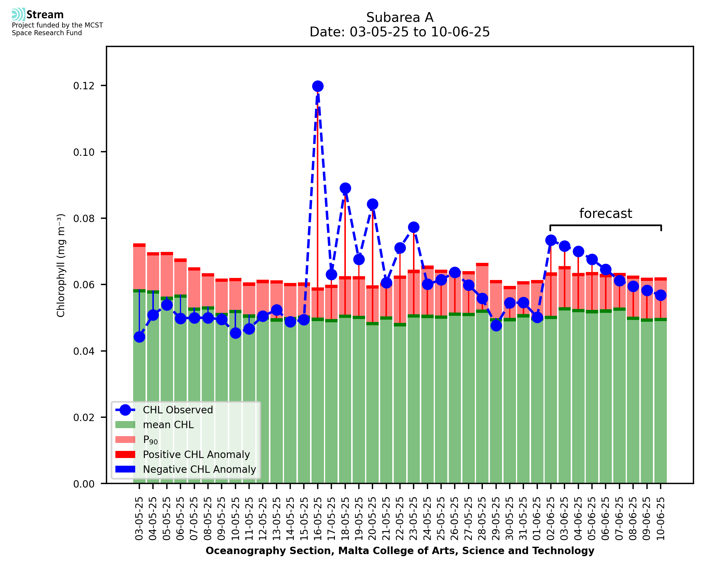 This STREAM service provides daily analysis of mass concentration of chlorophyll-a (CHL) anomalies, including spatial index maps for high chlorophyll occurrence and intensity in the Malta shelf area. User specific requests for data access and visualisation are planned for delivery on the STREAM mobile app. CHL is a core parameter in the Marine Strategy Framework Directive which provides the common framework for the assessment of the state of health of coastal seas to ensure coherence with the set goals of productive, healthy and clean European seas. CHL is considered to be a proxy of phythoplankton biomass and hence for eutrophication. Measuring chlorophyll is an indication of how much primary production is occurring in the sea.