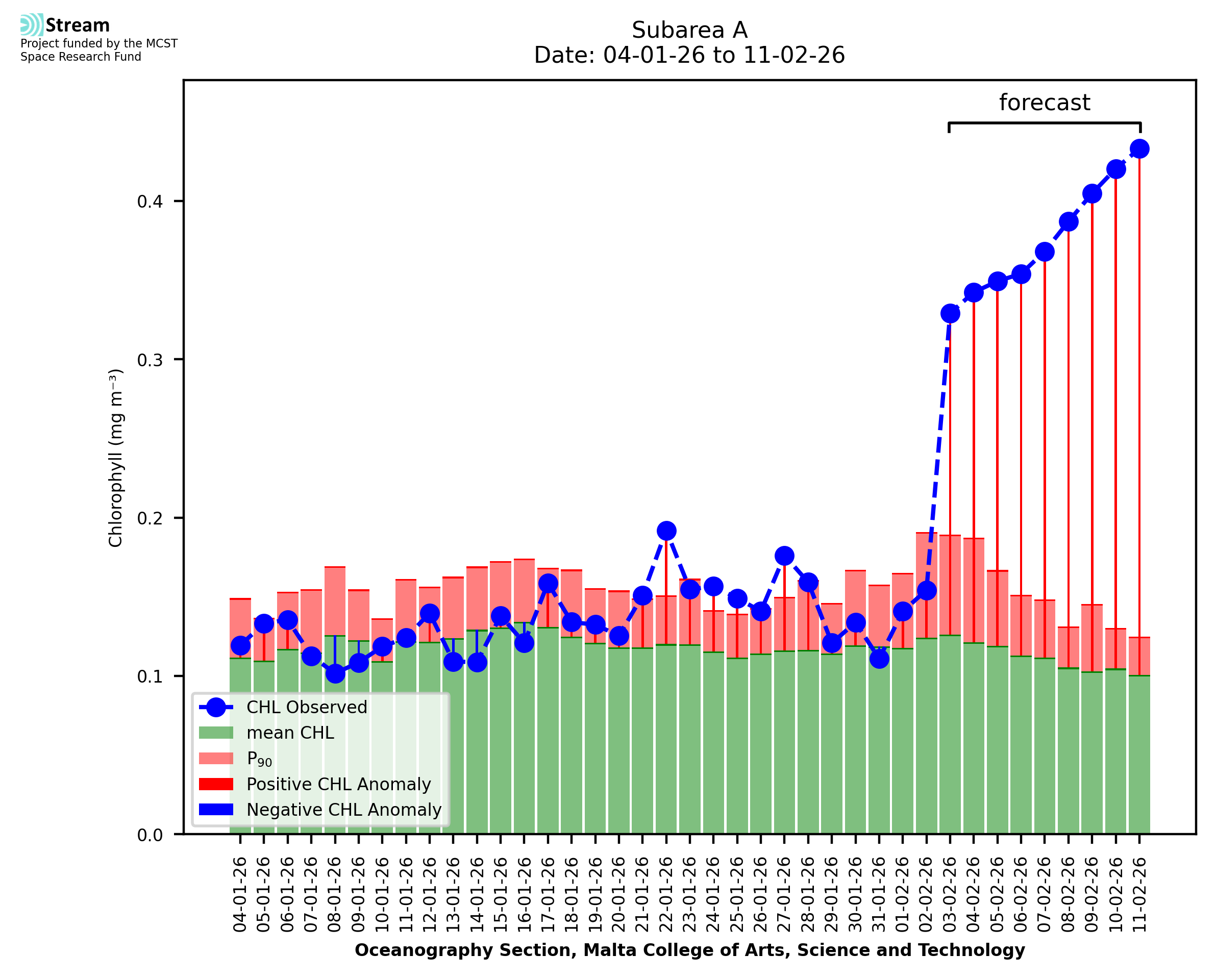 This STREAM service provides daily analysis of mass concentration of chlorophyll-a (CHL) anomalies, including spatial index maps for high chlorophyll occurrence and intensity in the Malta shelf area. User specific requests for data access and visualisation are planned for delivery on the STREAM mobile app. CHL is a core parameter in the Marine Strategy Framework Directive which provides the common framework for the assessment of the state of health of coastal seas to ensure coherence with the set goals of productive, healthy and clean European seas. CHL is considered to be a proxy of phythoplankton biomass and hence for eutrophication. Measuring chlorophyll is an indication of how much primary production is occurring in the sea.
