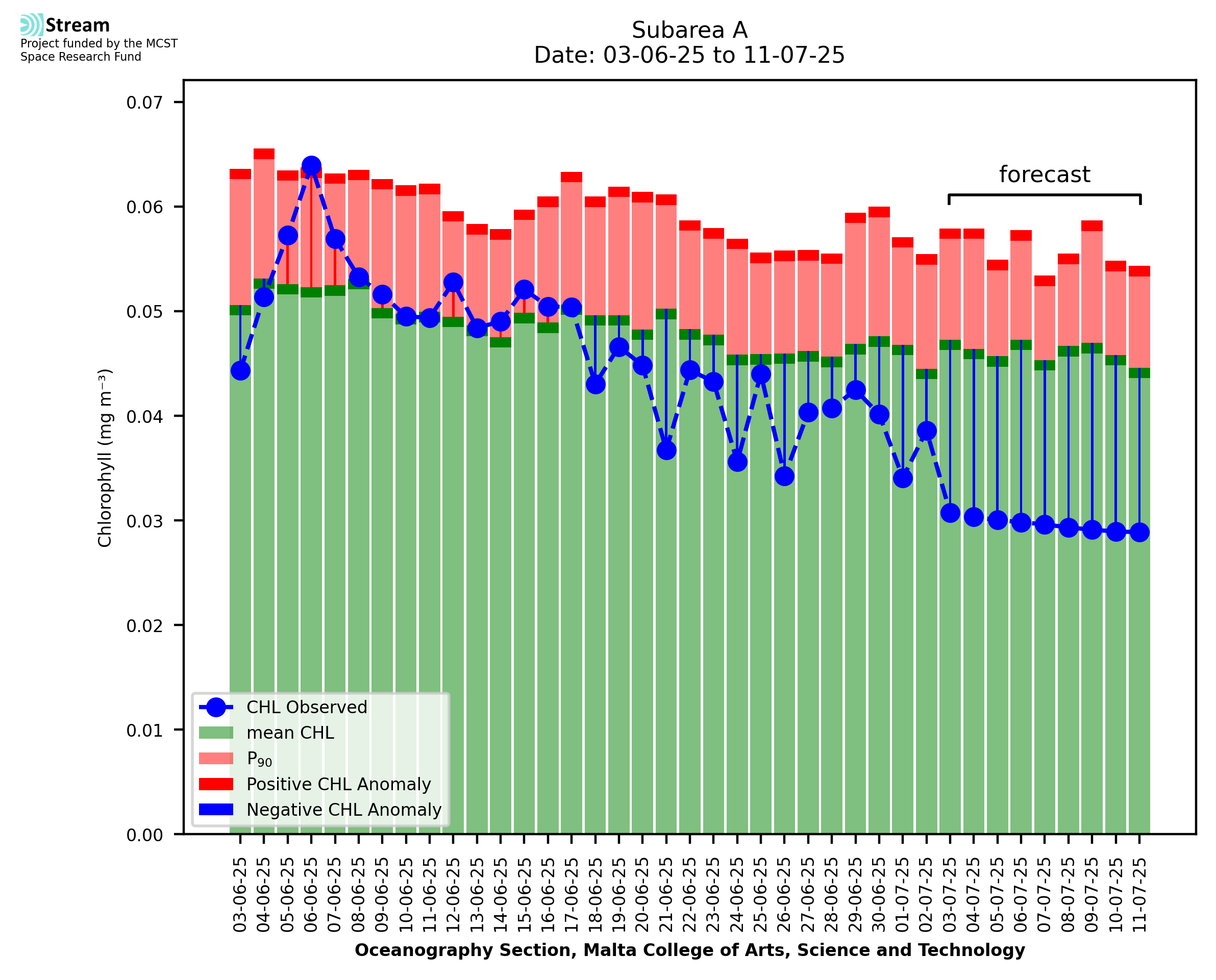 This STREAM service provides daily analysis of mass concentration of chlorophyll-a (CHL) anomalies, including spatial index maps for high chlorophyll occurrence and intensity in the Malta shelf area. User specific requests for data access and visualisation are planned for delivery on the STREAM mobile app. CHL is a core parameter in the Marine Strategy Framework Directive which provides the common framework for the assessment of the state of health of coastal seas to ensure coherence with the set goals of productive, healthy and clean European seas. CHL is considered to be a proxy of phythoplankton biomass and hence for eutrophication. Measuring chlorophyll is an indication of how much primary production is occurring in the sea.