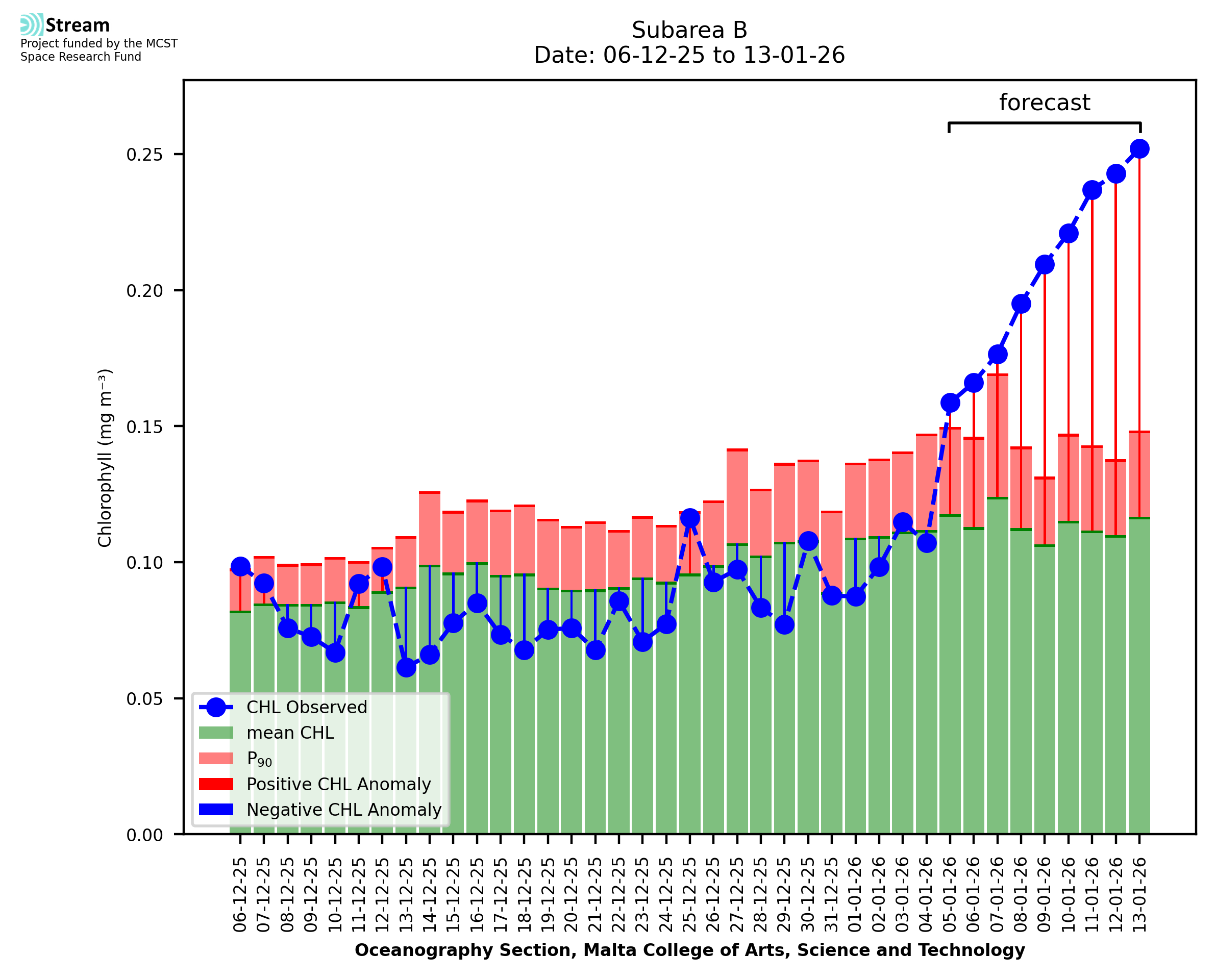 This STREAM service provides daily analysis of mass concentration of chlorophyll-a (CHL) anomalies, including spatial index maps for high chlorophyll occurrence and intensity in the Malta shelf area. User specific requests for data access and visualisation are planned for delivery on the STREAM mobile app. CHL is a core parameter in the Marine Strategy Framework Directive which provides the common framework for the assessment of the state of health of coastal seas to ensure coherence with the set goals of productive, healthy and clean European seas. CHL is considered to be a proxy of phythoplankton biomass and hence for eutrophication. Measuring chlorophyll is an indication of how much primary production is occurring in the sea.