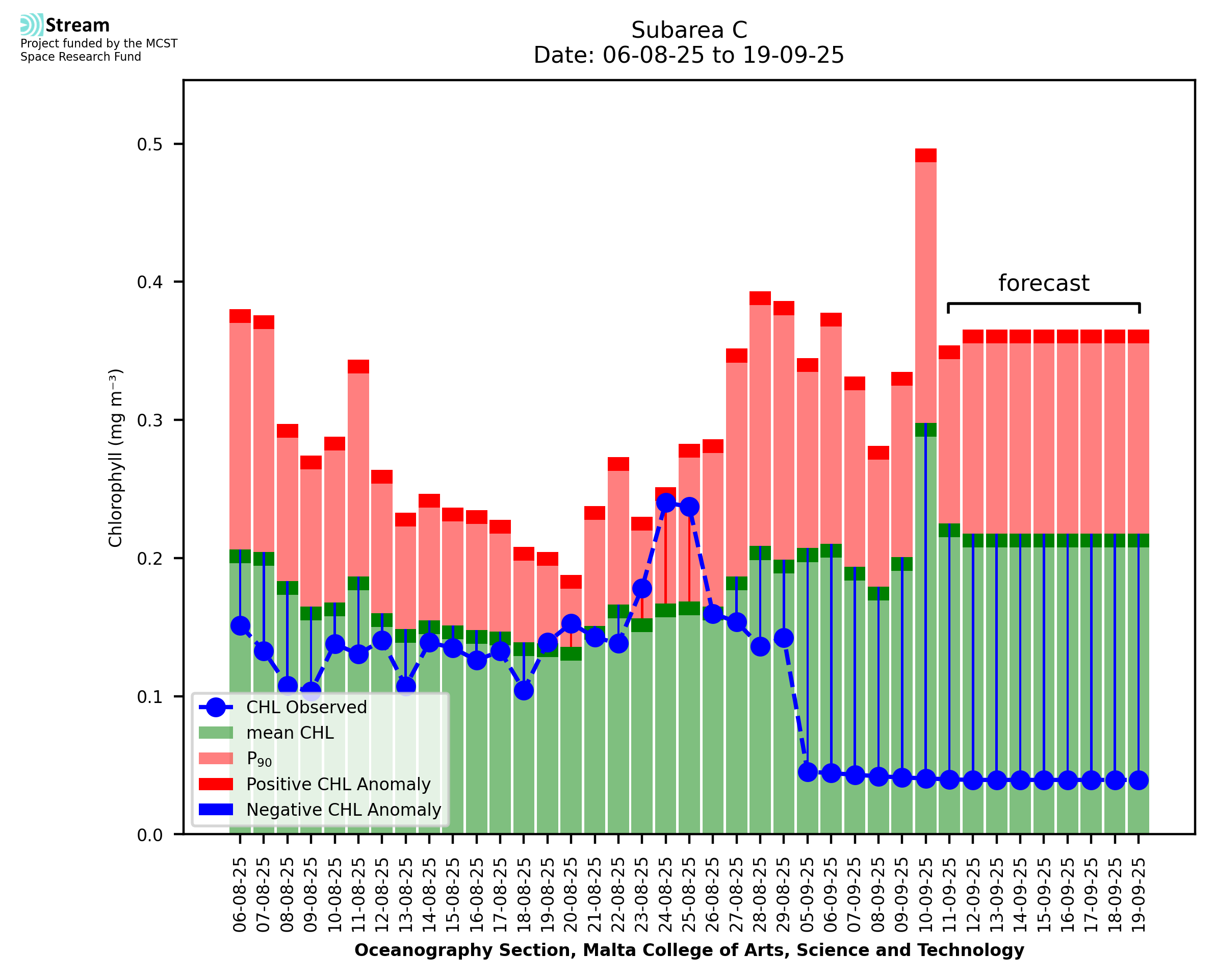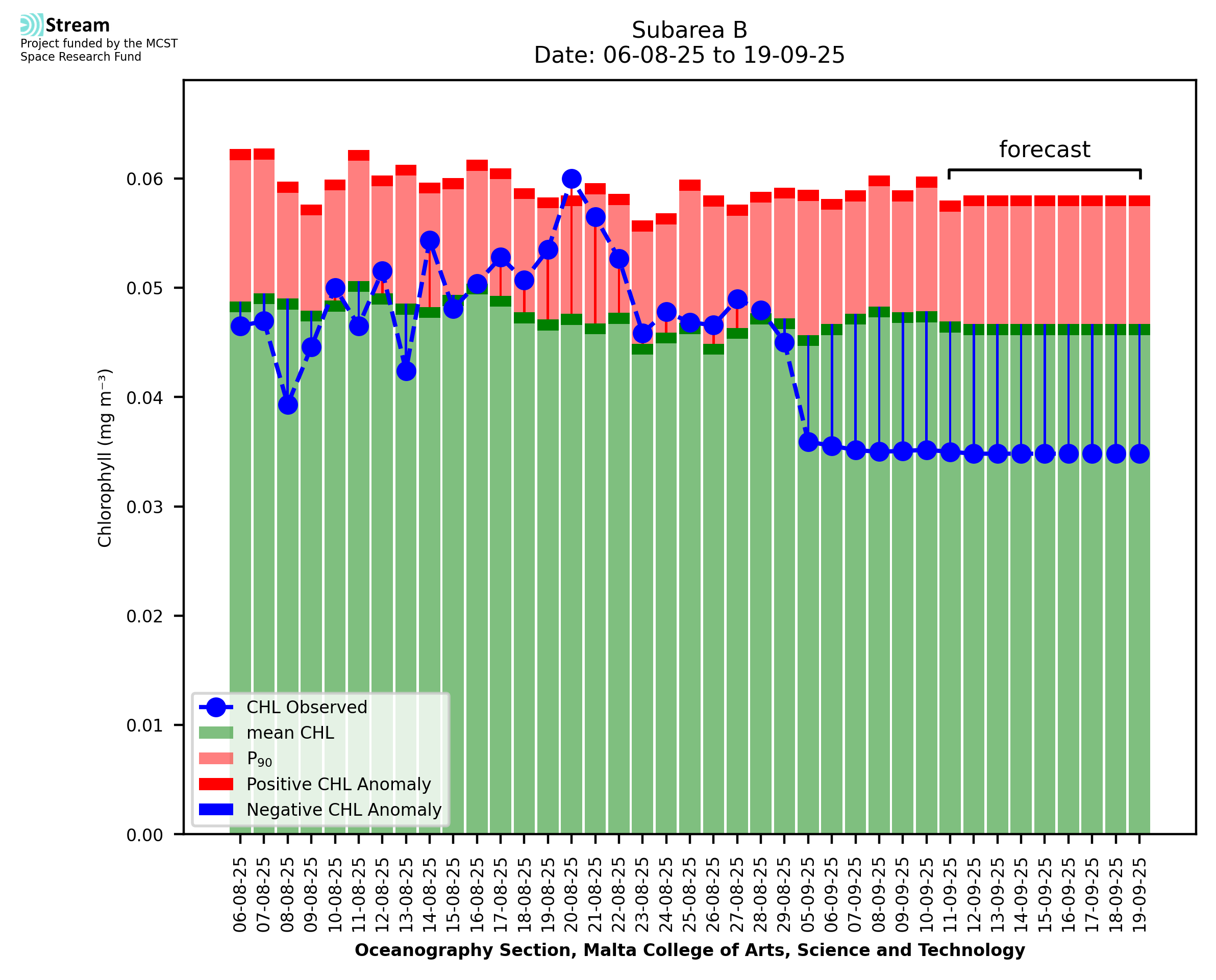 This STREAM service provides daily analysis of mass concentration of chlorophyll-a (CHL) anomalies, including spatial index maps for high chlorophyll occurrence and intensity in the Malta shelf area. User specific requests for data access and visualisation are planned for delivery on the STREAM mobile app. CHL is a core parameter in the Marine Strategy Framework Directive which provides the common framework for the assessment of the state of health of coastal seas to ensure coherence with the set goals of productive, healthy and clean European seas. CHL is considered to be a proxy of phythoplankton biomass and hence for eutrophication. Measuring chlorophyll is an indication of how much primary production is occurring in the sea.