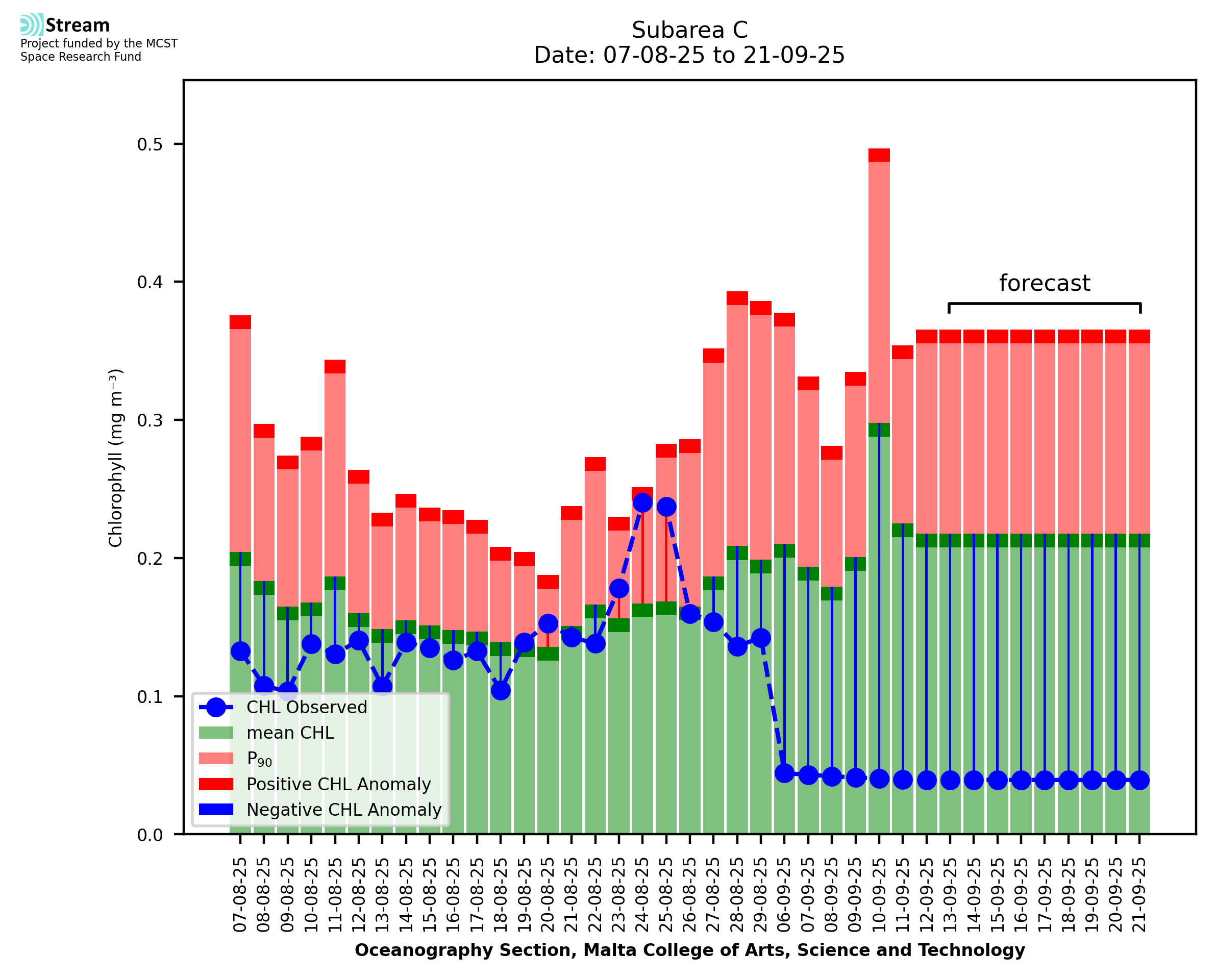This STREAM service provides daily analysis of mass concentration of chlorophyll-a (CHL) anomalies, including spatial index maps for high chlorophyll occurrence and intensity in the Malta shelf area. User specific requests for data access and visualisation are planned for delivery on the STREAM mobile app. CHL is a core parameter in the Marine Strategy Framework Directive which provides the common framework for the assessment of the state of health of coastal seas to ensure coherence with the set goals of productive, healthy and clean European seas. CHL is considered to be a proxy of phythoplankton biomass and hence for eutrophication. Measuring chlorophyll is an indication of how much primary production is occurring in the sea.