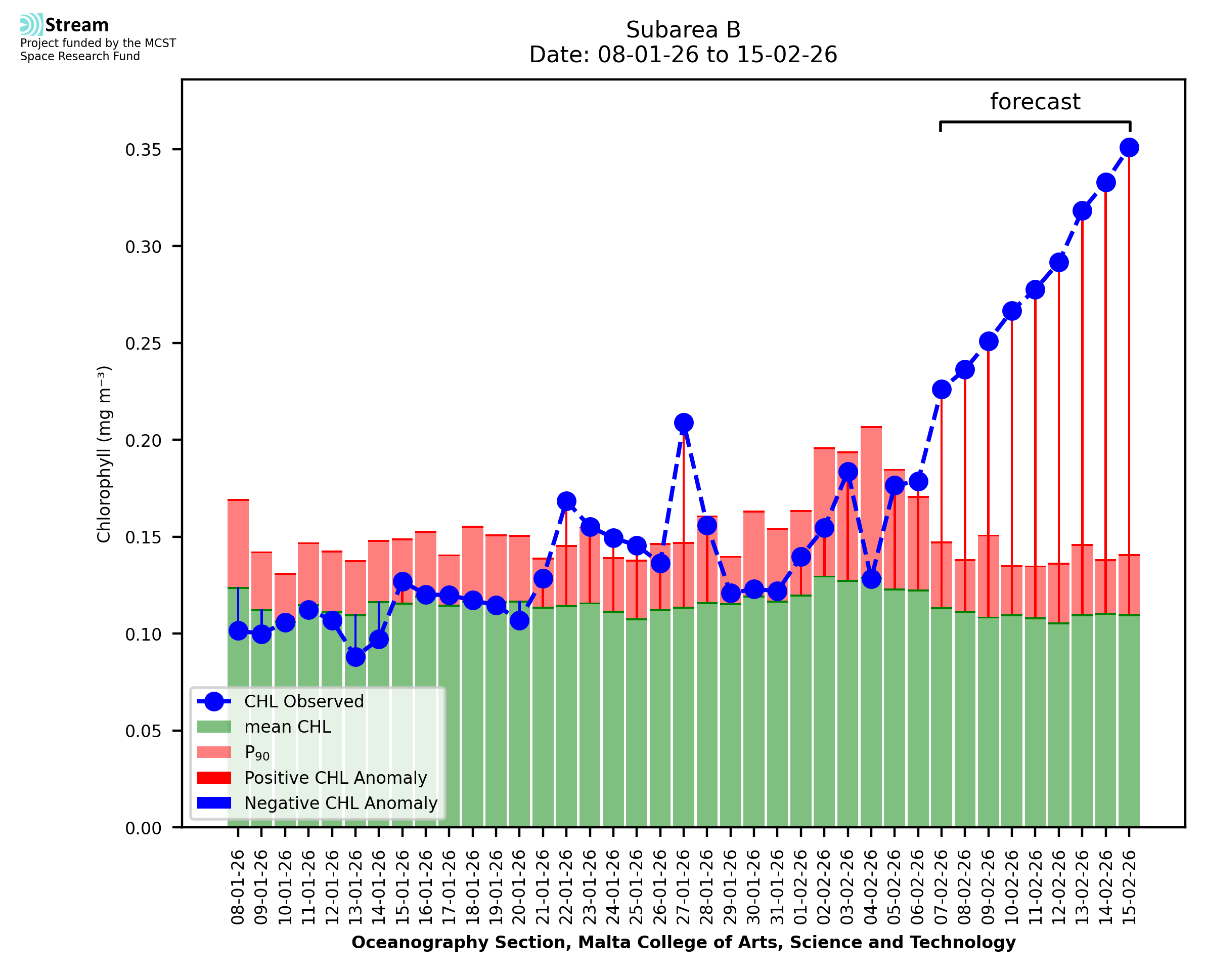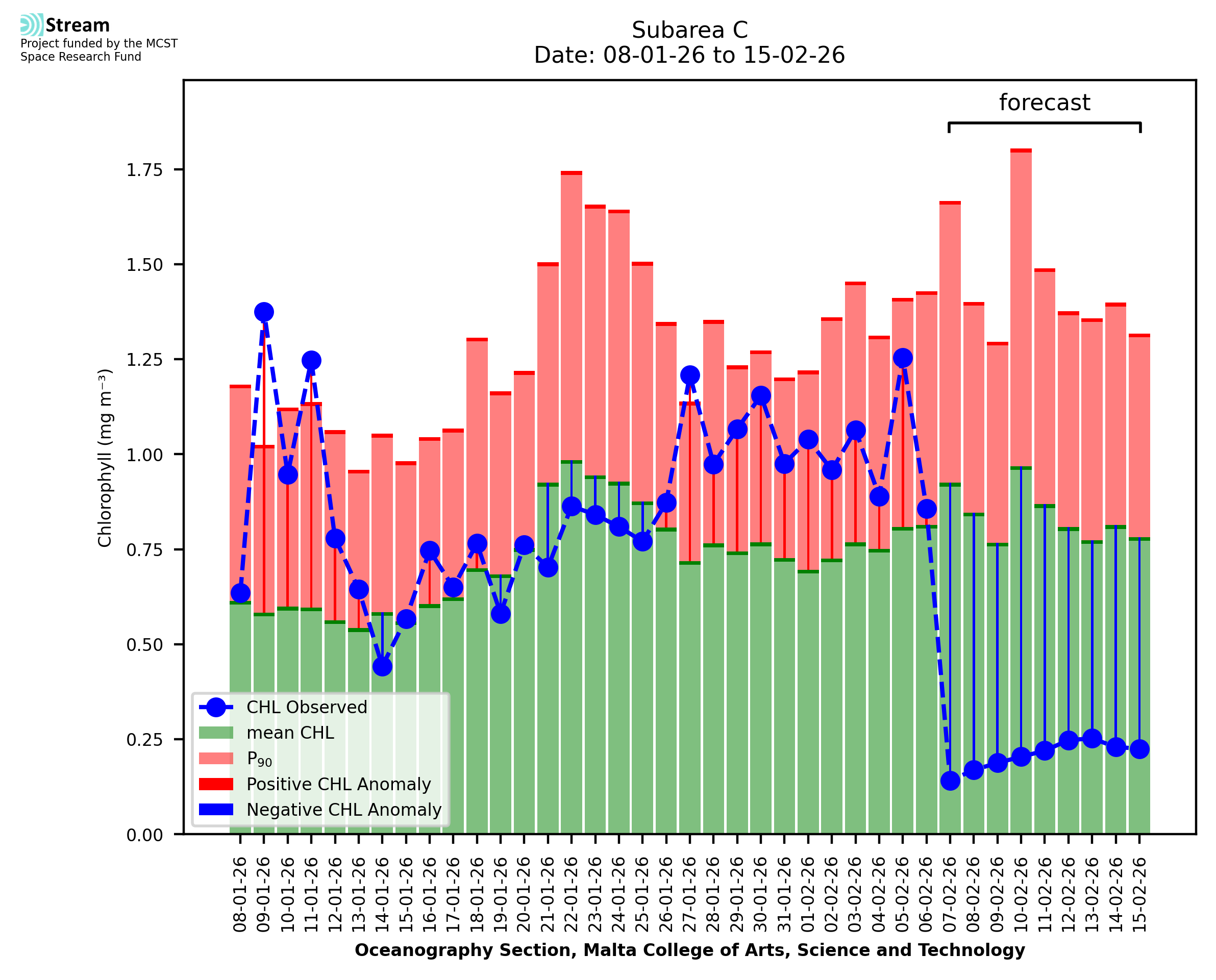 This STREAM service provides daily analysis of mass concentration of chlorophyll-a (CHL) anomalies, including spatial index maps for high chlorophyll occurrence and intensity in the Malta shelf area. User specific requests for data access and visualisation are planned for delivery on the STREAM mobile app. CHL is a core parameter in the Marine Strategy Framework Directive which provides the common framework for the assessment of the state of health of coastal seas to ensure coherence with the set goals of productive, healthy and clean European seas. CHL is considered to be a proxy of phythoplankton biomass and hence for eutrophication. Measuring chlorophyll is an indication of how much primary production is occurring in the sea.