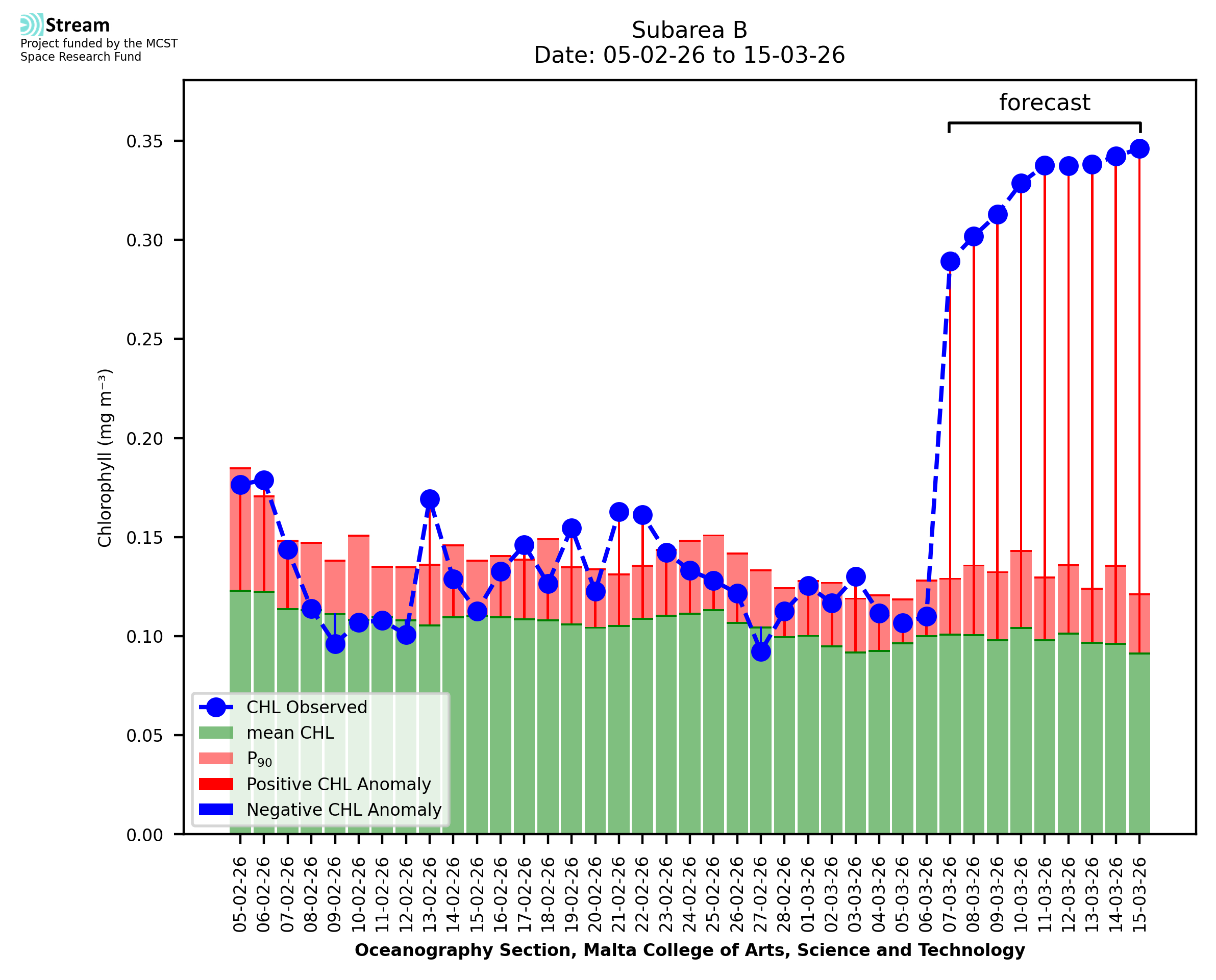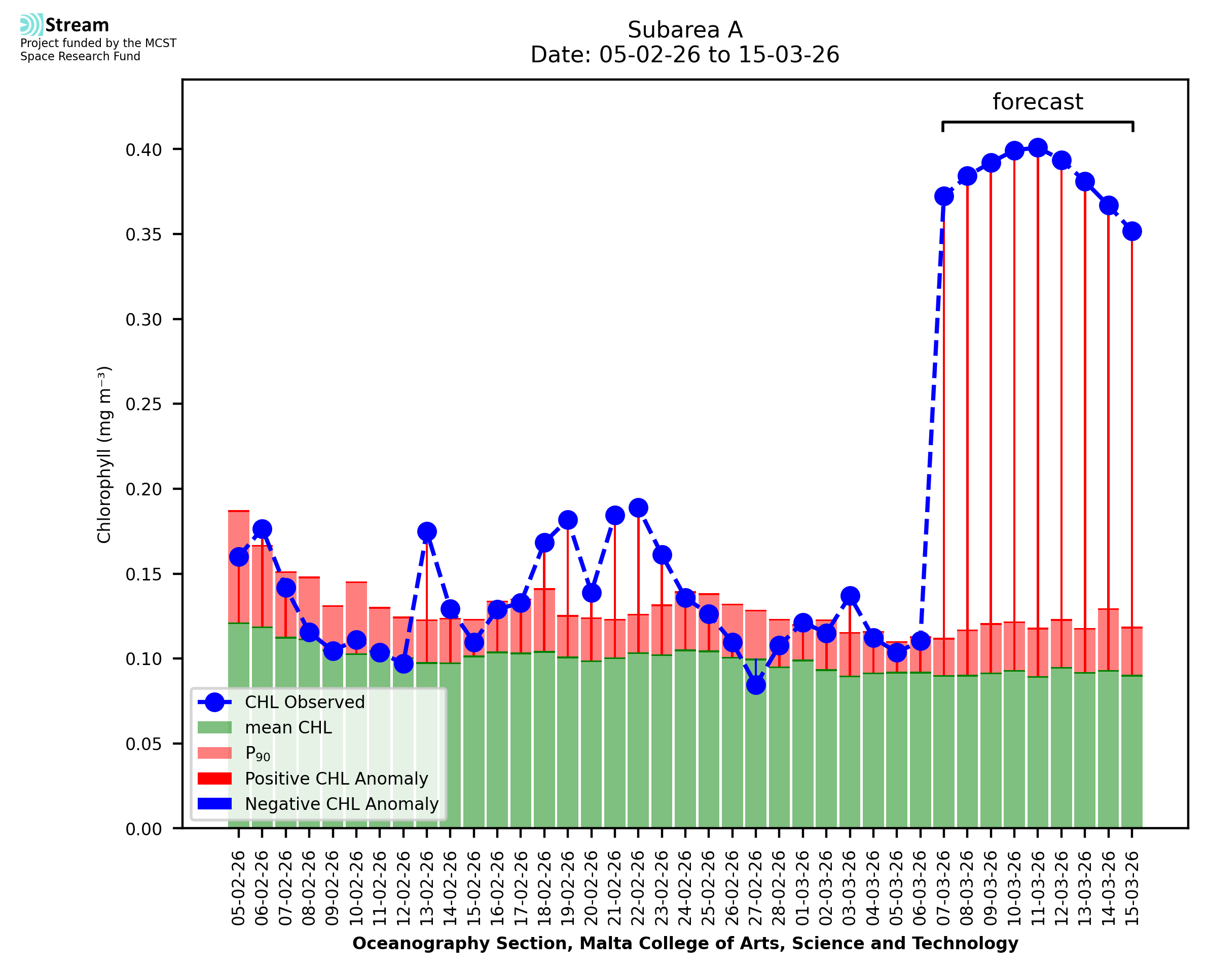 This STREAM service provides daily analysis of mass concentration of chlorophyll-a (CHL) anomalies, including spatial index maps for high chlorophyll occurrence and intensity in the Malta shelf area. User specific requests for data access and visualisation are planned for delivery on the STREAM mobile app. CHL is a core parameter in the Marine Strategy Framework Directive which provides the common framework for the assessment of the state of health of coastal seas to ensure coherence with the set goals of productive, healthy and clean European seas. CHL is considered to be a proxy of phythoplankton biomass and hence for eutrophication. Measuring chlorophyll is an indication of how much primary production is occurring in the sea.