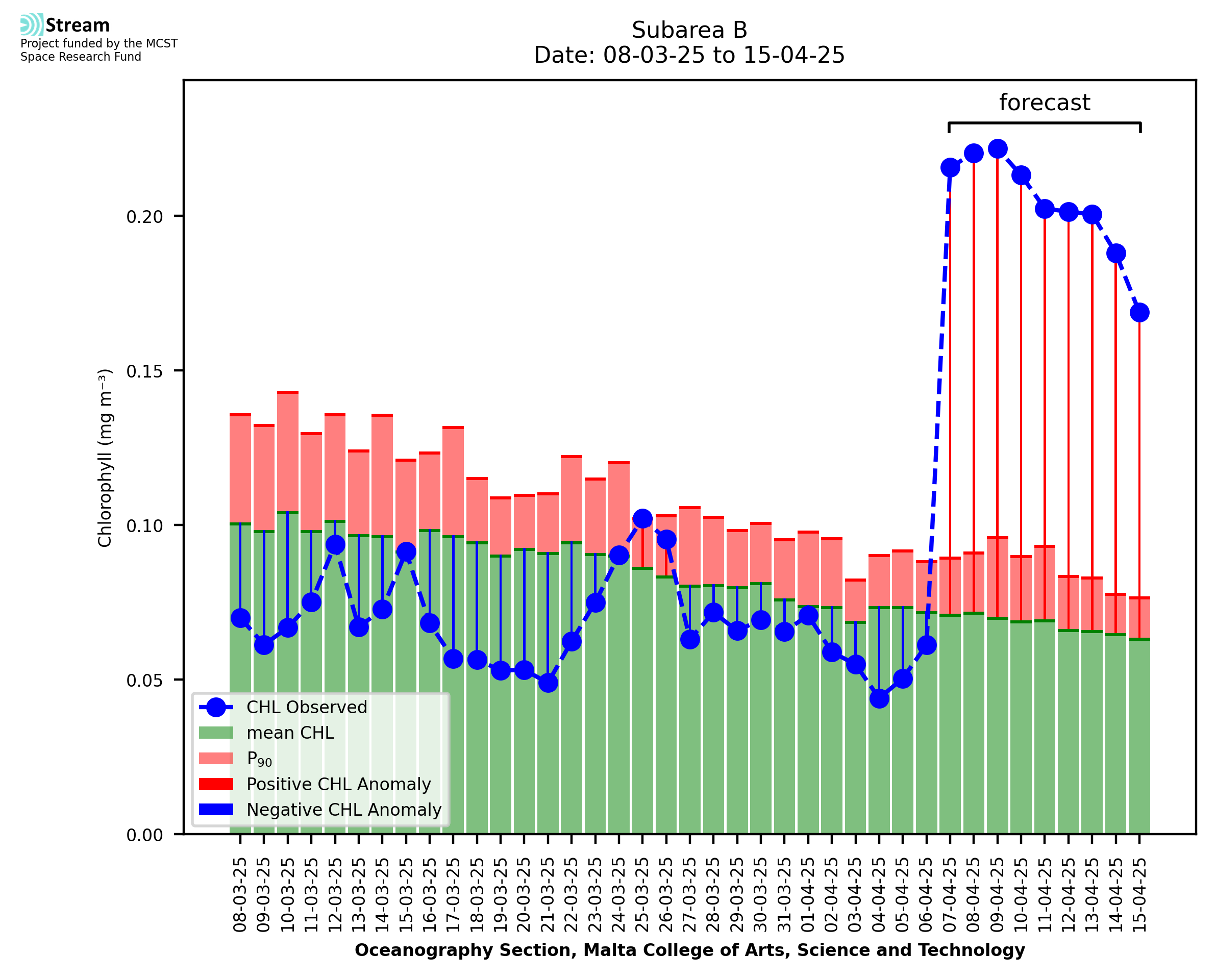 This STREAM service provides daily analysis of mass concentration of chlorophyll-a (CHL) anomalies, including spatial index maps for high chlorophyll occurrence and intensity in the Malta shelf area. User specific requests for data access and visualisation are planned for delivery on the STREAM mobile app. CHL is a core parameter in the Marine Strategy Framework Directive which provides the common framework for the assessment of the state of health of coastal seas to ensure coherence with the set goals of productive, healthy and clean European seas. CHL is considered to be a proxy of phythoplankton biomass and hence for eutrophication. Measuring chlorophyll is an indication of how much primary production is occurring in the sea.