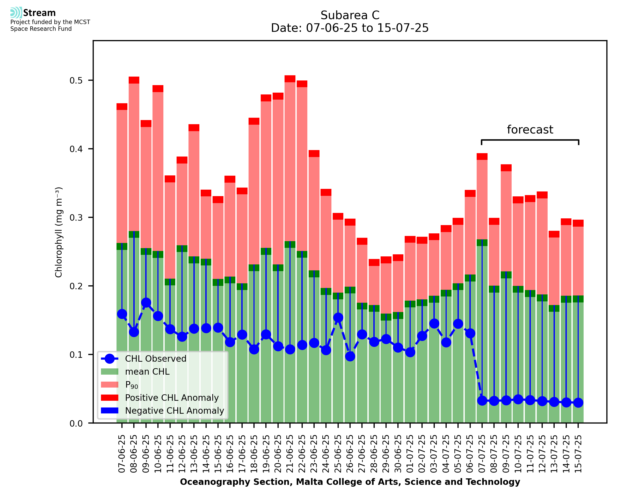 This STREAM service provides daily analysis of mass concentration of chlorophyll-a (CHL) anomalies, including spatial index maps for high chlorophyll occurrence and intensity in the Malta shelf area. User specific requests for data access and visualisation are planned for delivery on the STREAM mobile app. CHL is a core parameter in the Marine Strategy Framework Directive which provides the common framework for the assessment of the state of health of coastal seas to ensure coherence with the set goals of productive, healthy and clean European seas. CHL is considered to be a proxy of phythoplankton biomass and hence for eutrophication. Measuring chlorophyll is an indication of how much primary production is occurring in the sea.