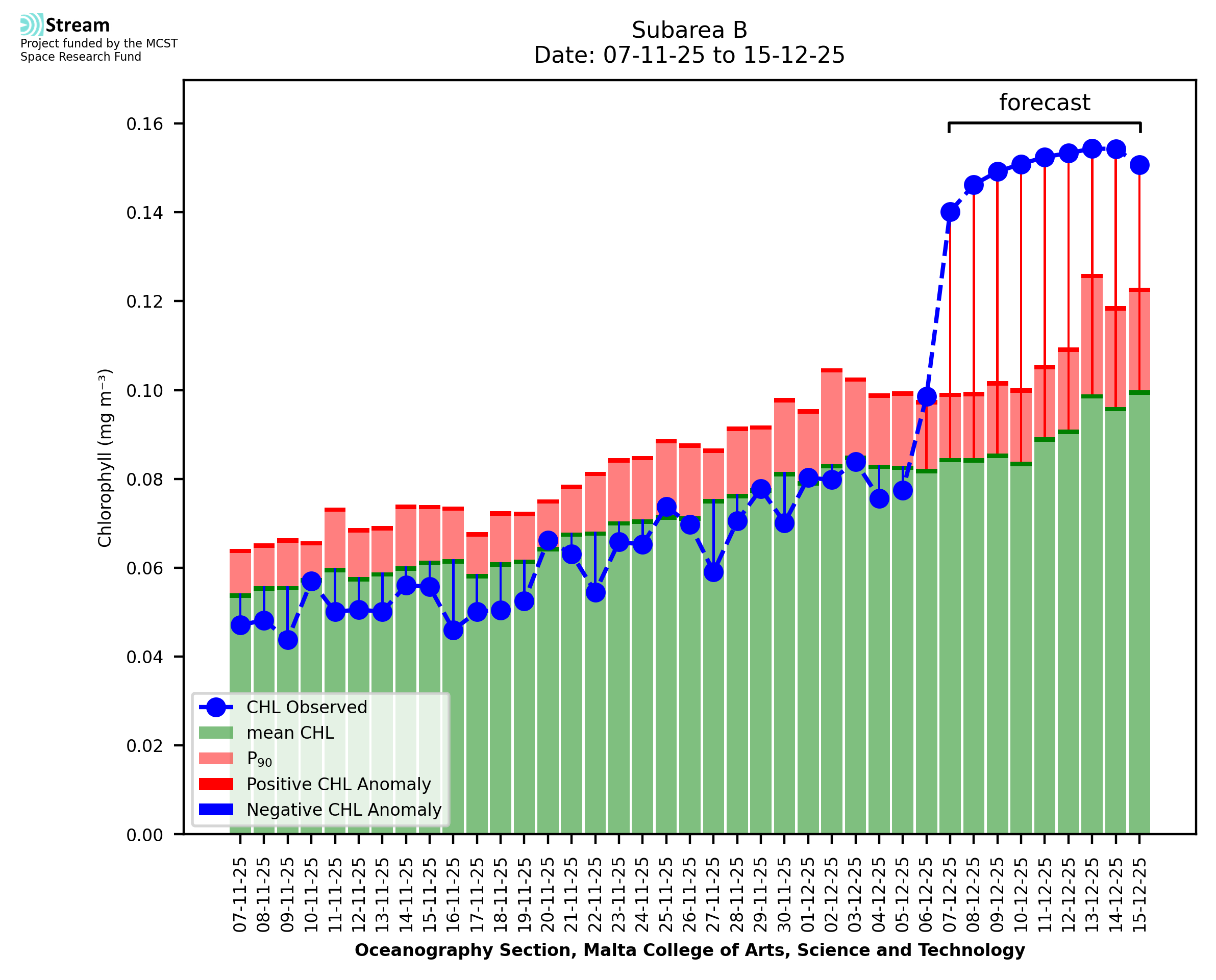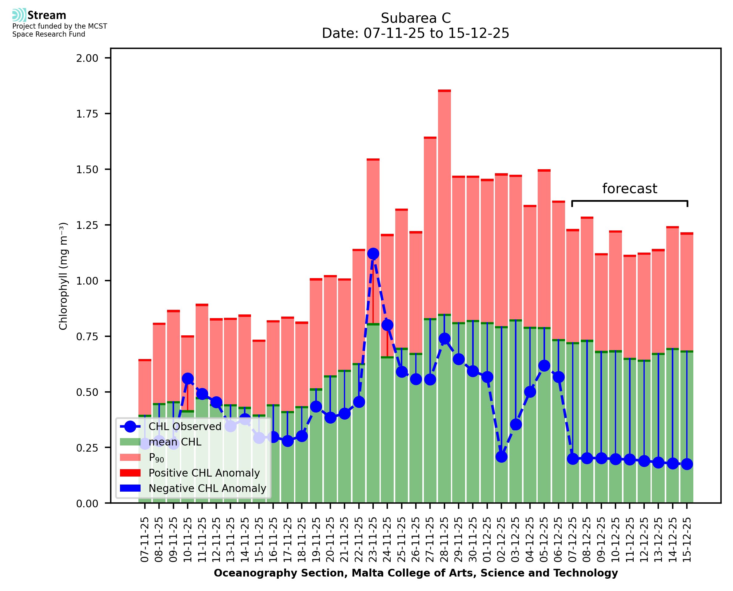 This STREAM service provides daily analysis of mass concentration of chlorophyll-a (CHL) anomalies, including spatial index maps for high chlorophyll occurrence and intensity in the Malta shelf area. User specific requests for data access and visualisation are planned for delivery on the STREAM mobile app. CHL is a core parameter in the Marine Strategy Framework Directive which provides the common framework for the assessment of the state of health of coastal seas to ensure coherence with the set goals of productive, healthy and clean European seas. CHL is considered to be a proxy of phythoplankton biomass and hence for eutrophication. Measuring chlorophyll is an indication of how much primary production is occurring in the sea.