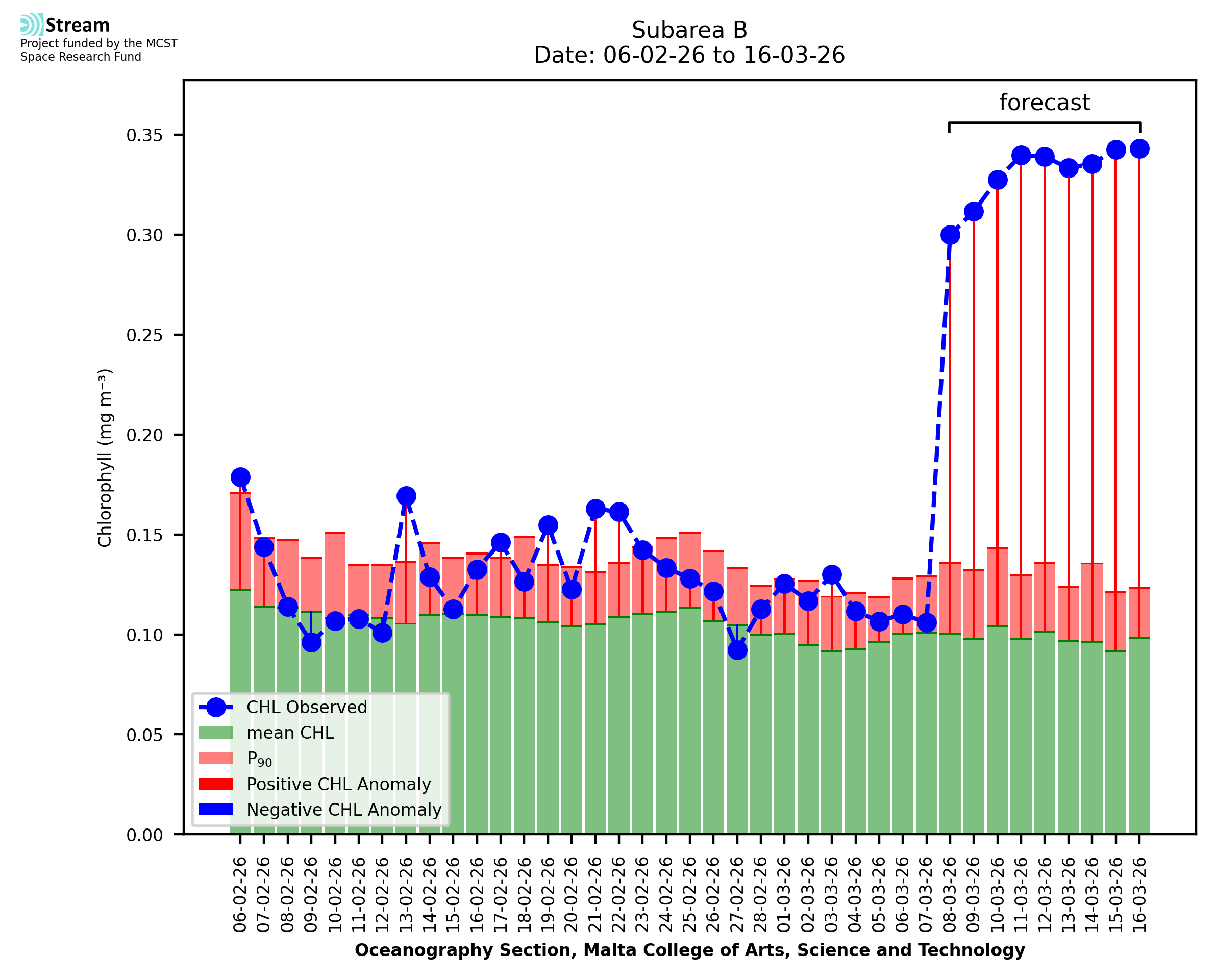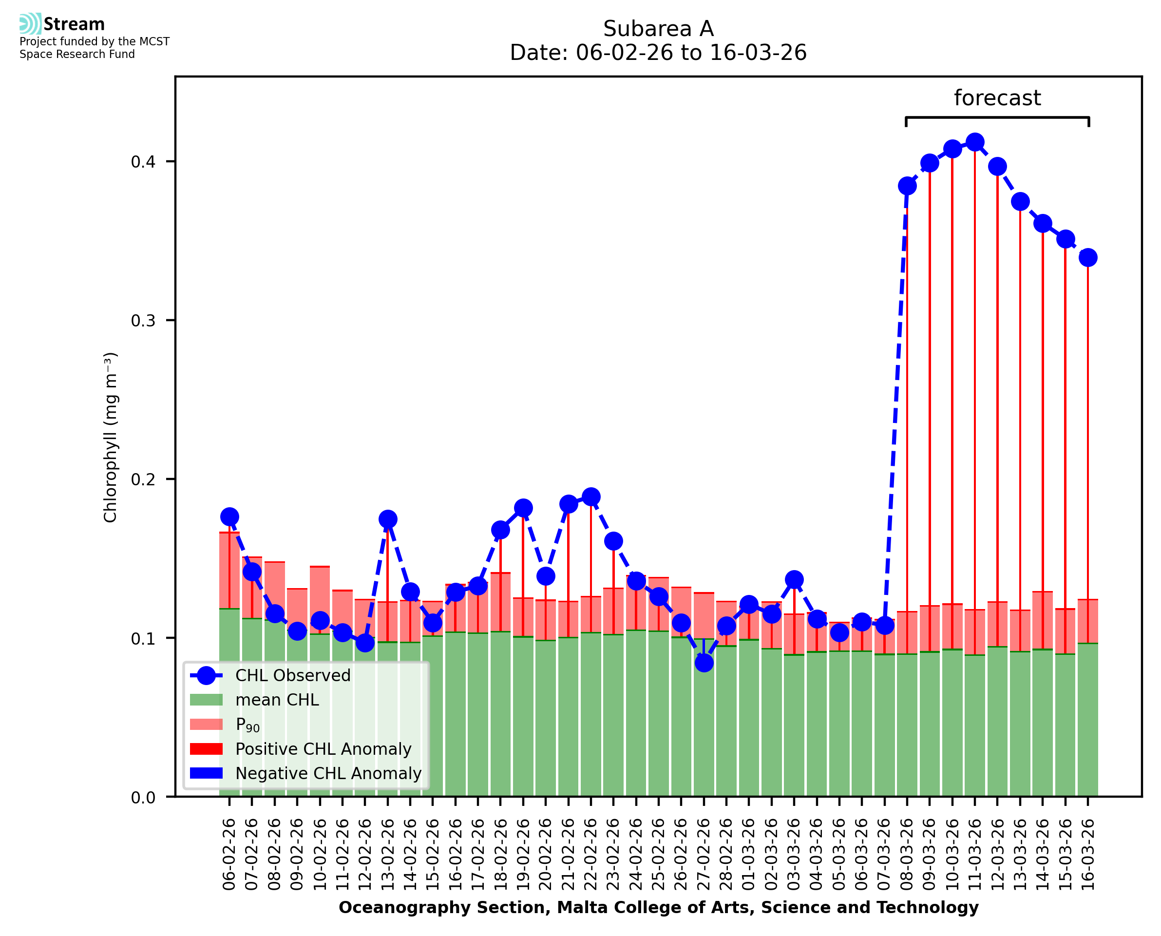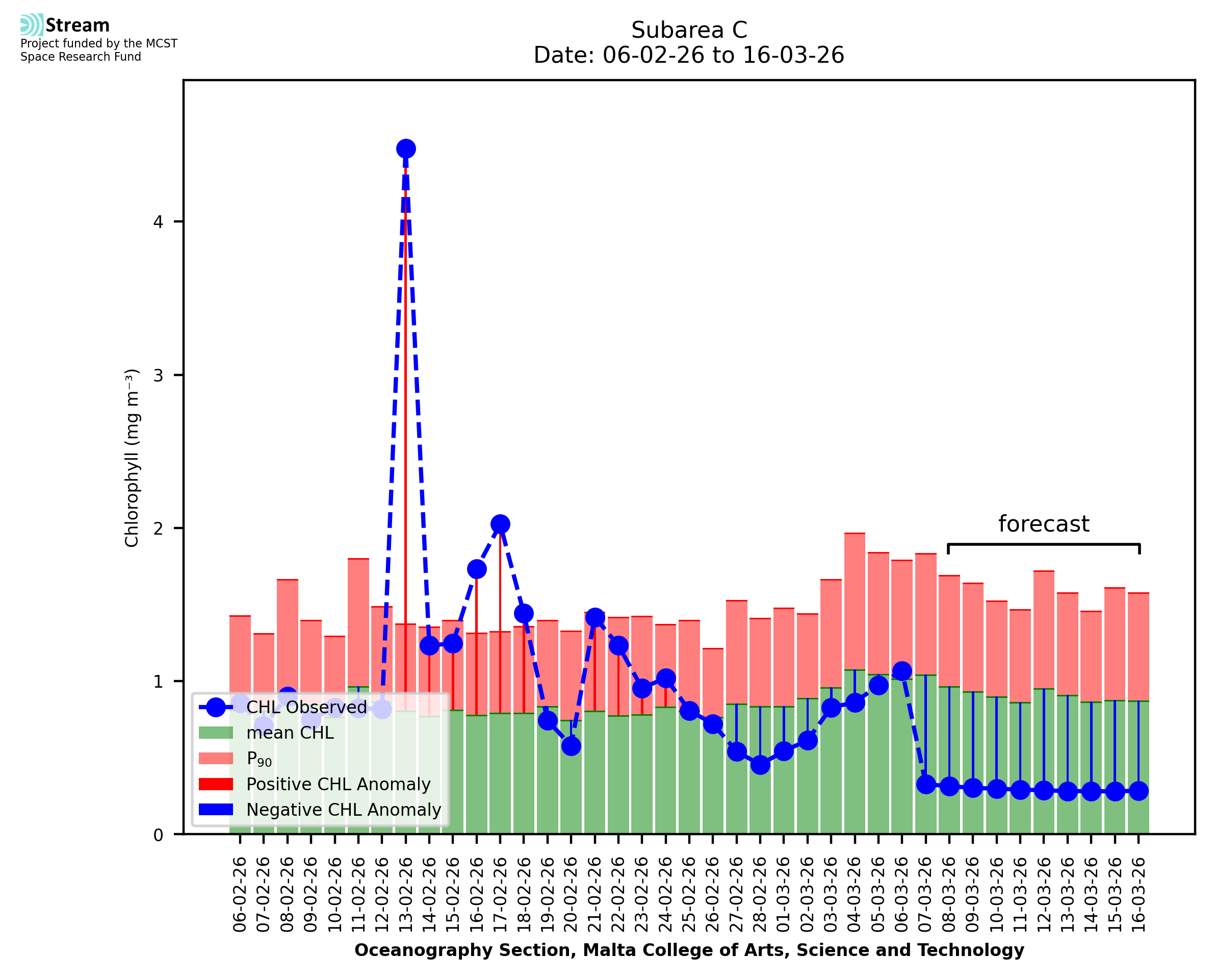 This STREAM service provides daily analysis of mass concentration of chlorophyll-a (CHL) anomalies, including spatial index maps for high chlorophyll occurrence and intensity in the Malta shelf area. User specific requests for data access and visualisation are planned for delivery on the STREAM mobile app. CHL is a core parameter in the Marine Strategy Framework Directive which provides the common framework for the assessment of the state of health of coastal seas to ensure coherence with the set goals of productive, healthy and clean European seas. CHL is considered to be a proxy of phythoplankton biomass and hence for eutrophication. Measuring chlorophyll is an indication of how much primary production is occurring in the sea.
