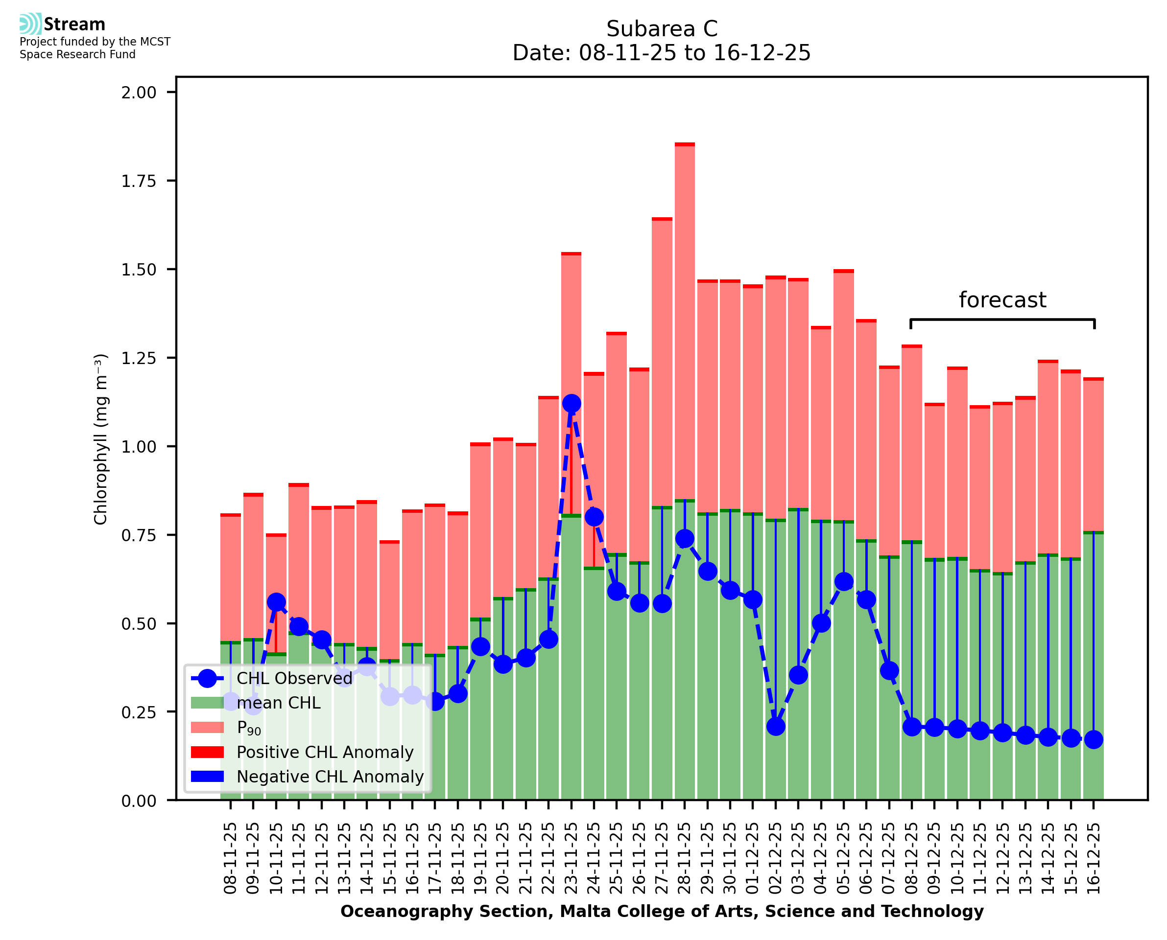 This STREAM service provides daily analysis of mass concentration of chlorophyll-a (CHL) anomalies, including spatial index maps for high chlorophyll occurrence and intensity in the Malta shelf area. User specific requests for data access and visualisation are planned for delivery on the STREAM mobile app. CHL is a core parameter in the Marine Strategy Framework Directive which provides the common framework for the assessment of the state of health of coastal seas to ensure coherence with the set goals of productive, healthy and clean European seas. CHL is considered to be a proxy of phythoplankton biomass and hence for eutrophication. Measuring chlorophyll is an indication of how much primary production is occurring in the sea.