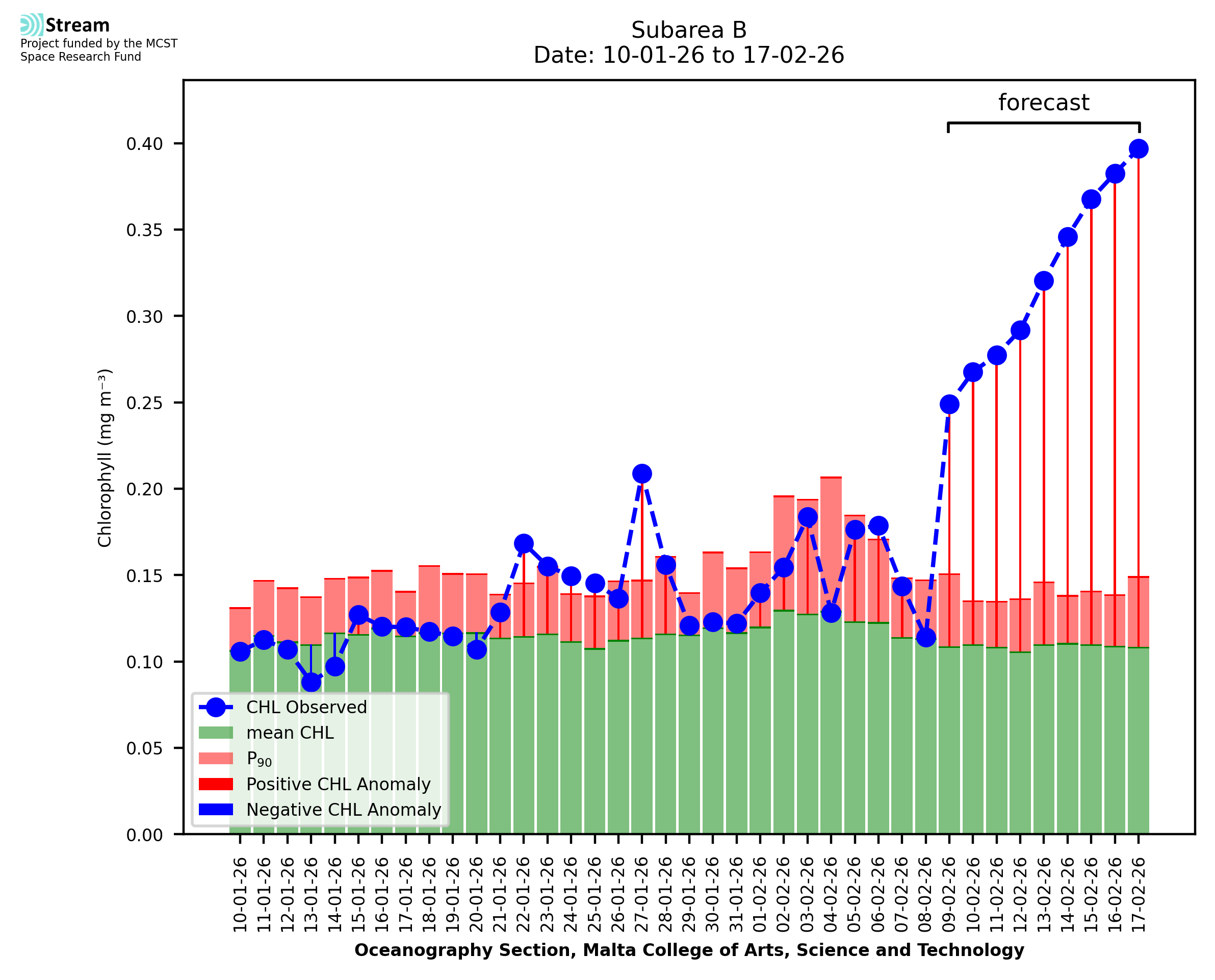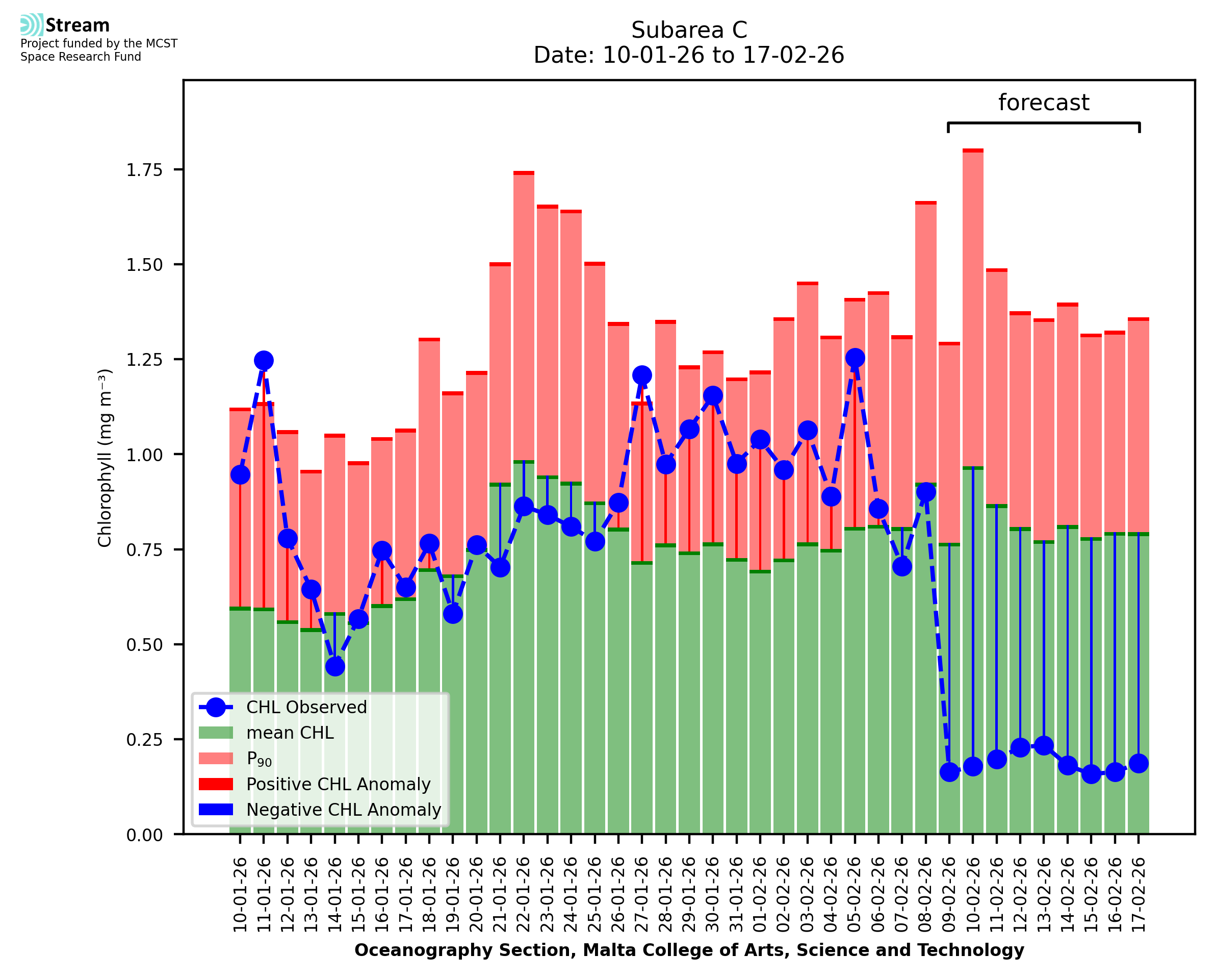 This STREAM service provides daily analysis of mass concentration of chlorophyll-a (CHL) anomalies, including spatial index maps for high chlorophyll occurrence and intensity in the Malta shelf area. User specific requests for data access and visualisation are planned for delivery on the STREAM mobile app. CHL is a core parameter in the Marine Strategy Framework Directive which provides the common framework for the assessment of the state of health of coastal seas to ensure coherence with the set goals of productive, healthy and clean European seas. CHL is considered to be a proxy of phythoplankton biomass and hence for eutrophication. Measuring chlorophyll is an indication of how much primary production is occurring in the sea.