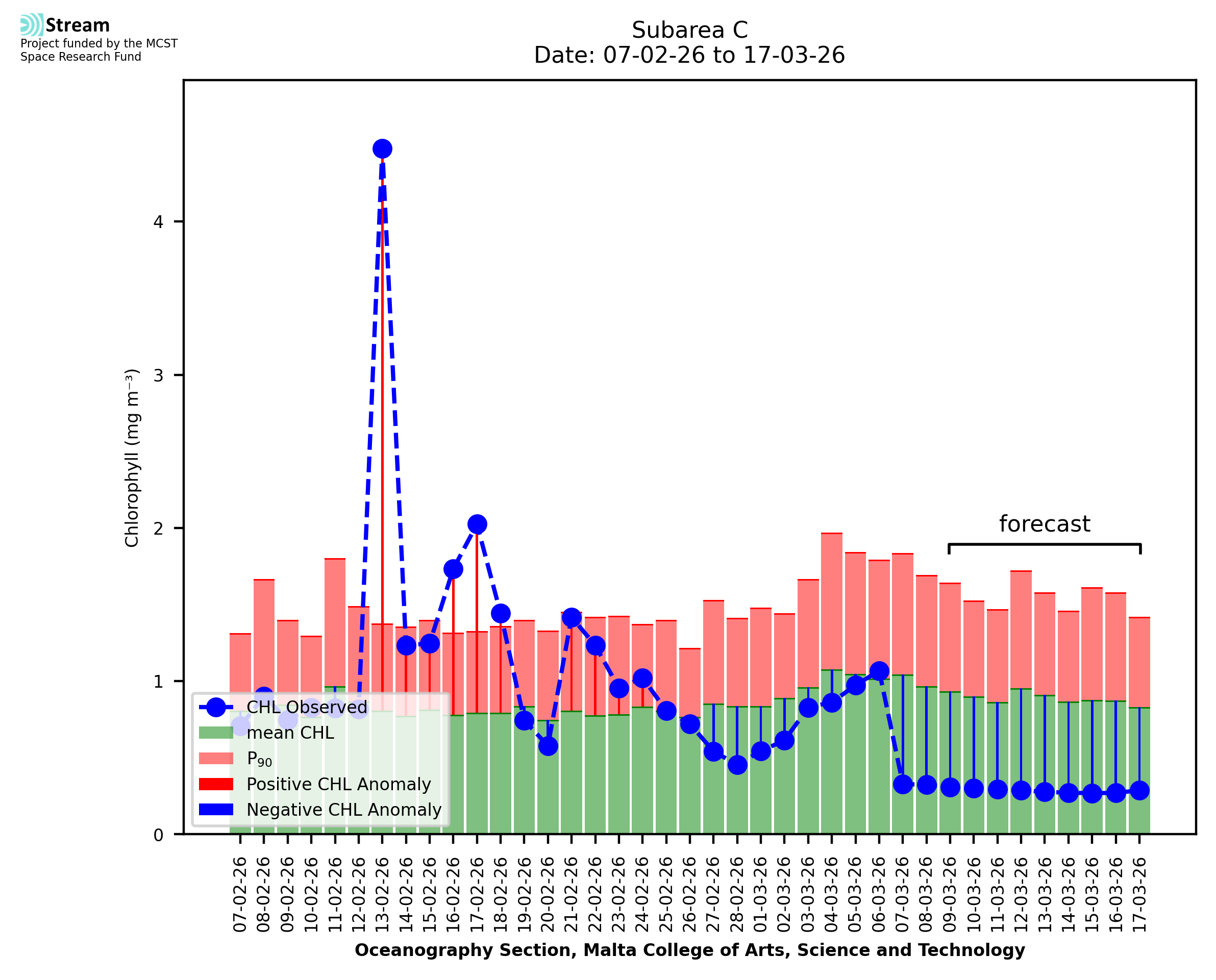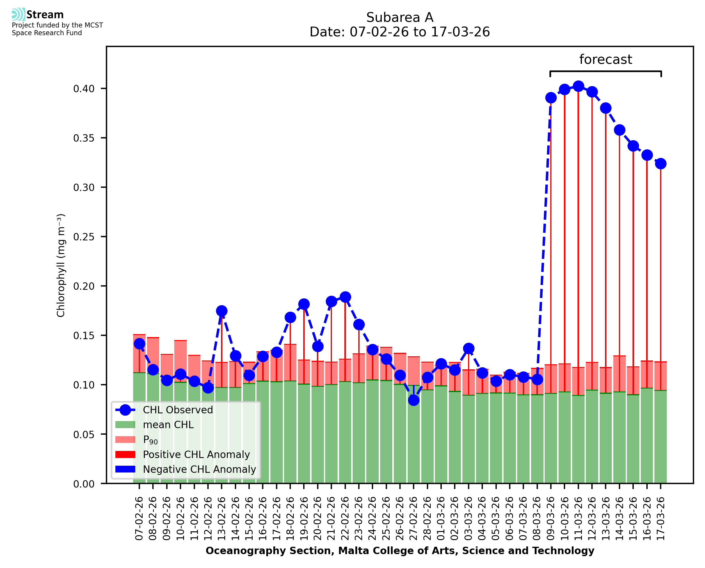 This STREAM service provides daily analysis of mass concentration of chlorophyll-a (CHL) anomalies, including spatial index maps for high chlorophyll occurrence and intensity in the Malta shelf area. User specific requests for data access and visualisation are planned for delivery on the STREAM mobile app. CHL is a core parameter in the Marine Strategy Framework Directive which provides the common framework for the assessment of the state of health of coastal seas to ensure coherence with the set goals of productive, healthy and clean European seas. CHL is considered to be a proxy of phythoplankton biomass and hence for eutrophication. Measuring chlorophyll is an indication of how much primary production is occurring in the sea.