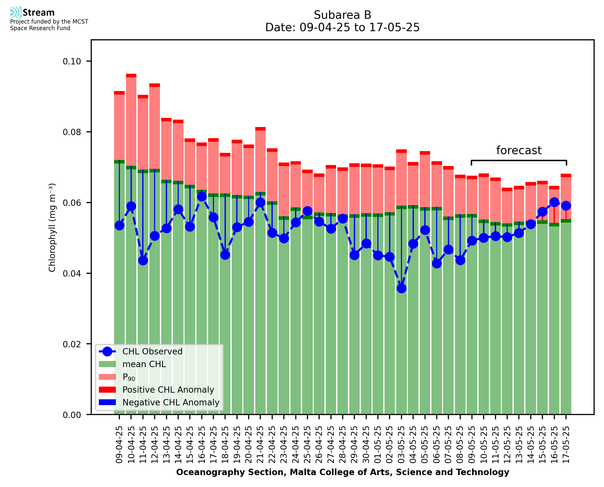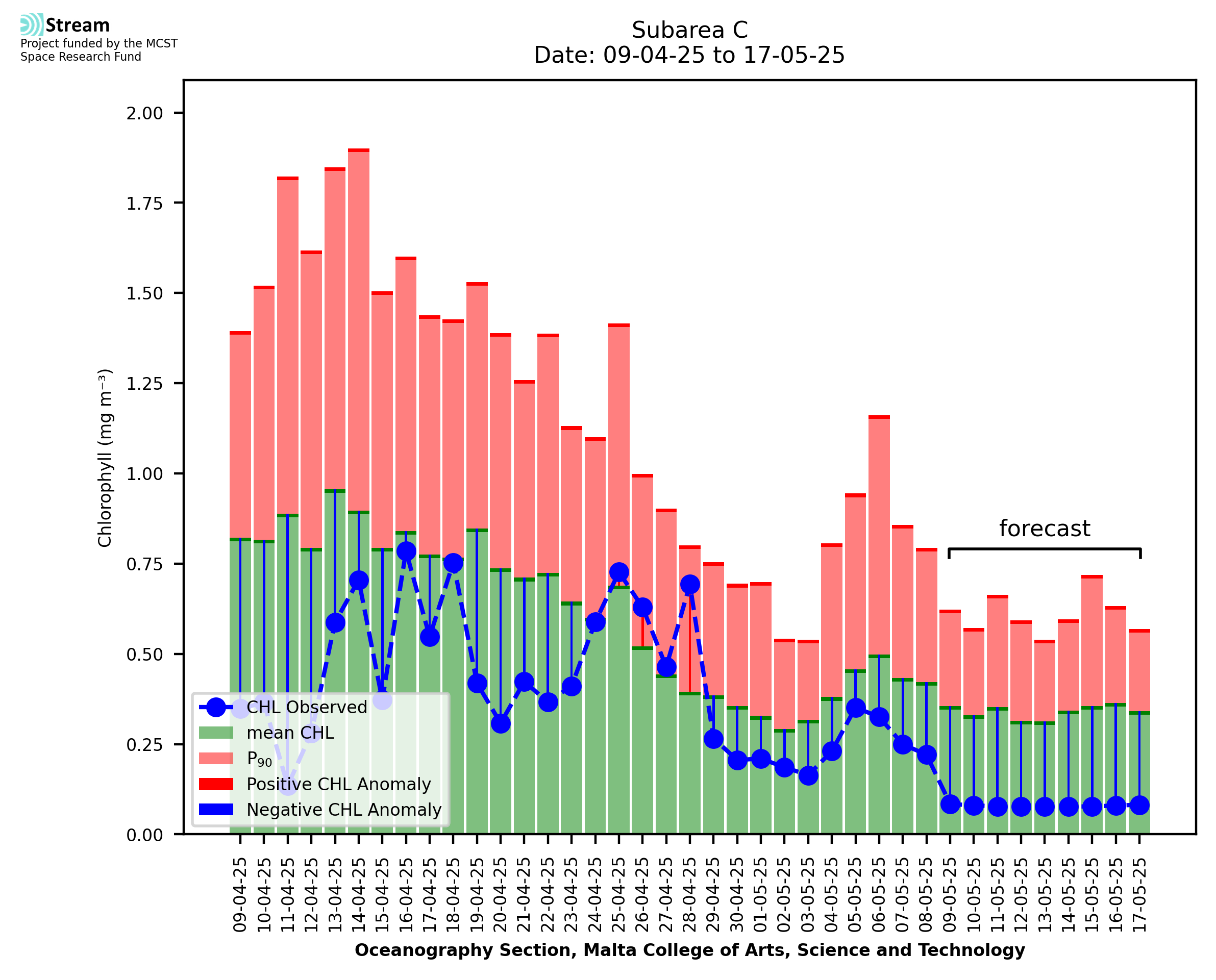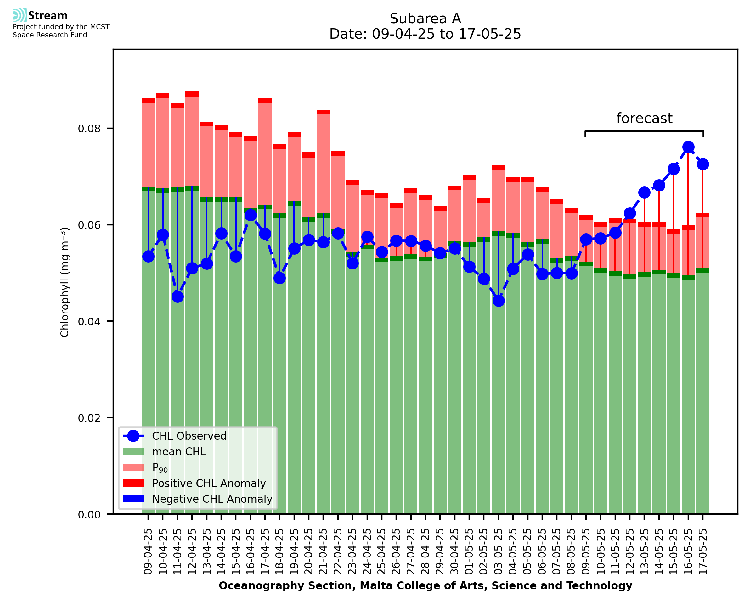 This STREAM service provides daily analysis of mass concentration of chlorophyll-a (CHL) anomalies, including spatial index maps for high chlorophyll occurrence and intensity in the Malta shelf area. User specific requests for data access and visualisation are planned for delivery on the STREAM mobile app. CHL is a core parameter in the Marine Strategy Framework Directive which provides the common framework for the assessment of the state of health of coastal seas to ensure coherence with the set goals of productive, healthy and clean European seas. CHL is considered to be a proxy of phythoplankton biomass and hence for eutrophication. Measuring chlorophyll is an indication of how much primary production is occurring in the sea.