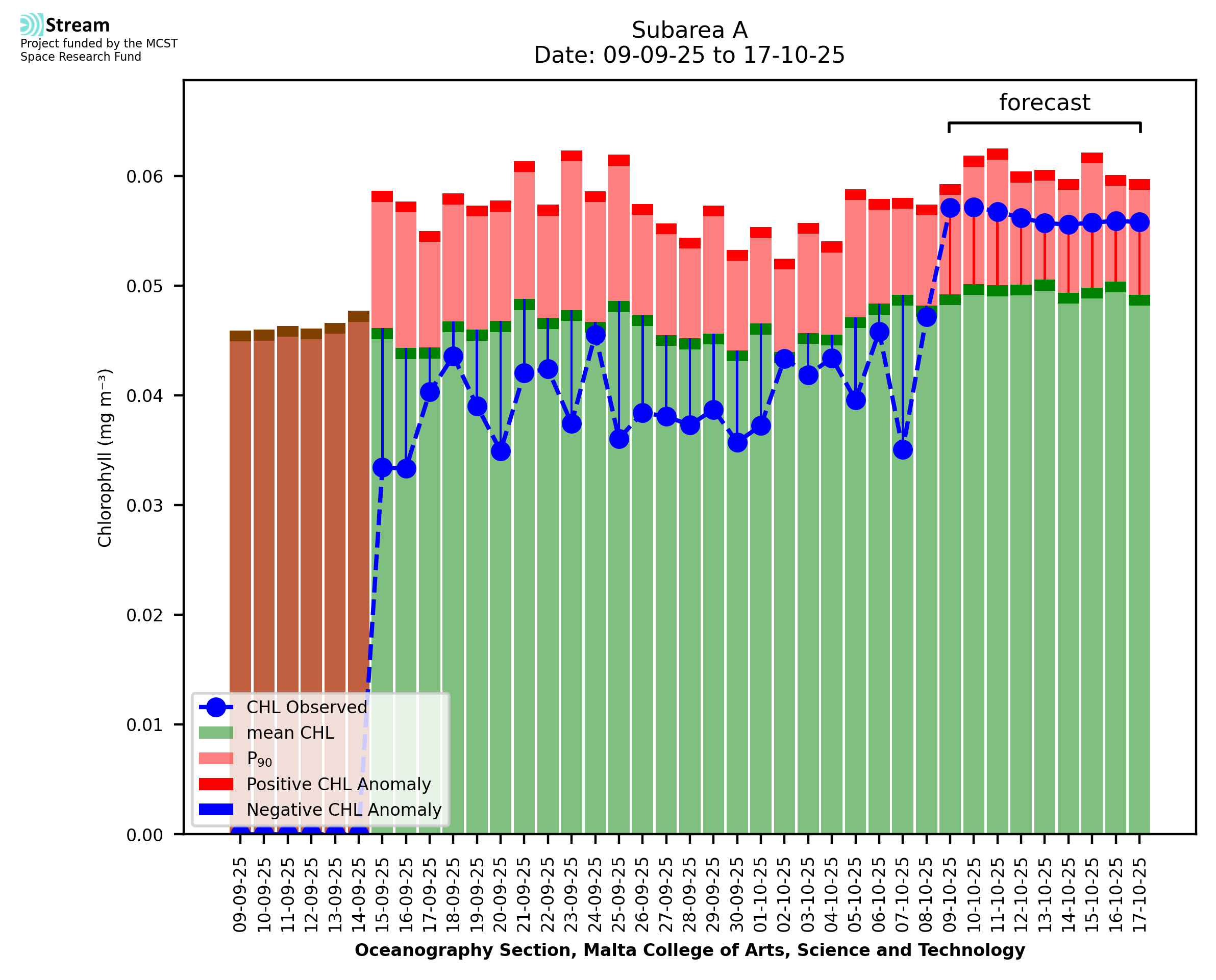 This STREAM service provides daily analysis of mass concentration of chlorophyll-a (CHL) anomalies, including spatial index maps for high chlorophyll occurrence and intensity in the Malta shelf area. User specific requests for data access and visualisation are planned for delivery on the STREAM mobile app. CHL is a core parameter in the Marine Strategy Framework Directive which provides the common framework for the assessment of the state of health of coastal seas to ensure coherence with the set goals of productive, healthy and clean European seas. CHL is considered to be a proxy of phythoplankton biomass and hence for eutrophication. Measuring chlorophyll is an indication of how much primary production is occurring in the sea.