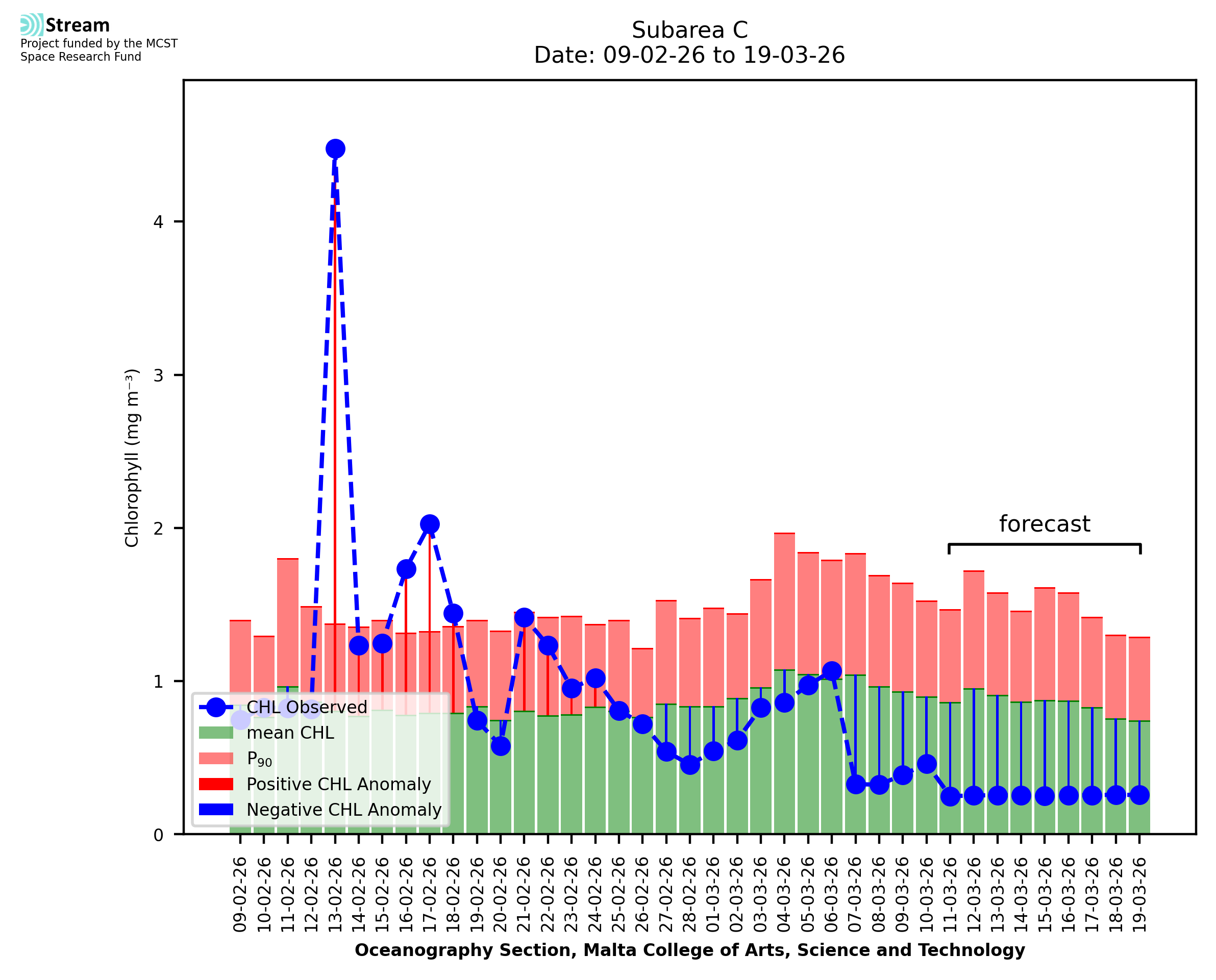This STREAM service provides daily analysis of mass concentration of chlorophyll-a (CHL) anomalies, including spatial index maps for high chlorophyll occurrence and intensity in the Malta shelf area. User specific requests for data access and visualisation are planned for delivery on the STREAM mobile app. CHL is a core parameter in the Marine Strategy Framework Directive which provides the common framework for the assessment of the state of health of coastal seas to ensure coherence with the set goals of productive, healthy and clean European seas. CHL is considered to be a proxy of phythoplankton biomass and hence for eutrophication. Measuring chlorophyll is an indication of how much primary production is occurring in the sea.