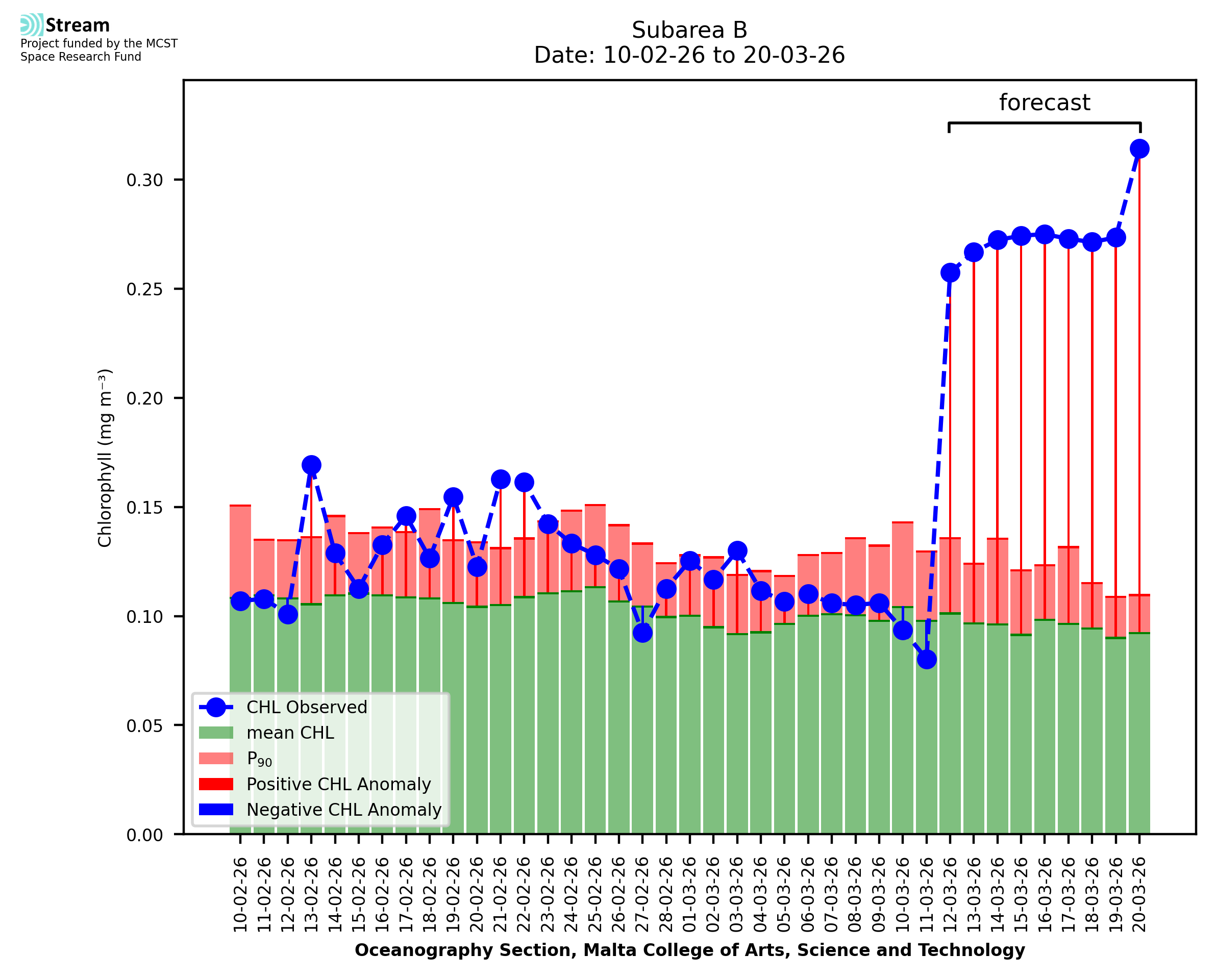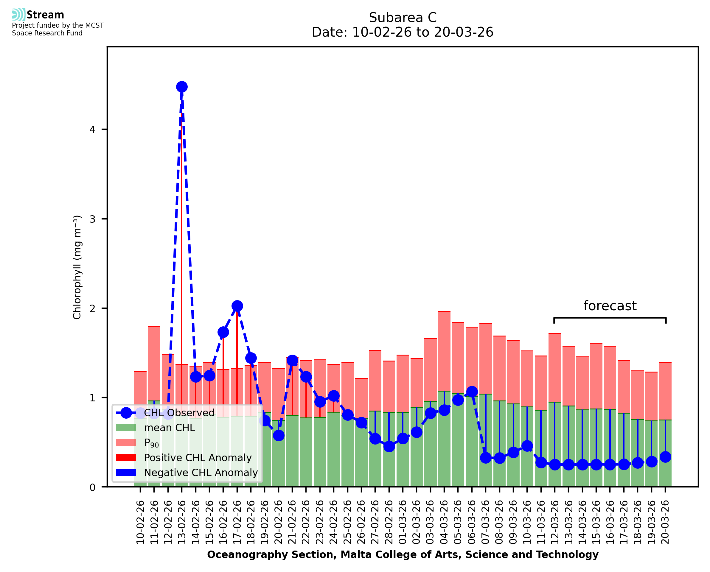 This STREAM service provides daily analysis of mass concentration of chlorophyll-a (CHL) anomalies, including spatial index maps for high chlorophyll occurrence and intensity in the Malta shelf area. User specific requests for data access and visualisation are planned for delivery on the STREAM mobile app. CHL is a core parameter in the Marine Strategy Framework Directive which provides the common framework for the assessment of the state of health of coastal seas to ensure coherence with the set goals of productive, healthy and clean European seas. CHL is considered to be a proxy of phythoplankton biomass and hence for eutrophication. Measuring chlorophyll is an indication of how much primary production is occurring in the sea.