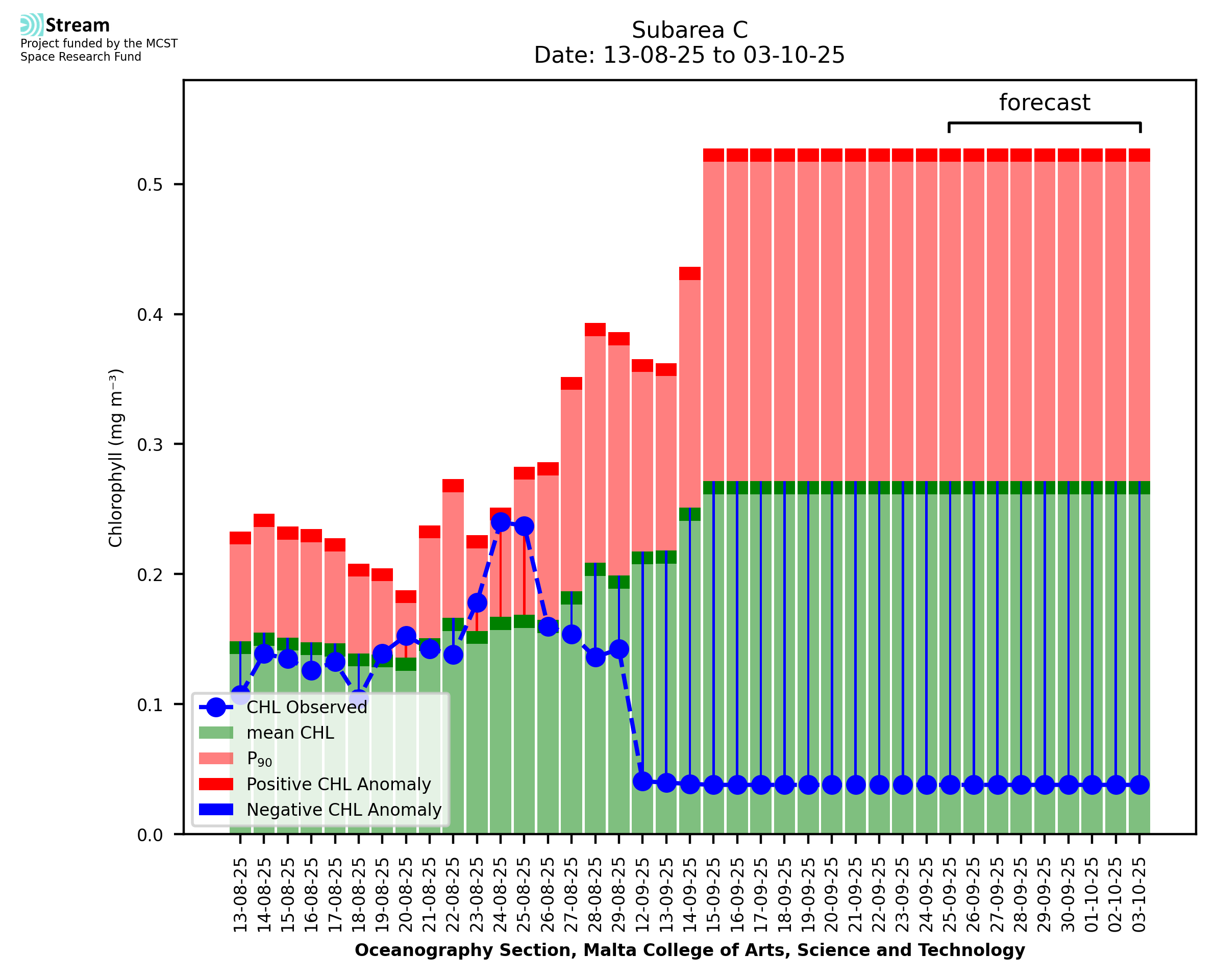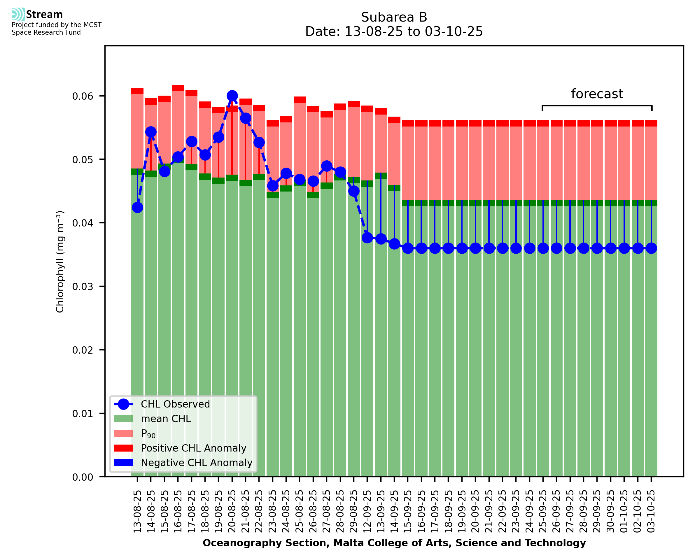 This STREAM service provides daily analysis of mass concentration of chlorophyll-a (CHL) anomalies, including spatial index maps for high chlorophyll occurrence and intensity in the Malta shelf area. User specific requests for data access and visualisation are planned for delivery on the STREAM mobile app. CHL is a core parameter in the Marine Strategy Framework Directive which provides the common framework for the assessment of the state of health of coastal seas to ensure coherence with the set goals of productive, healthy and clean European seas. CHL is considered to be a proxy of phythoplankton biomass and hence for eutrophication. Measuring chlorophyll is an indication of how much primary production is occurring in the sea.
