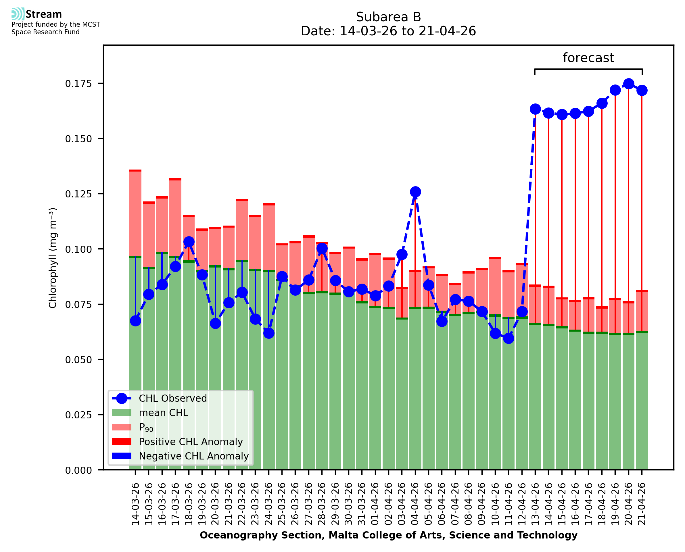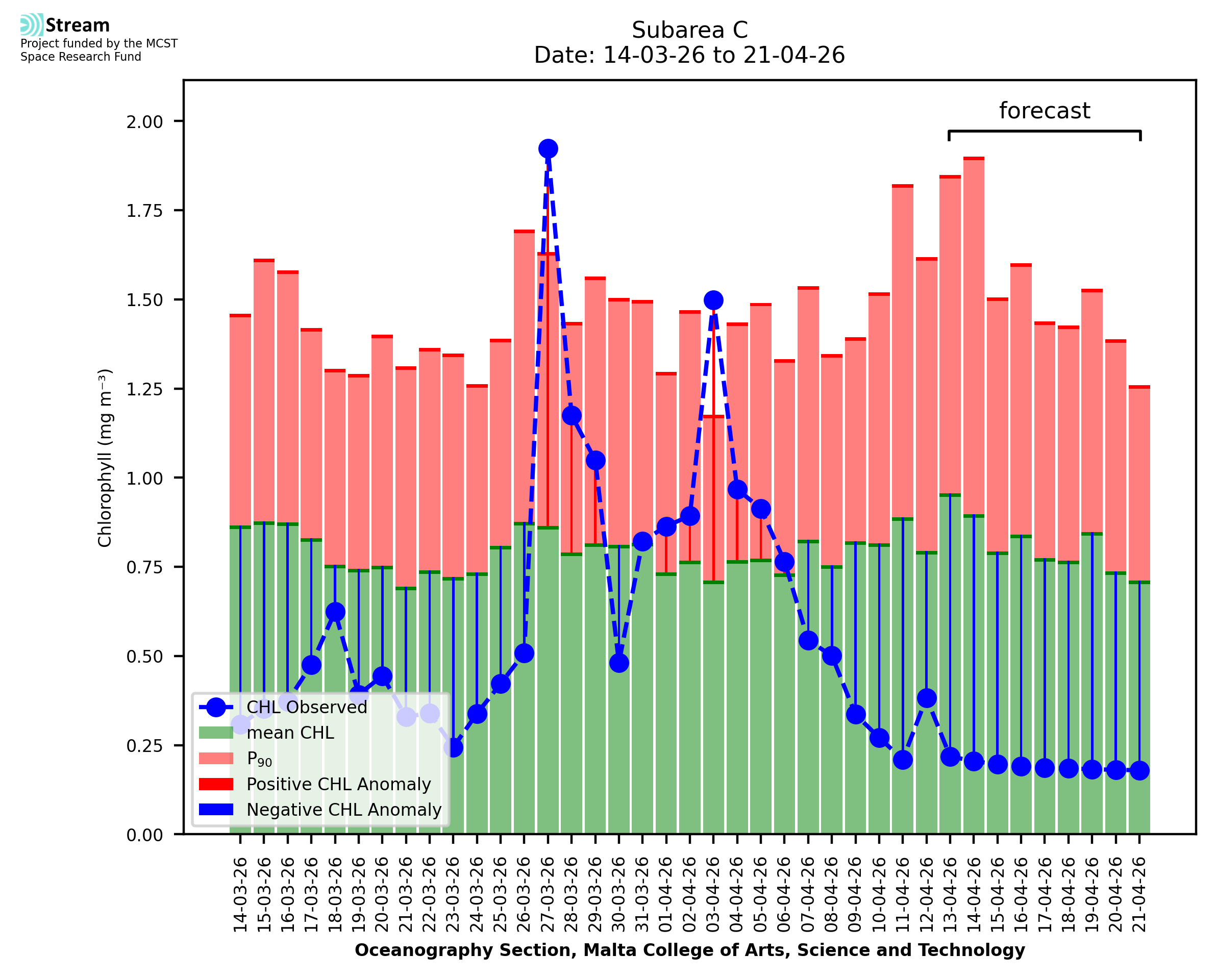 This STREAM service provides daily analysis of mass concentration of chlorophyll-a (CHL) anomalies, including spatial index maps for high chlorophyll occurrence and intensity in the Malta shelf area. User specific requests for data access and visualisation are planned for delivery on the STREAM mobile app. CHL is a core parameter in the Marine Strategy Framework Directive which provides the common framework for the assessment of the state of health of coastal seas to ensure coherence with the set goals of productive, healthy and clean European seas. CHL is considered to be a proxy of phythoplankton biomass and hence for eutrophication. Measuring chlorophyll is an indication of how much primary production is occurring in the sea.