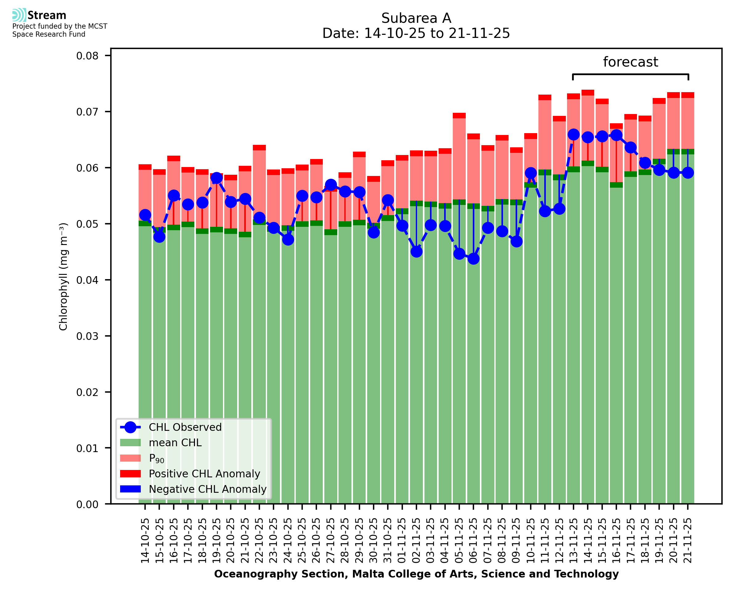 This STREAM service provides daily analysis of mass concentration of chlorophyll-a (CHL) anomalies, including spatial index maps for high chlorophyll occurrence and intensity in the Malta shelf area. User specific requests for data access and visualisation are planned for delivery on the STREAM mobile app. CHL is a core parameter in the Marine Strategy Framework Directive which provides the common framework for the assessment of the state of health of coastal seas to ensure coherence with the set goals of productive, healthy and clean European seas. CHL is considered to be a proxy of phythoplankton biomass and hence for eutrophication. Measuring chlorophyll is an indication of how much primary production is occurring in the sea.
