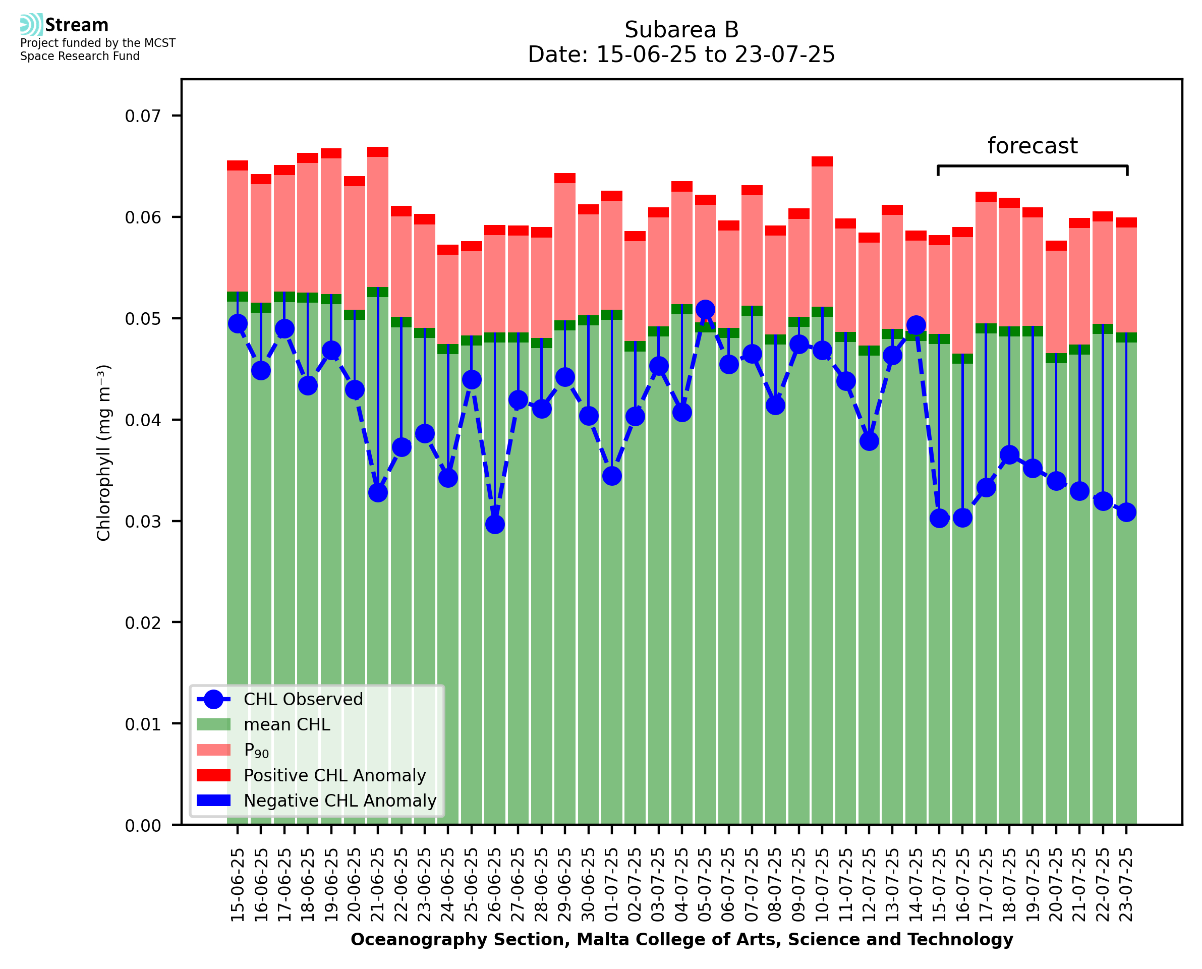 This STREAM service provides daily analysis of mass concentration of chlorophyll-a (CHL) anomalies, including spatial index maps for high chlorophyll occurrence and intensity in the Malta shelf area. User specific requests for data access and visualisation are planned for delivery on the STREAM mobile app. CHL is a core parameter in the Marine Strategy Framework Directive which provides the common framework for the assessment of the state of health of coastal seas to ensure coherence with the set goals of productive, healthy and clean European seas. CHL is considered to be a proxy of phythoplankton biomass and hence for eutrophication. Measuring chlorophyll is an indication of how much primary production is occurring in the sea.