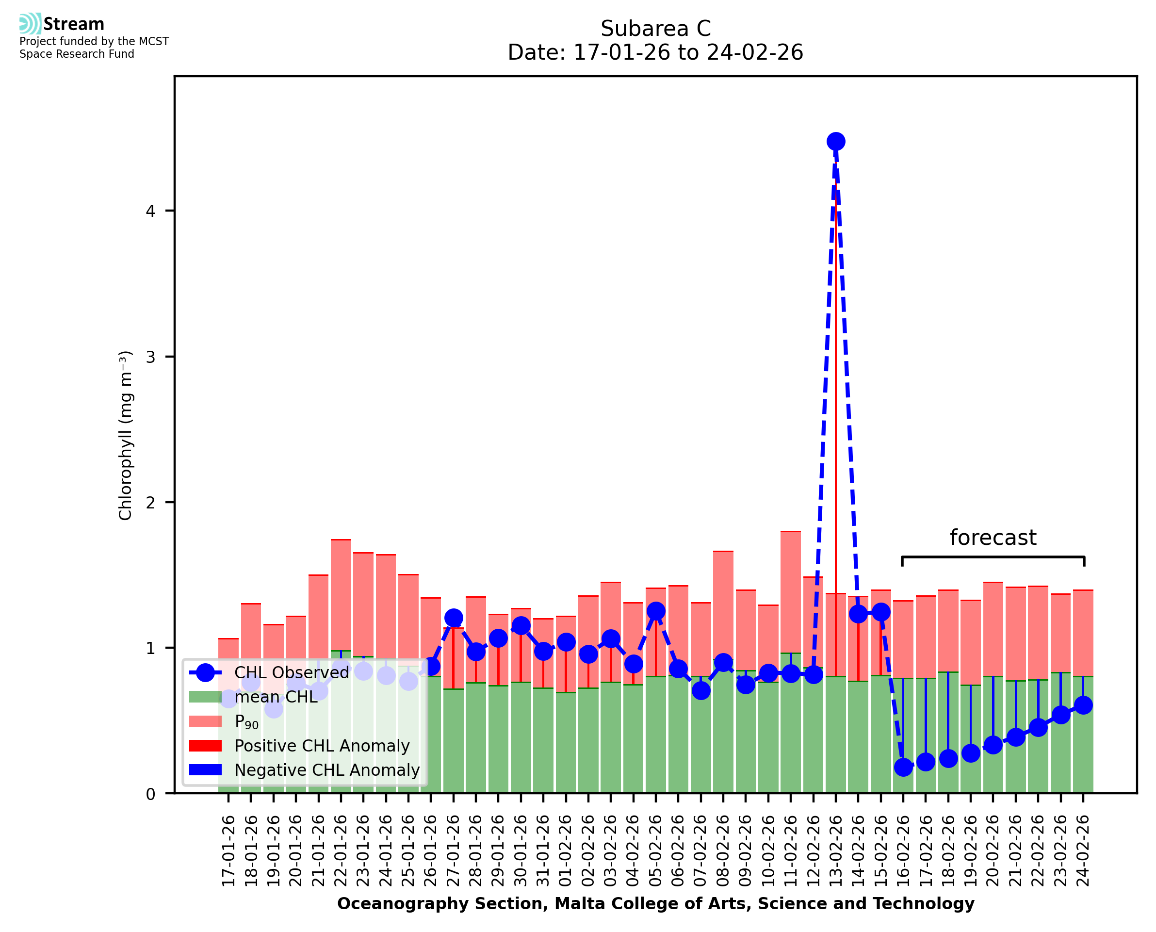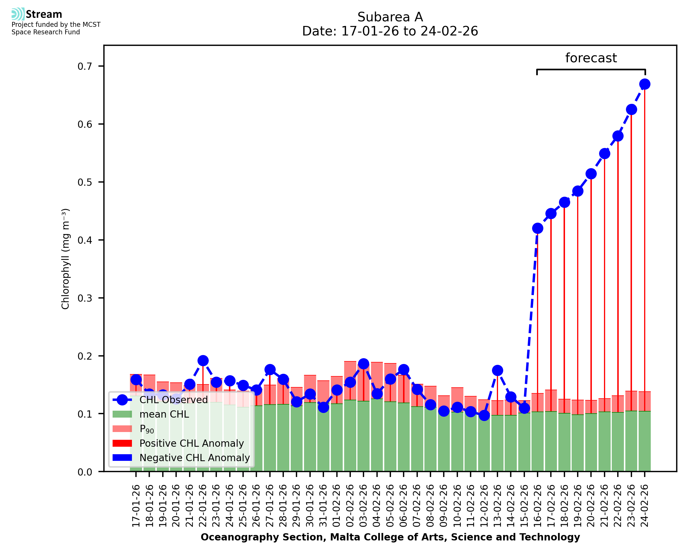 This STREAM service provides daily analysis of mass concentration of chlorophyll-a (CHL) anomalies, including spatial index maps for high chlorophyll occurrence and intensity in the Malta shelf area. User specific requests for data access and visualisation are planned for delivery on the STREAM mobile app. CHL is a core parameter in the Marine Strategy Framework Directive which provides the common framework for the assessment of the state of health of coastal seas to ensure coherence with the set goals of productive, healthy and clean European seas. CHL is considered to be a proxy of phythoplankton biomass and hence for eutrophication. Measuring chlorophyll is an indication of how much primary production is occurring in the sea.
