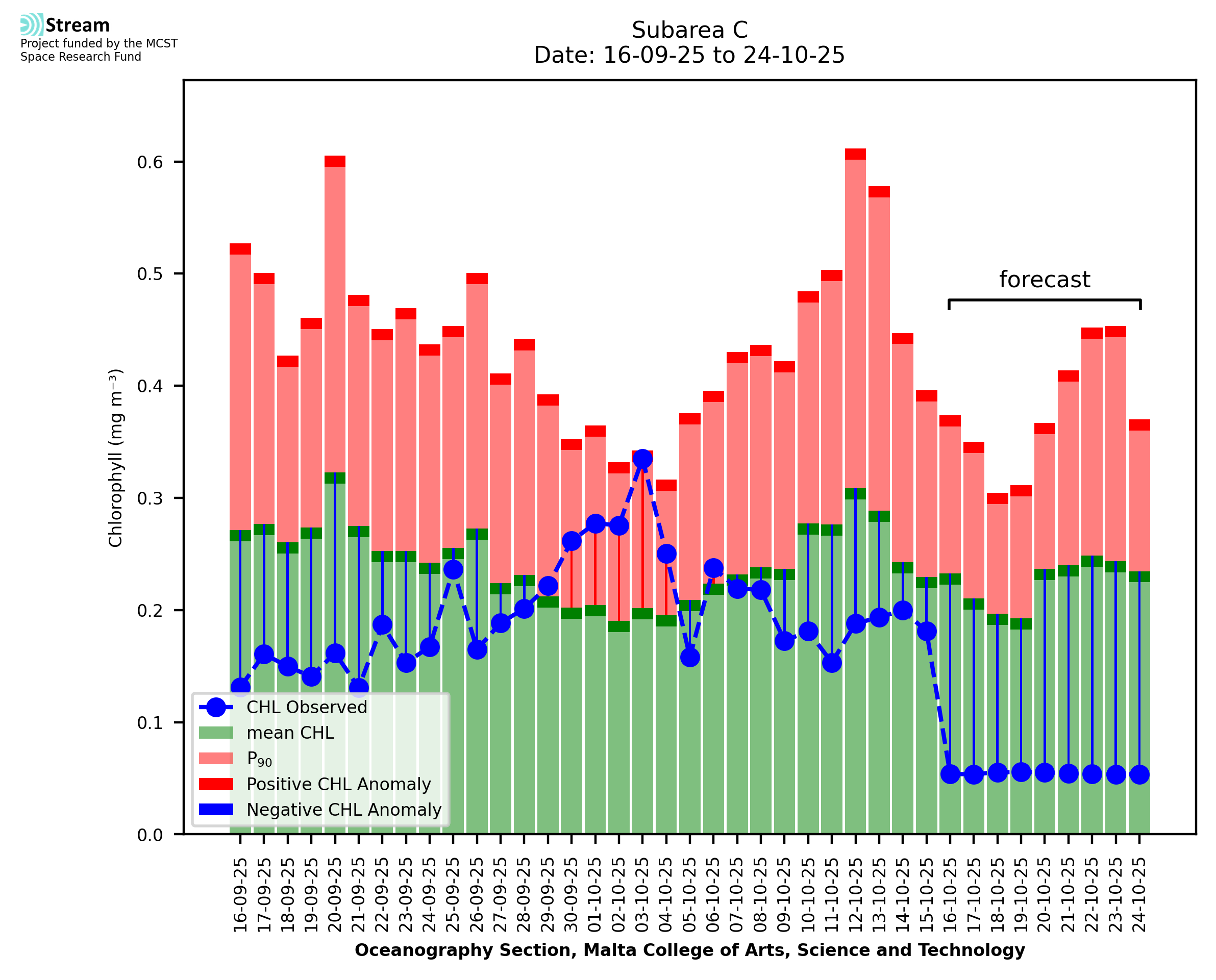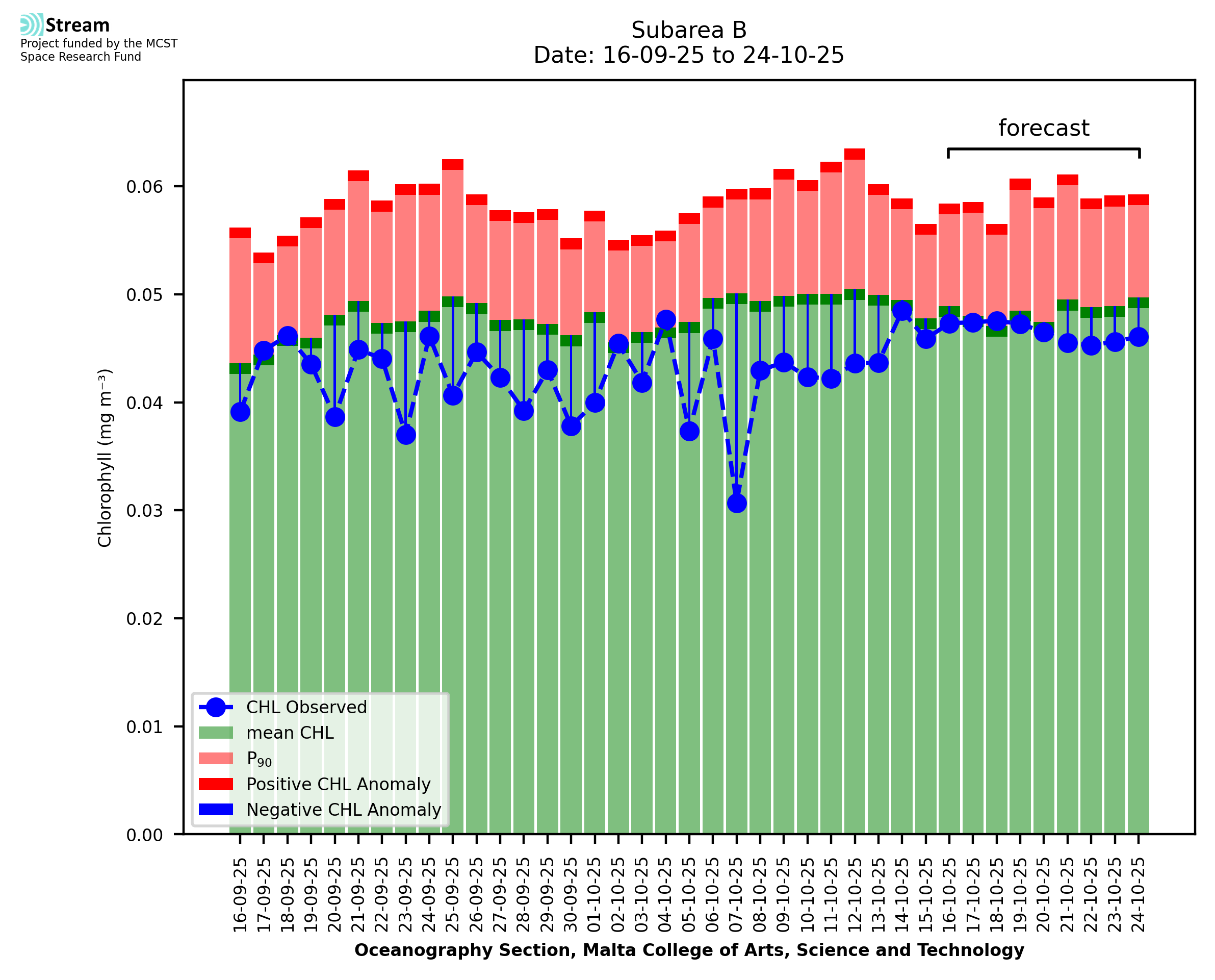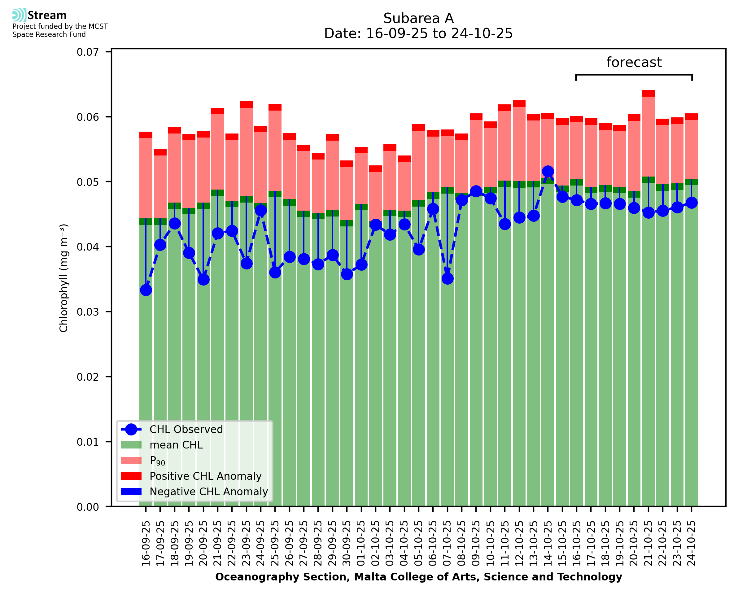 This STREAM service provides daily analysis of mass concentration of chlorophyll-a (CHL) anomalies, including spatial index maps for high chlorophyll occurrence and intensity in the Malta shelf area. User specific requests for data access and visualisation are planned for delivery on the STREAM mobile app. CHL is a core parameter in the Marine Strategy Framework Directive which provides the common framework for the assessment of the state of health of coastal seas to ensure coherence with the set goals of productive, healthy and clean European seas. CHL is considered to be a proxy of phythoplankton biomass and hence for eutrophication. Measuring chlorophyll is an indication of how much primary production is occurring in the sea.
