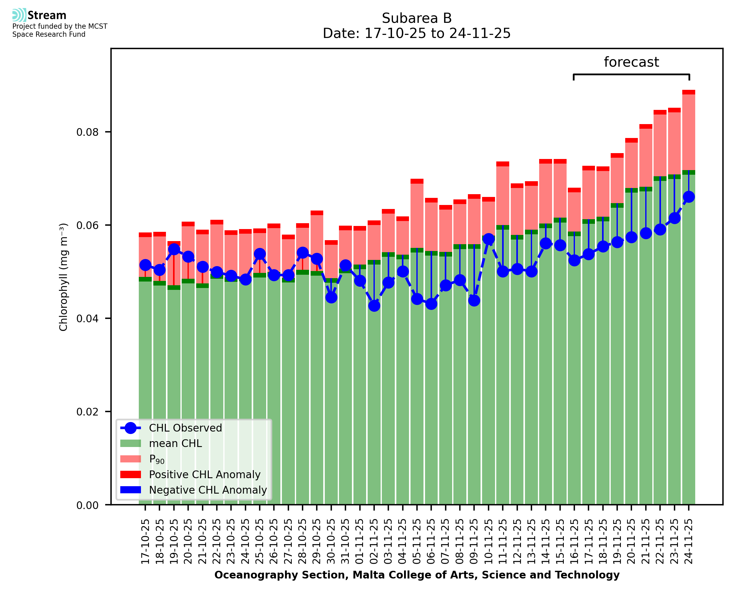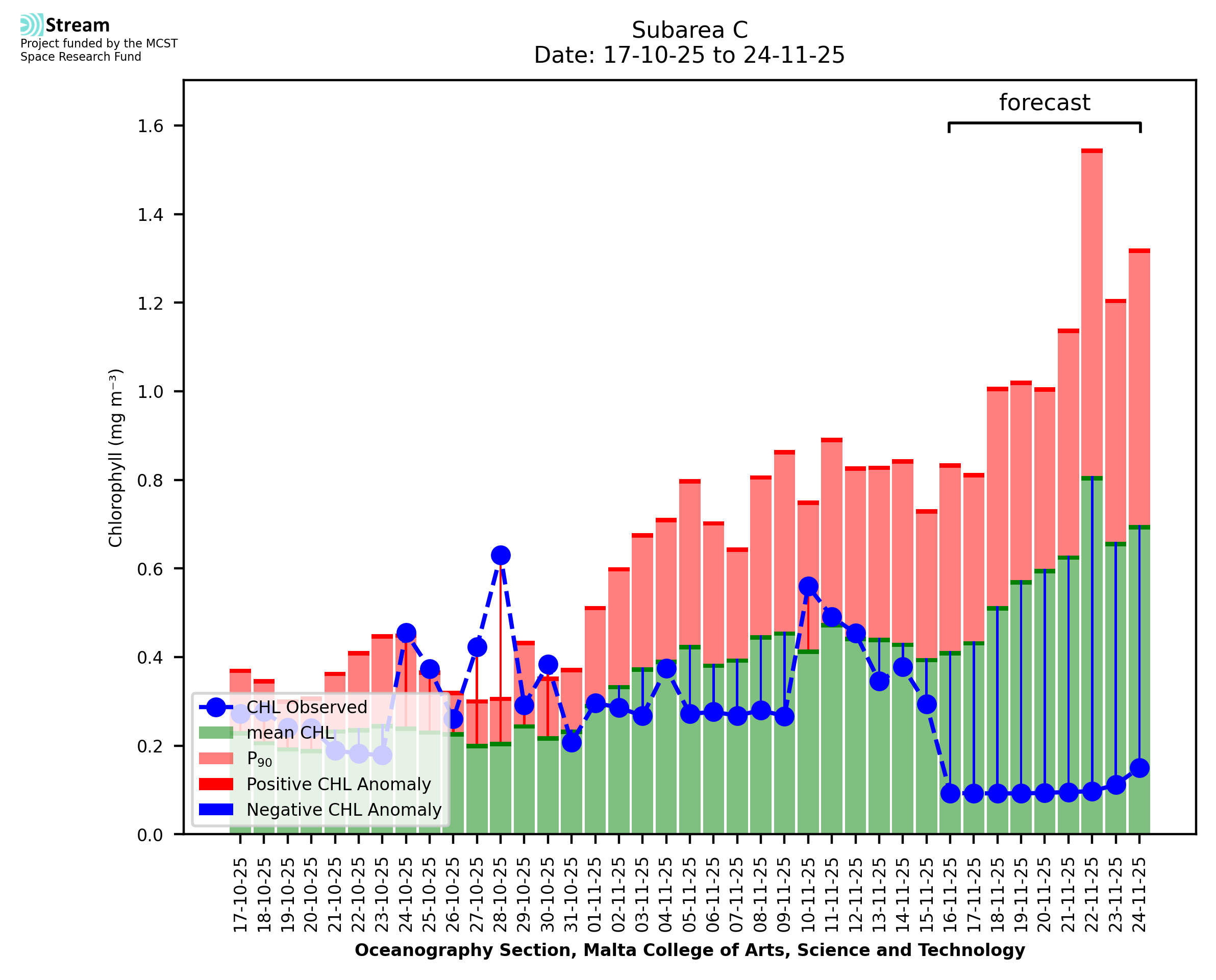 This STREAM service provides daily analysis of mass concentration of chlorophyll-a (CHL) anomalies, including spatial index maps for high chlorophyll occurrence and intensity in the Malta shelf area. User specific requests for data access and visualisation are planned for delivery on the STREAM mobile app. CHL is a core parameter in the Marine Strategy Framework Directive which provides the common framework for the assessment of the state of health of coastal seas to ensure coherence with the set goals of productive, healthy and clean European seas. CHL is considered to be a proxy of phythoplankton biomass and hence for eutrophication. Measuring chlorophyll is an indication of how much primary production is occurring in the sea.
