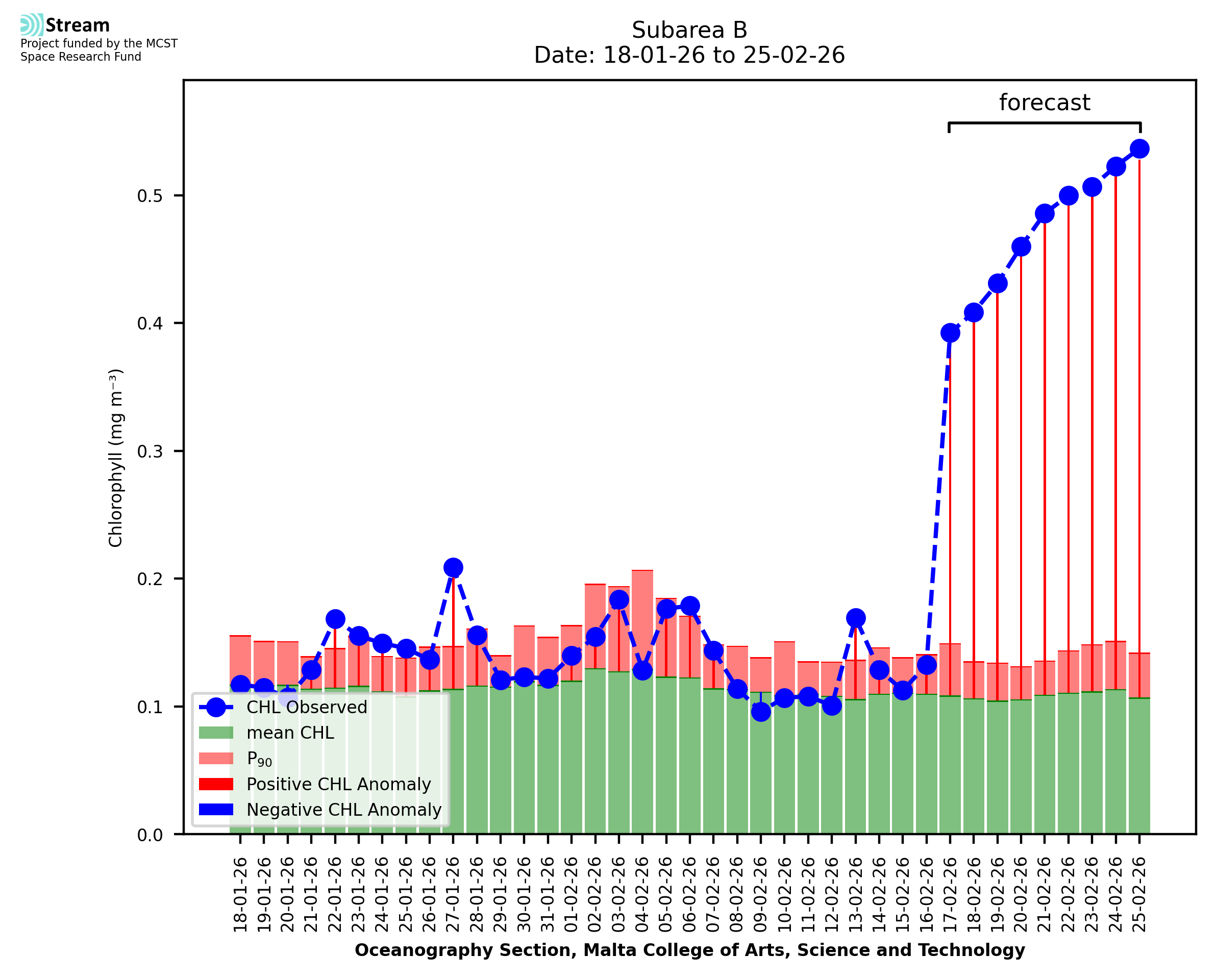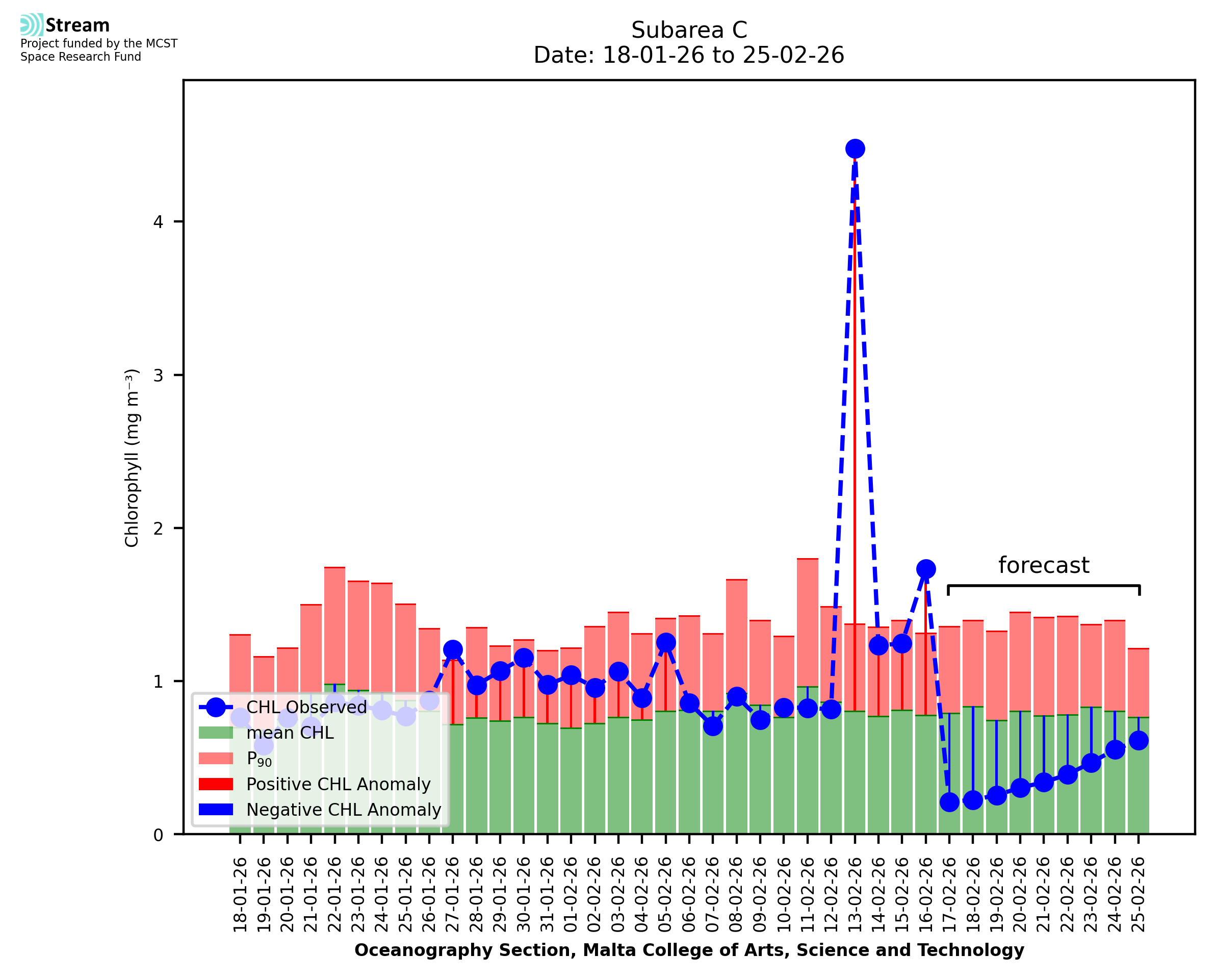 This STREAM service provides daily analysis of mass concentration of chlorophyll-a (CHL) anomalies, including spatial index maps for high chlorophyll occurrence and intensity in the Malta shelf area. User specific requests for data access and visualisation are planned for delivery on the STREAM mobile app. CHL is a core parameter in the Marine Strategy Framework Directive which provides the common framework for the assessment of the state of health of coastal seas to ensure coherence with the set goals of productive, healthy and clean European seas. CHL is considered to be a proxy of phythoplankton biomass and hence for eutrophication. Measuring chlorophyll is an indication of how much primary production is occurring in the sea.