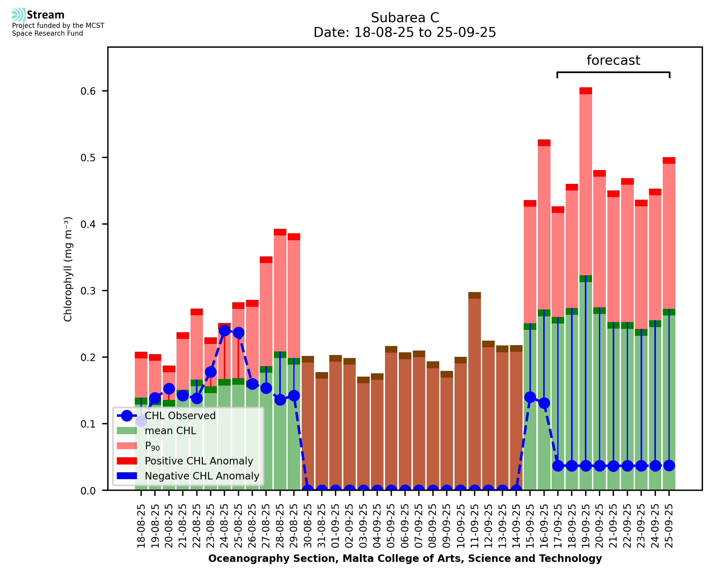 This STREAM service provides daily analysis of mass concentration of chlorophyll-a (CHL) anomalies, including spatial index maps for high chlorophyll occurrence and intensity in the Malta shelf area. User specific requests for data access and visualisation are planned for delivery on the STREAM mobile app. CHL is a core parameter in the Marine Strategy Framework Directive which provides the common framework for the assessment of the state of health of coastal seas to ensure coherence with the set goals of productive, healthy and clean European seas. CHL is considered to be a proxy of phythoplankton biomass and hence for eutrophication. Measuring chlorophyll is an indication of how much primary production is occurring in the sea.