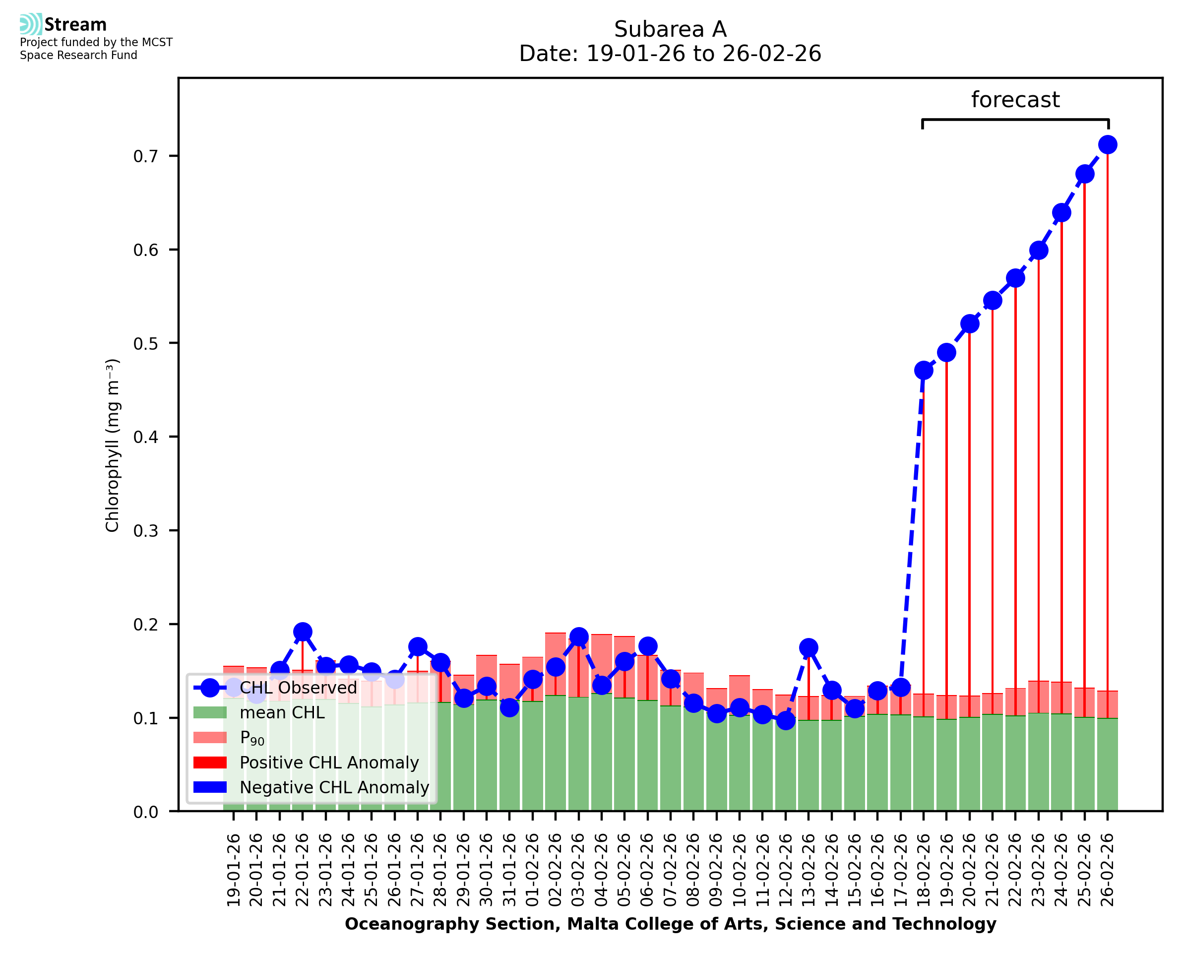 This STREAM service provides daily analysis of mass concentration of chlorophyll-a (CHL) anomalies, including spatial index maps for high chlorophyll occurrence and intensity in the Malta shelf area. User specific requests for data access and visualisation are planned for delivery on the STREAM mobile app. CHL is a core parameter in the Marine Strategy Framework Directive which provides the common framework for the assessment of the state of health of coastal seas to ensure coherence with the set goals of productive, healthy and clean European seas. CHL is considered to be a proxy of phythoplankton biomass and hence for eutrophication. Measuring chlorophyll is an indication of how much primary production is occurring in the sea.