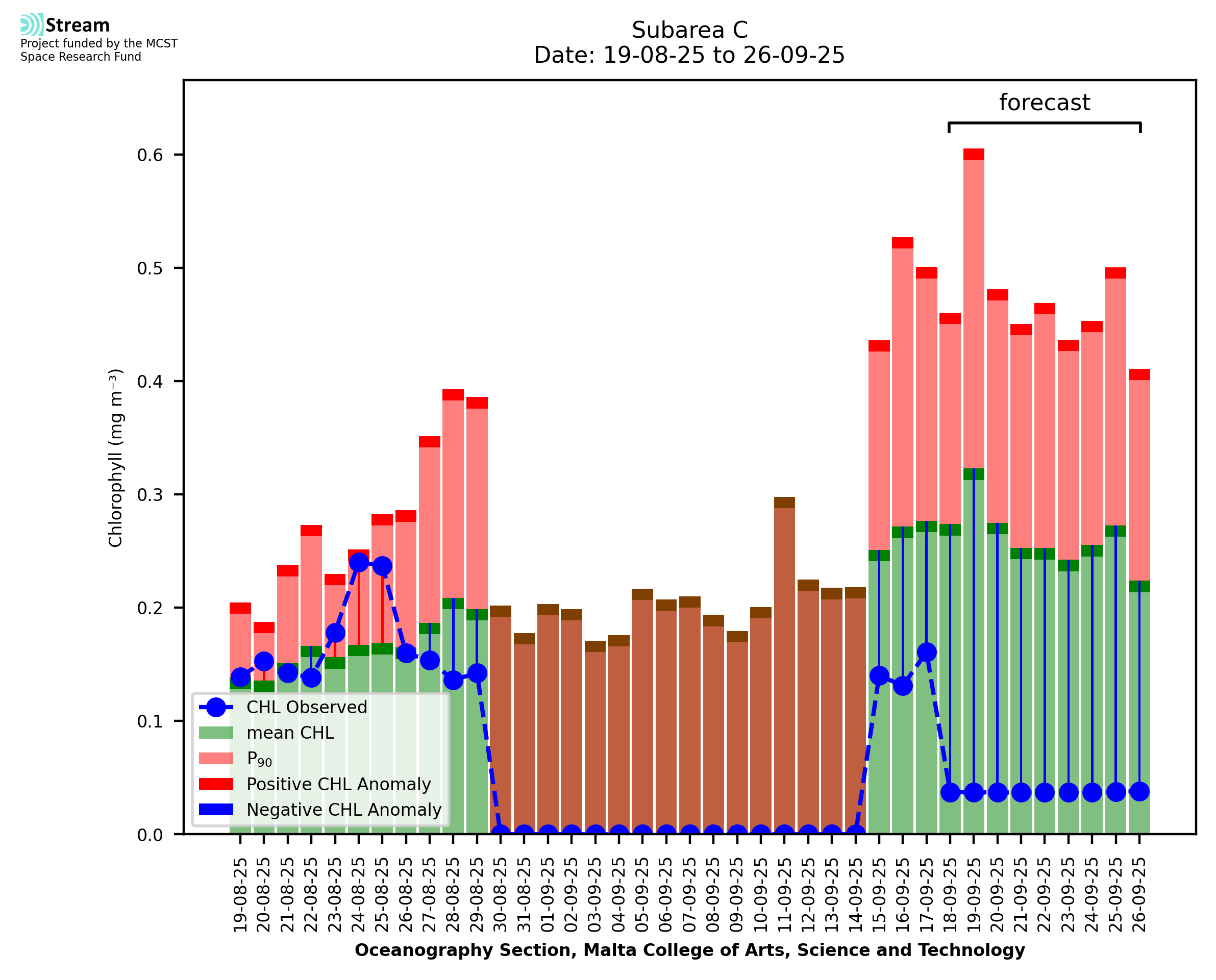 This STREAM service provides daily analysis of mass concentration of chlorophyll-a (CHL) anomalies, including spatial index maps for high chlorophyll occurrence and intensity in the Malta shelf area. User specific requests for data access and visualisation are planned for delivery on the STREAM mobile app. CHL is a core parameter in the Marine Strategy Framework Directive which provides the common framework for the assessment of the state of health of coastal seas to ensure coherence with the set goals of productive, healthy and clean European seas. CHL is considered to be a proxy of phythoplankton biomass and hence for eutrophication. Measuring chlorophyll is an indication of how much primary production is occurring in the sea.