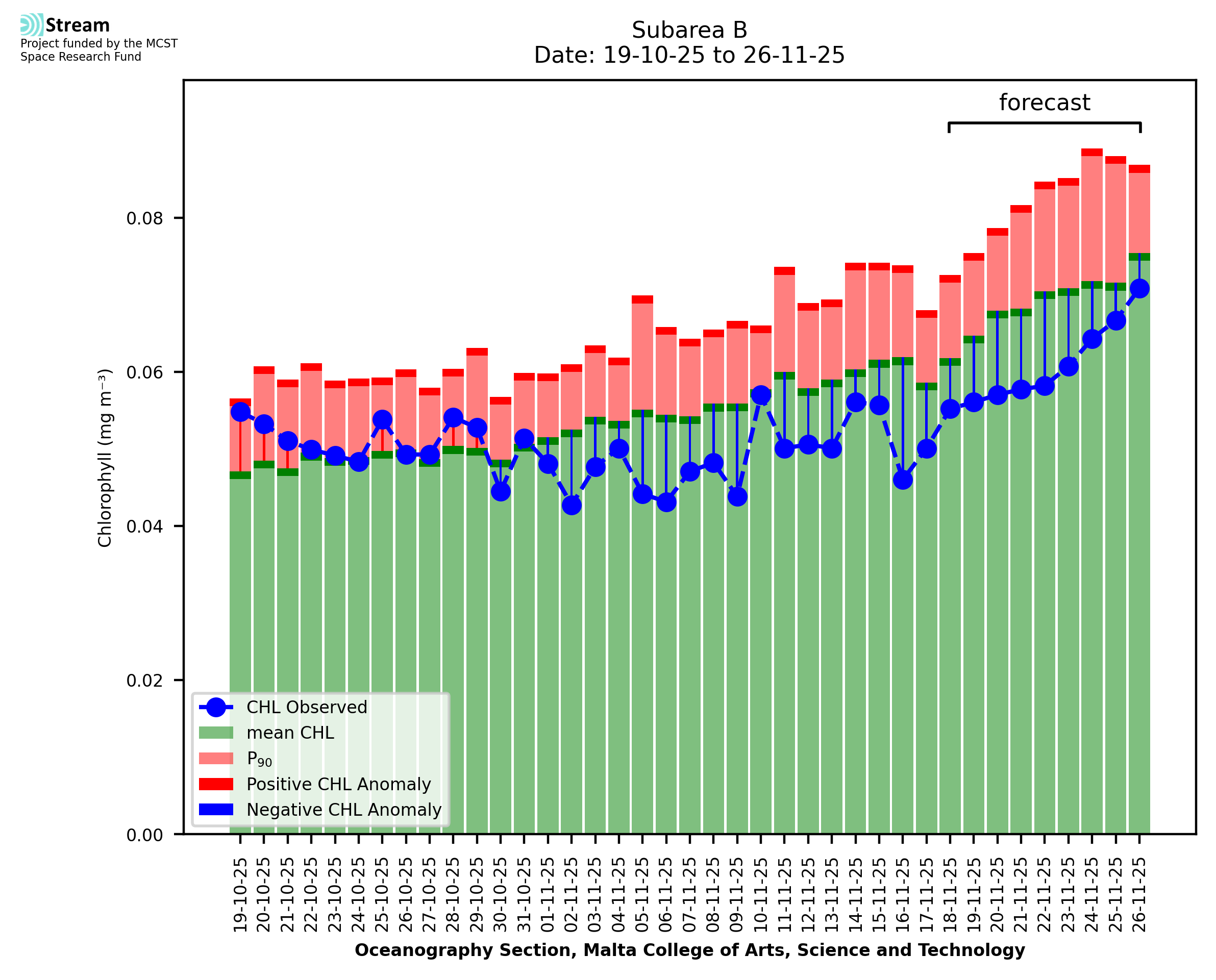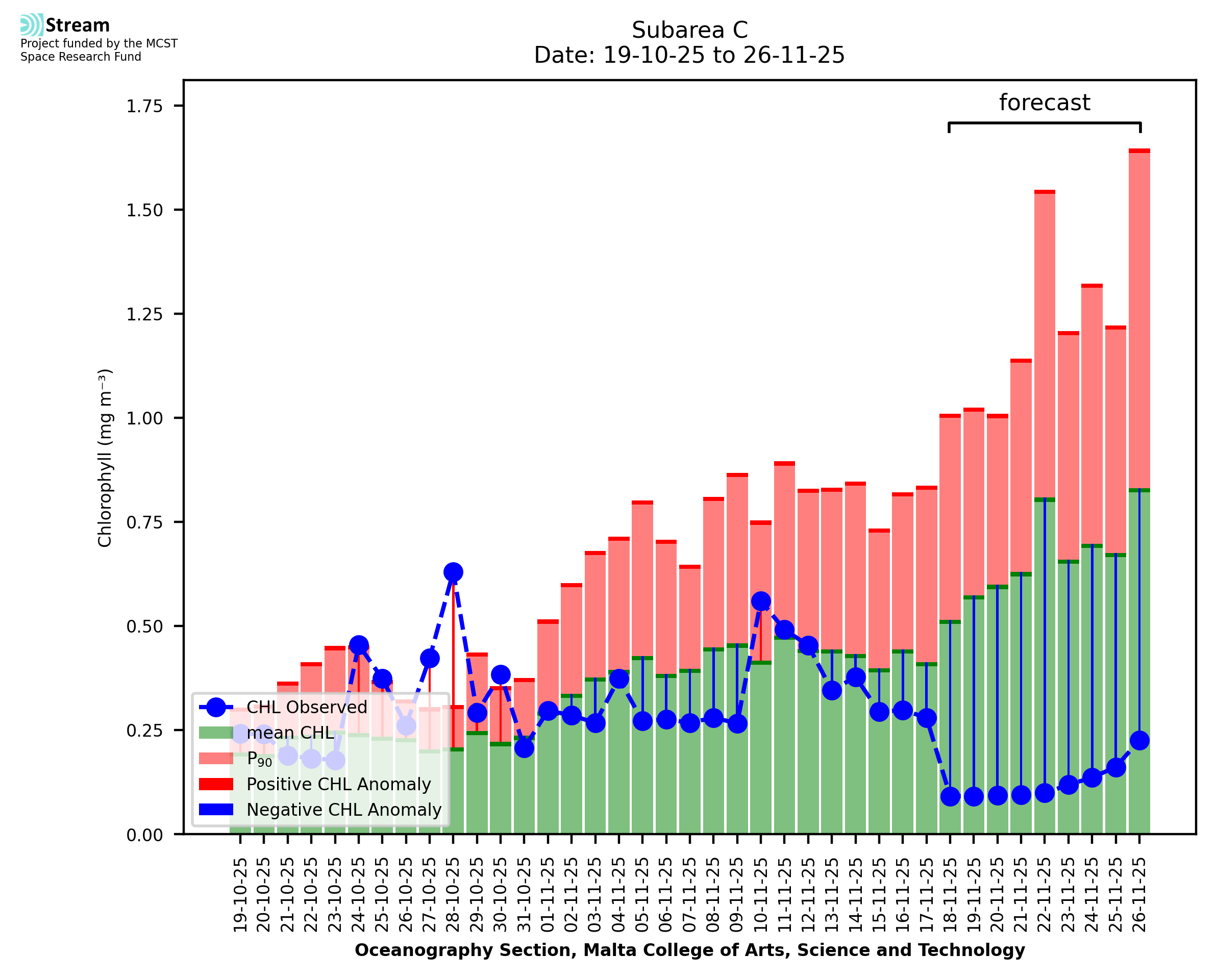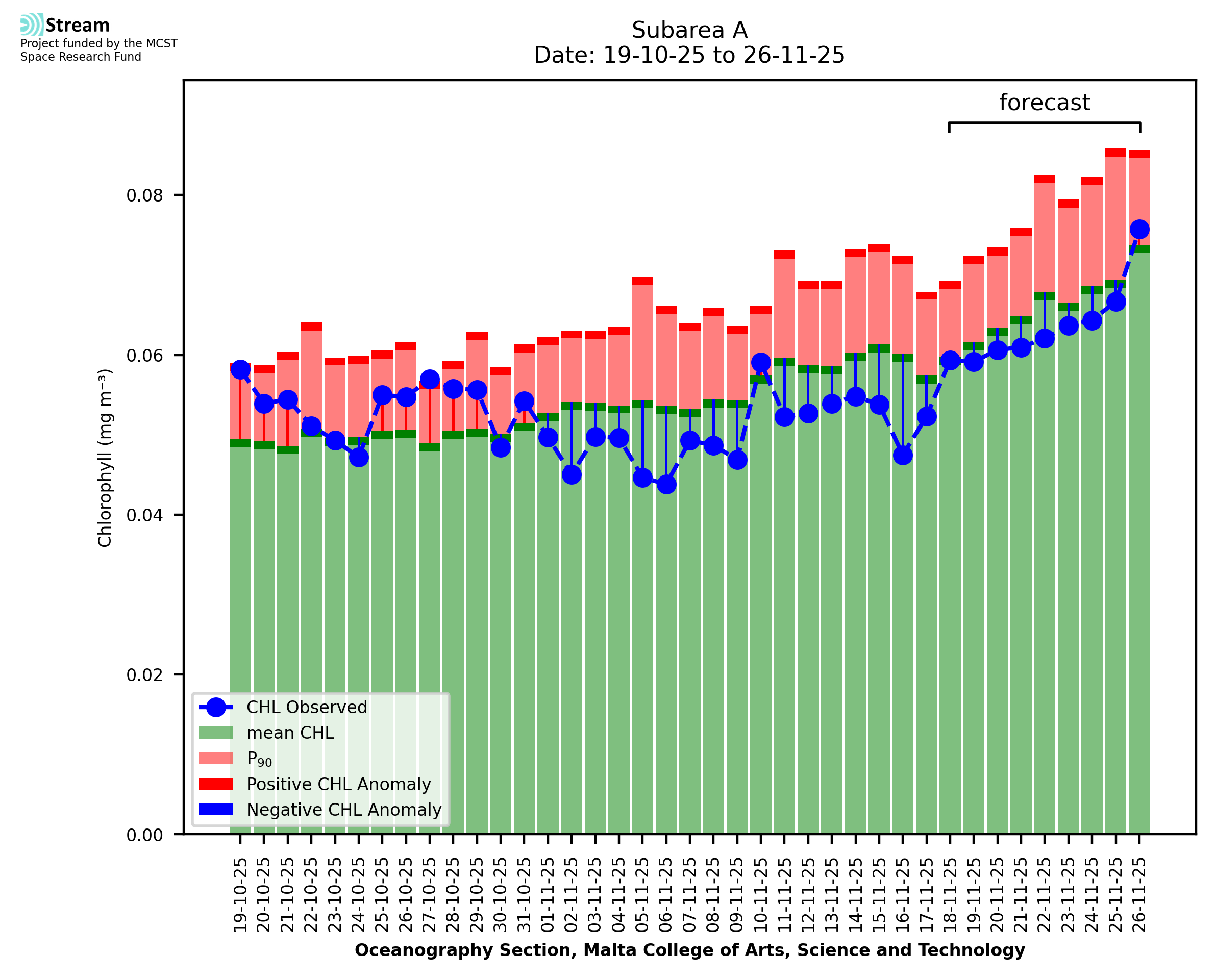 This STREAM service provides daily analysis of mass concentration of chlorophyll-a (CHL) anomalies, including spatial index maps for high chlorophyll occurrence and intensity in the Malta shelf area. User specific requests for data access and visualisation are planned for delivery on the STREAM mobile app. CHL is a core parameter in the Marine Strategy Framework Directive which provides the common framework for the assessment of the state of health of coastal seas to ensure coherence with the set goals of productive, healthy and clean European seas. CHL is considered to be a proxy of phythoplankton biomass and hence for eutrophication. Measuring chlorophyll is an indication of how much primary production is occurring in the sea.