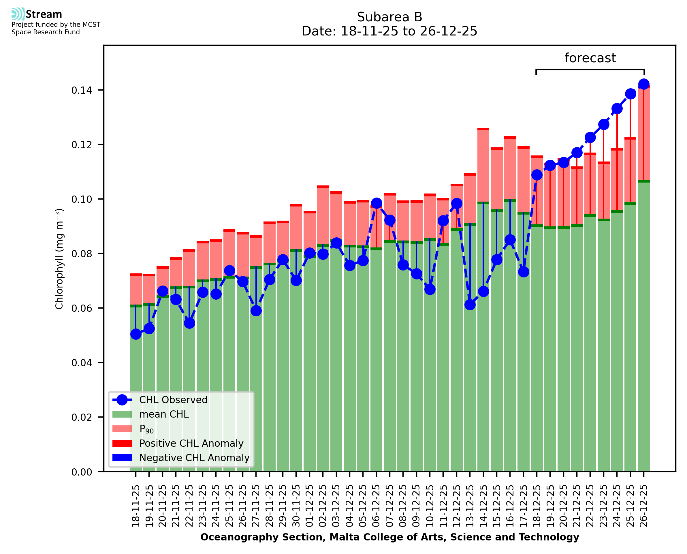 This STREAM service provides daily analysis of mass concentration of chlorophyll-a (CHL) anomalies, including spatial index maps for high chlorophyll occurrence and intensity in the Malta shelf area. User specific requests for data access and visualisation are planned for delivery on the STREAM mobile app. CHL is a core parameter in the Marine Strategy Framework Directive which provides the common framework for the assessment of the state of health of coastal seas to ensure coherence with the set goals of productive, healthy and clean European seas. CHL is considered to be a proxy of phythoplankton biomass and hence for eutrophication. Measuring chlorophyll is an indication of how much primary production is occurring in the sea.