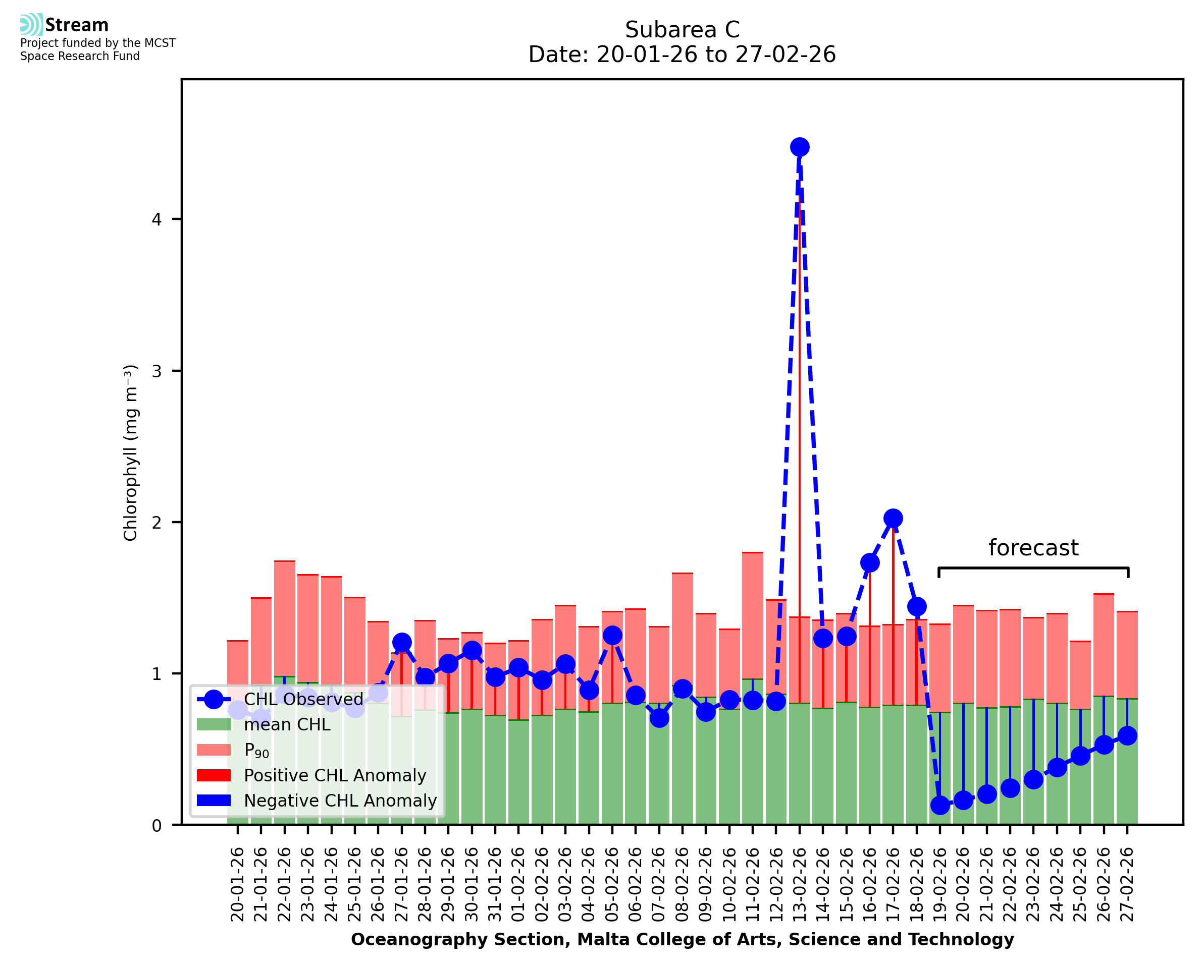 This STREAM service provides daily analysis of mass concentration of chlorophyll-a (CHL) anomalies, including spatial index maps for high chlorophyll occurrence and intensity in the Malta shelf area. User specific requests for data access and visualisation are planned for delivery on the STREAM mobile app. CHL is a core parameter in the Marine Strategy Framework Directive which provides the common framework for the assessment of the state of health of coastal seas to ensure coherence with the set goals of productive, healthy and clean European seas. CHL is considered to be a proxy of phythoplankton biomass and hence for eutrophication. Measuring chlorophyll is an indication of how much primary production is occurring in the sea.