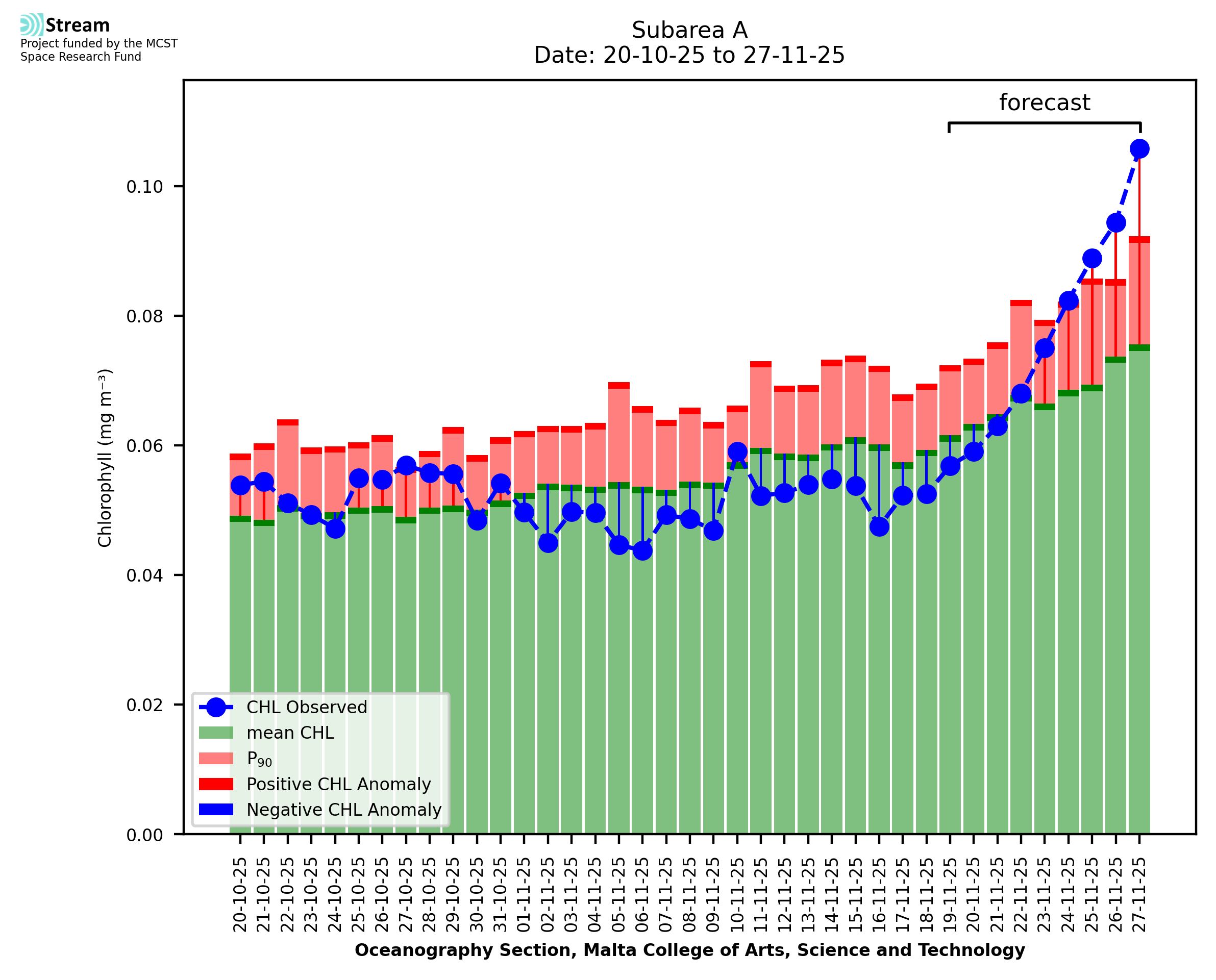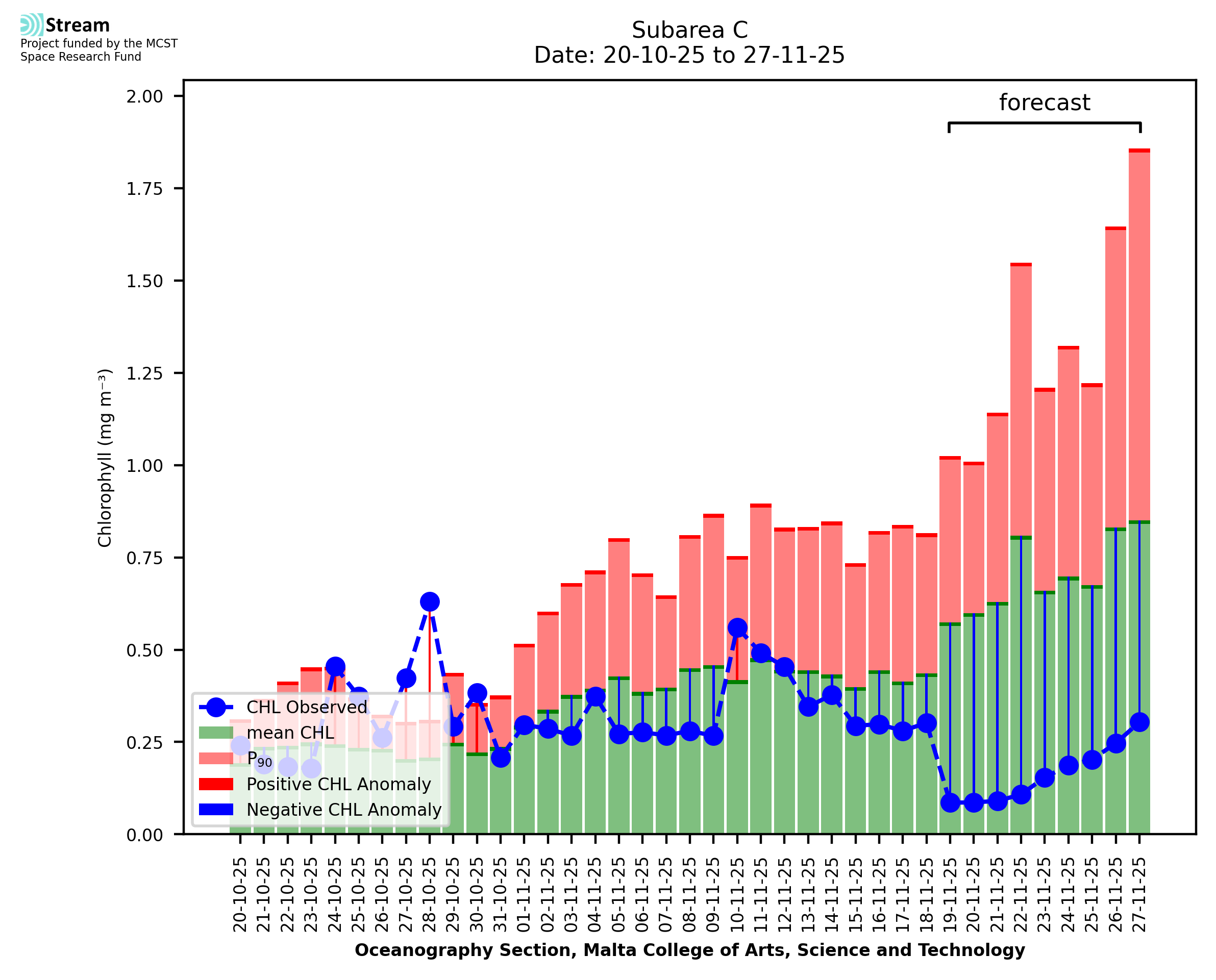 This STREAM service provides daily analysis of mass concentration of chlorophyll-a (CHL) anomalies, including spatial index maps for high chlorophyll occurrence and intensity in the Malta shelf area. User specific requests for data access and visualisation are planned for delivery on the STREAM mobile app. CHL is a core parameter in the Marine Strategy Framework Directive which provides the common framework for the assessment of the state of health of coastal seas to ensure coherence with the set goals of productive, healthy and clean European seas. CHL is considered to be a proxy of phythoplankton biomass and hence for eutrophication. Measuring chlorophyll is an indication of how much primary production is occurring in the sea.