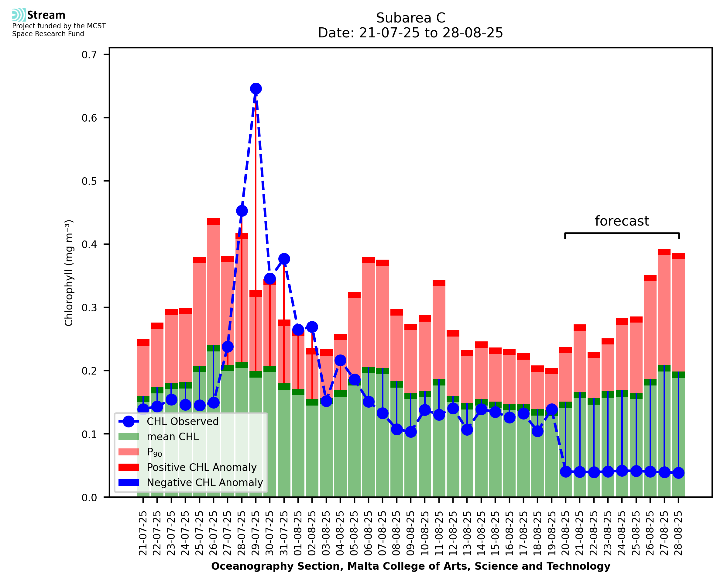 This STREAM service provides daily analysis of mass concentration of chlorophyll-a (CHL) anomalies, including spatial index maps for high chlorophyll occurrence and intensity in the Malta shelf area. User specific requests for data access and visualisation are planned for delivery on the STREAM mobile app. CHL is a core parameter in the Marine Strategy Framework Directive which provides the common framework for the assessment of the state of health of coastal seas to ensure coherence with the set goals of productive, healthy and clean European seas. CHL is considered to be a proxy of phythoplankton biomass and hence for eutrophication. Measuring chlorophyll is an indication of how much primary production is occurring in the sea.