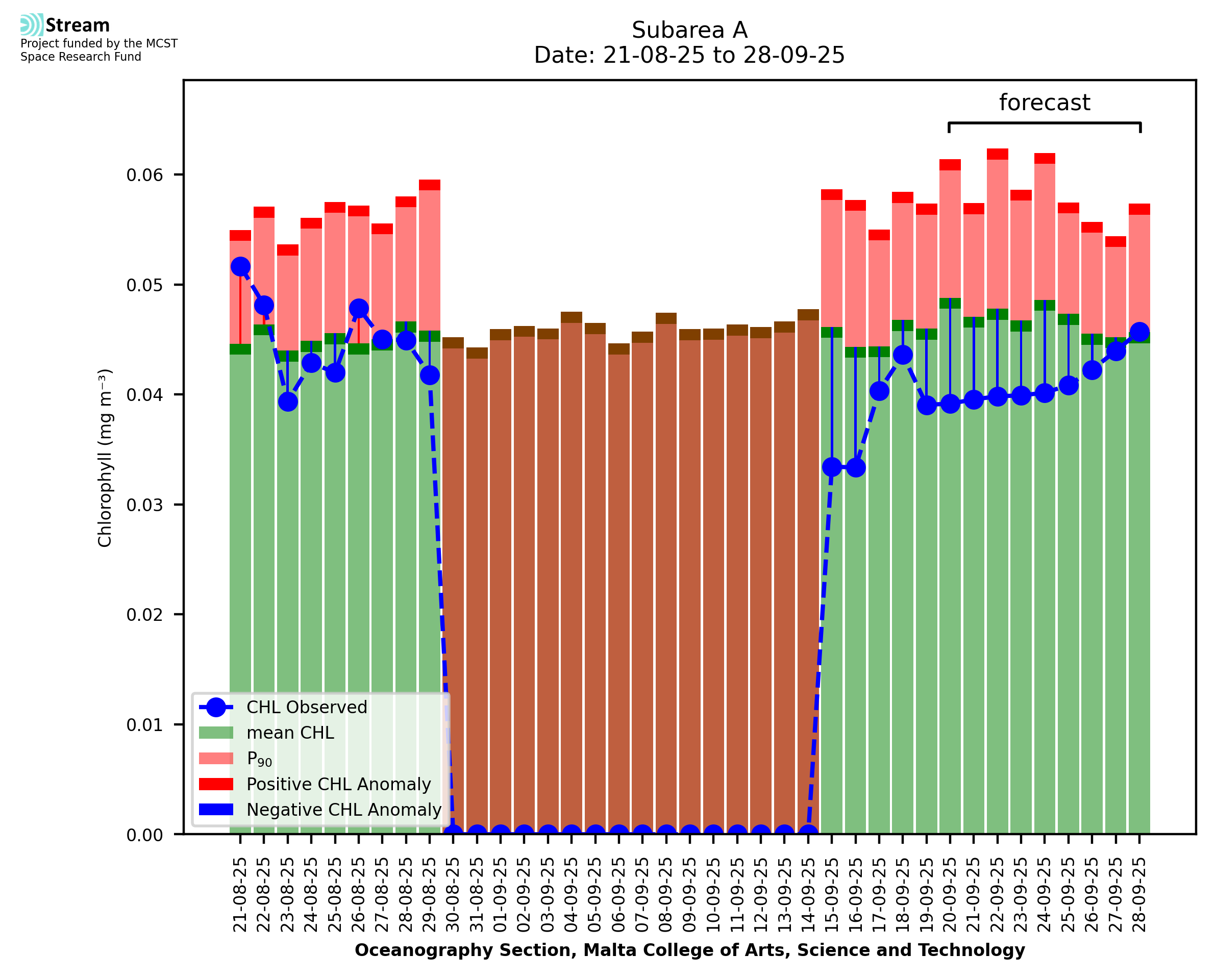 This STREAM service provides daily analysis of mass concentration of chlorophyll-a (CHL) anomalies, including spatial index maps for high chlorophyll occurrence and intensity in the Malta shelf area. User specific requests for data access and visualisation are planned for delivery on the STREAM mobile app. CHL is a core parameter in the Marine Strategy Framework Directive which provides the common framework for the assessment of the state of health of coastal seas to ensure coherence with the set goals of productive, healthy and clean European seas. CHL is considered to be a proxy of phythoplankton biomass and hence for eutrophication. Measuring chlorophyll is an indication of how much primary production is occurring in the sea.