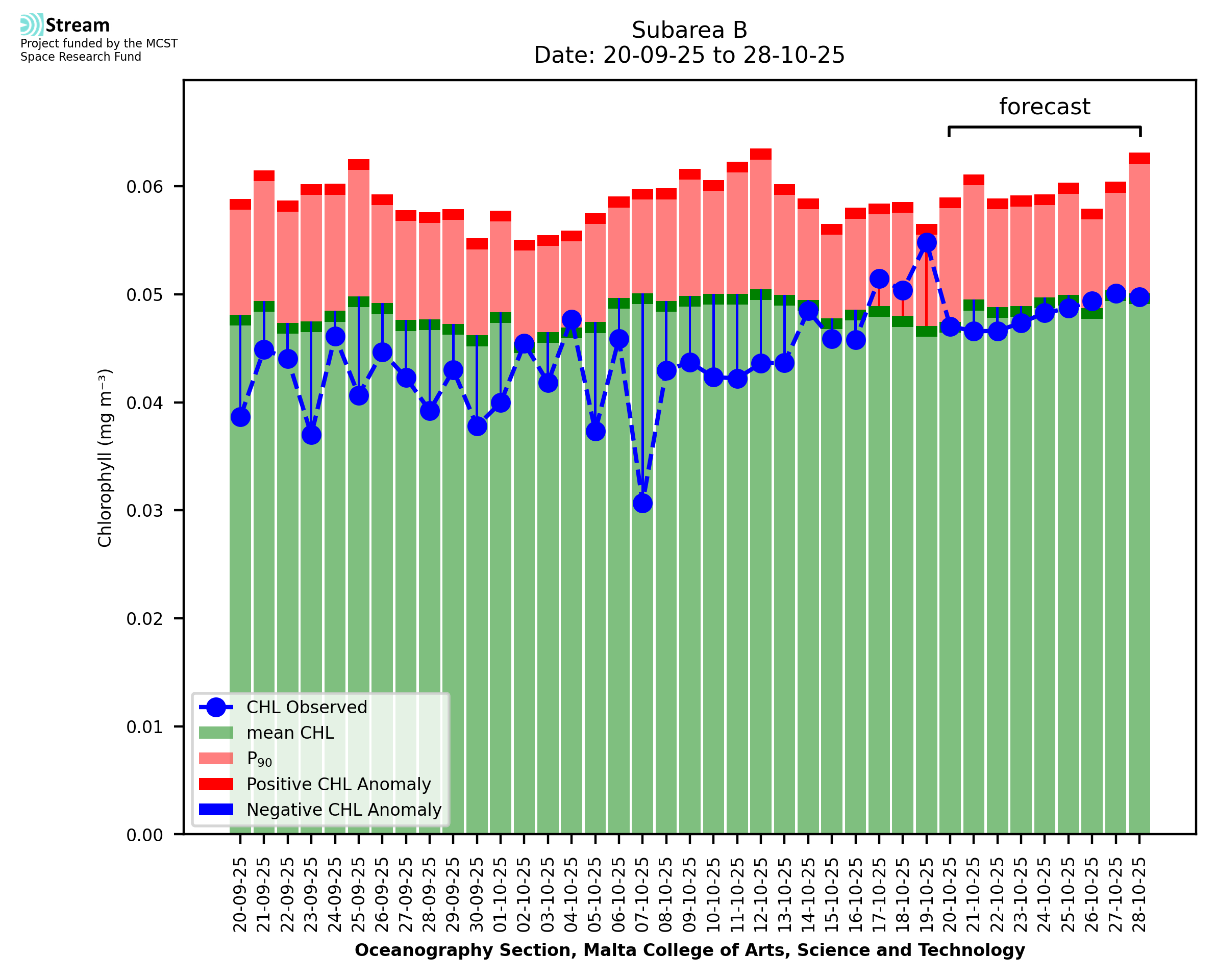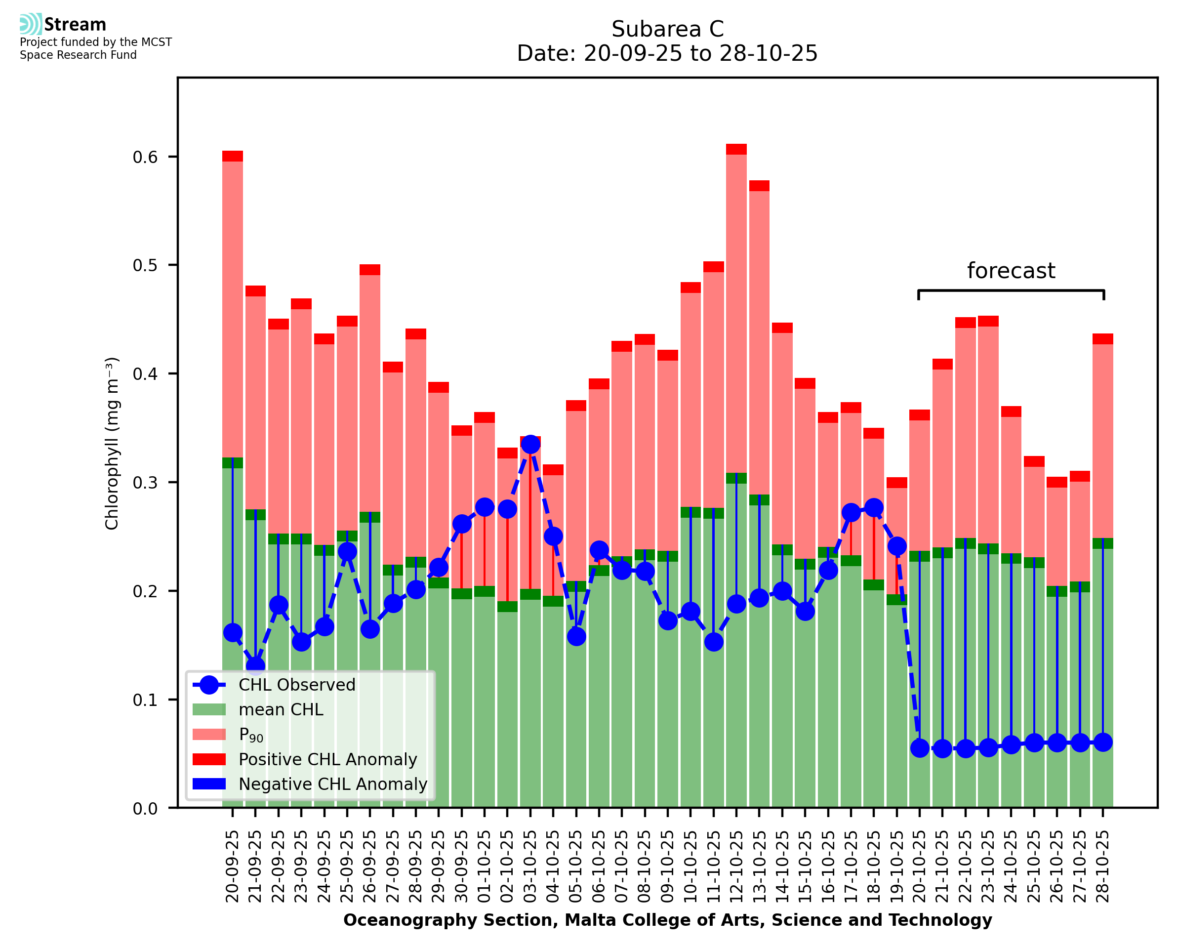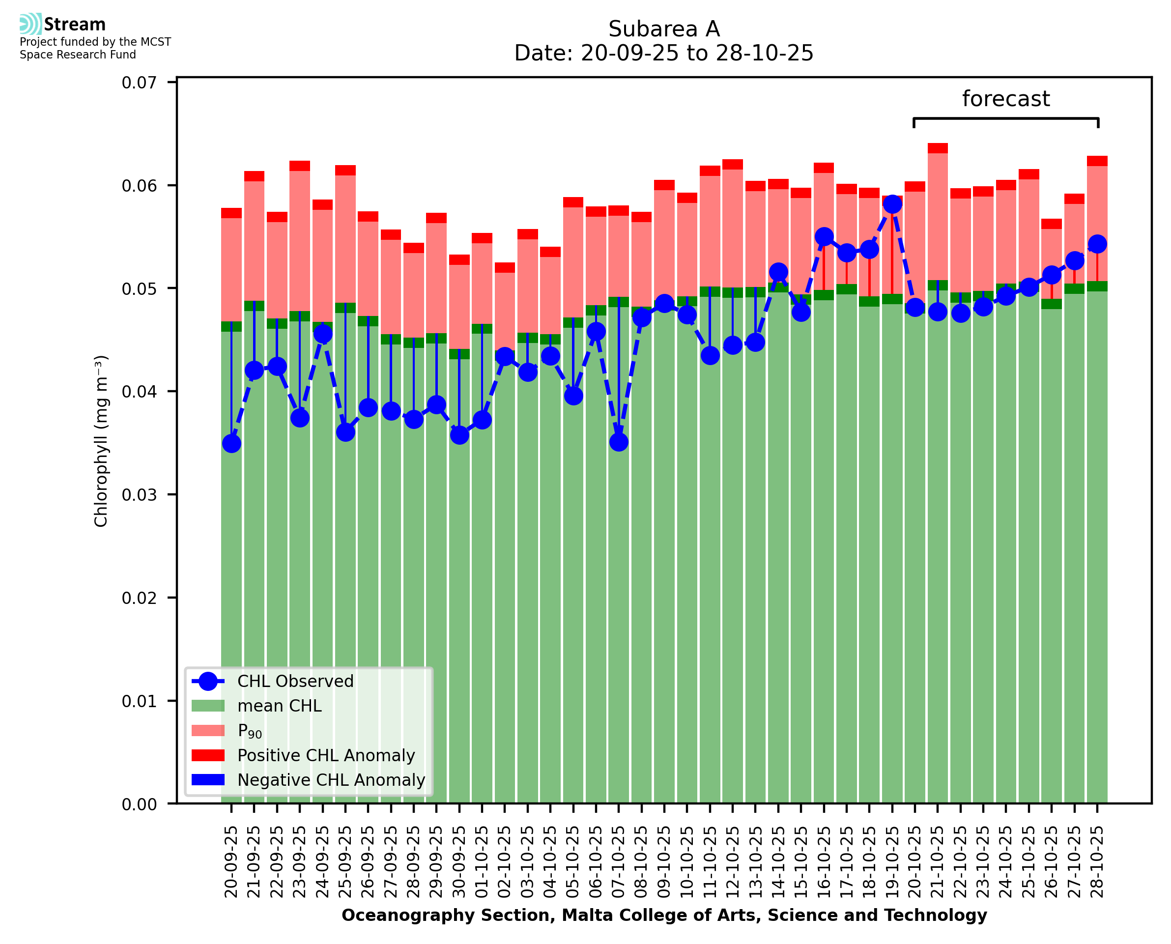 This STREAM service provides daily analysis of mass concentration of chlorophyll-a (CHL) anomalies, including spatial index maps for high chlorophyll occurrence and intensity in the Malta shelf area. User specific requests for data access and visualisation are planned for delivery on the STREAM mobile app. CHL is a core parameter in the Marine Strategy Framework Directive which provides the common framework for the assessment of the state of health of coastal seas to ensure coherence with the set goals of productive, healthy and clean European seas. CHL is considered to be a proxy of phythoplankton biomass and hence for eutrophication. Measuring chlorophyll is an indication of how much primary production is occurring in the sea.