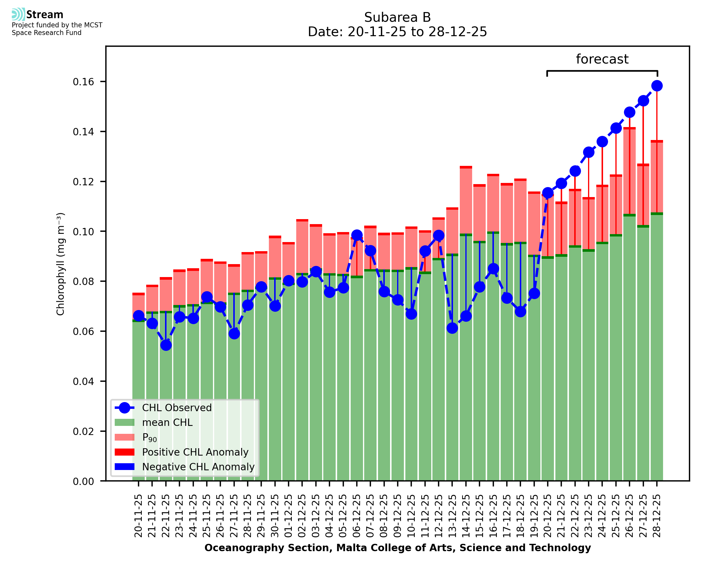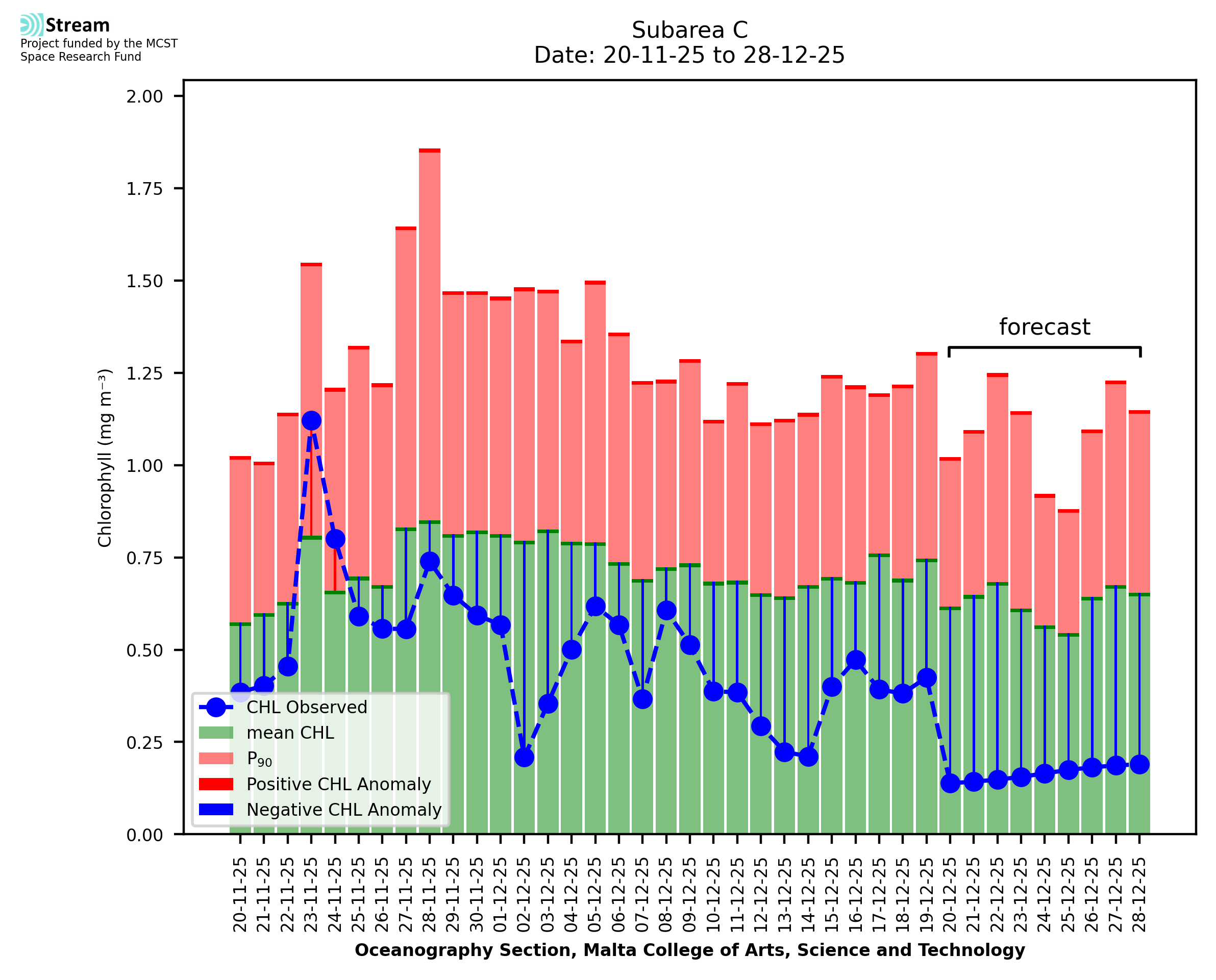 This STREAM service provides daily analysis of mass concentration of chlorophyll-a (CHL) anomalies, including spatial index maps for high chlorophyll occurrence and intensity in the Malta shelf area. User specific requests for data access and visualisation are planned for delivery on the STREAM mobile app. CHL is a core parameter in the Marine Strategy Framework Directive which provides the common framework for the assessment of the state of health of coastal seas to ensure coherence with the set goals of productive, healthy and clean European seas. CHL is considered to be a proxy of phythoplankton biomass and hence for eutrophication. Measuring chlorophyll is an indication of how much primary production is occurring in the sea.