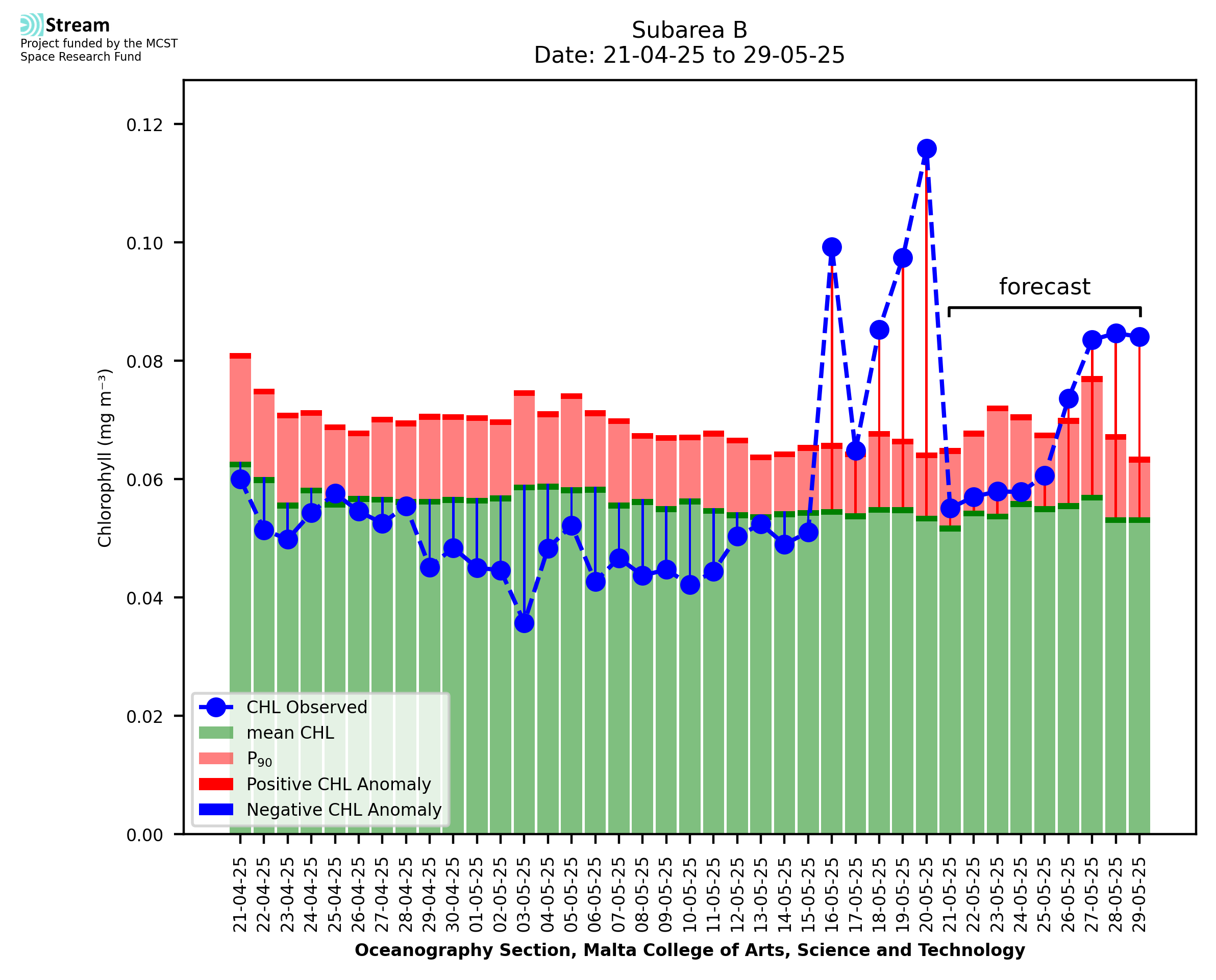 Spatial map of high chlorophyll occurrence and intensity. The CHL index is signalled when the CHL anomaly (CHLA) exceeds the CHL 90th percentile (CHL90) for at least 5 consecutive days. The CHL index gives a measure of the chlorophyll intensity, measured by the size of the CHLA compared to the difference between CHL90 and the climatological mean CHL.