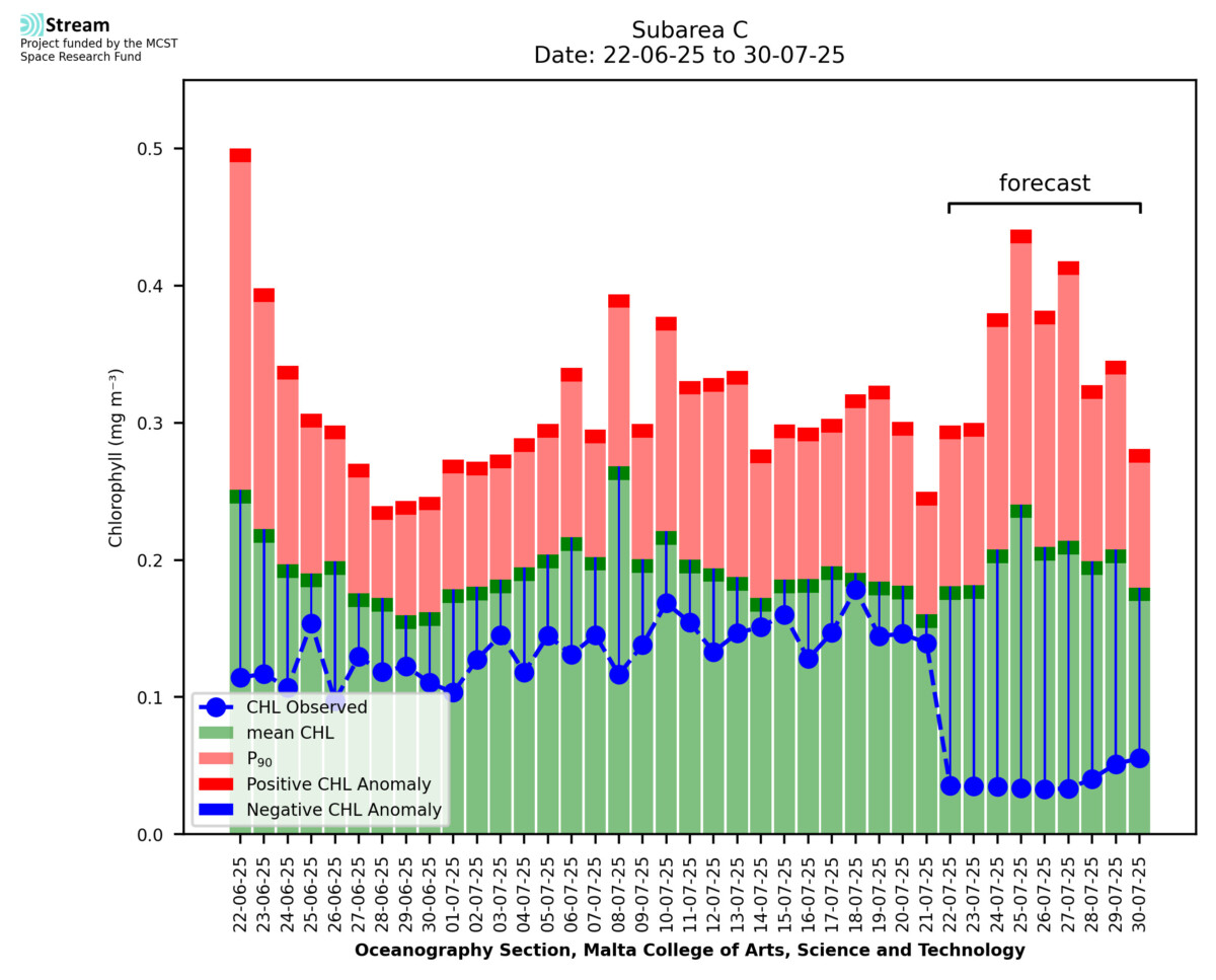 This STREAM service provides daily analysis of mass concentration of chlorophyll-a (CHL) anomalies, including spatial index maps for high chlorophyll occurrence and intensity in the Malta shelf area. User specific requests for data access and visualisation are planned for delivery on the STREAM mobile app. CHL is a core parameter in the Marine Strategy Framework Directive which provides the common framework for the assessment of the state of health of coastal seas to ensure coherence with the set goals of productive, healthy and clean European seas. CHL is considered to be a proxy of phythoplankton biomass and hence for eutrophication. Measuring chlorophyll is an indication of how much primary production is occurring in the sea.