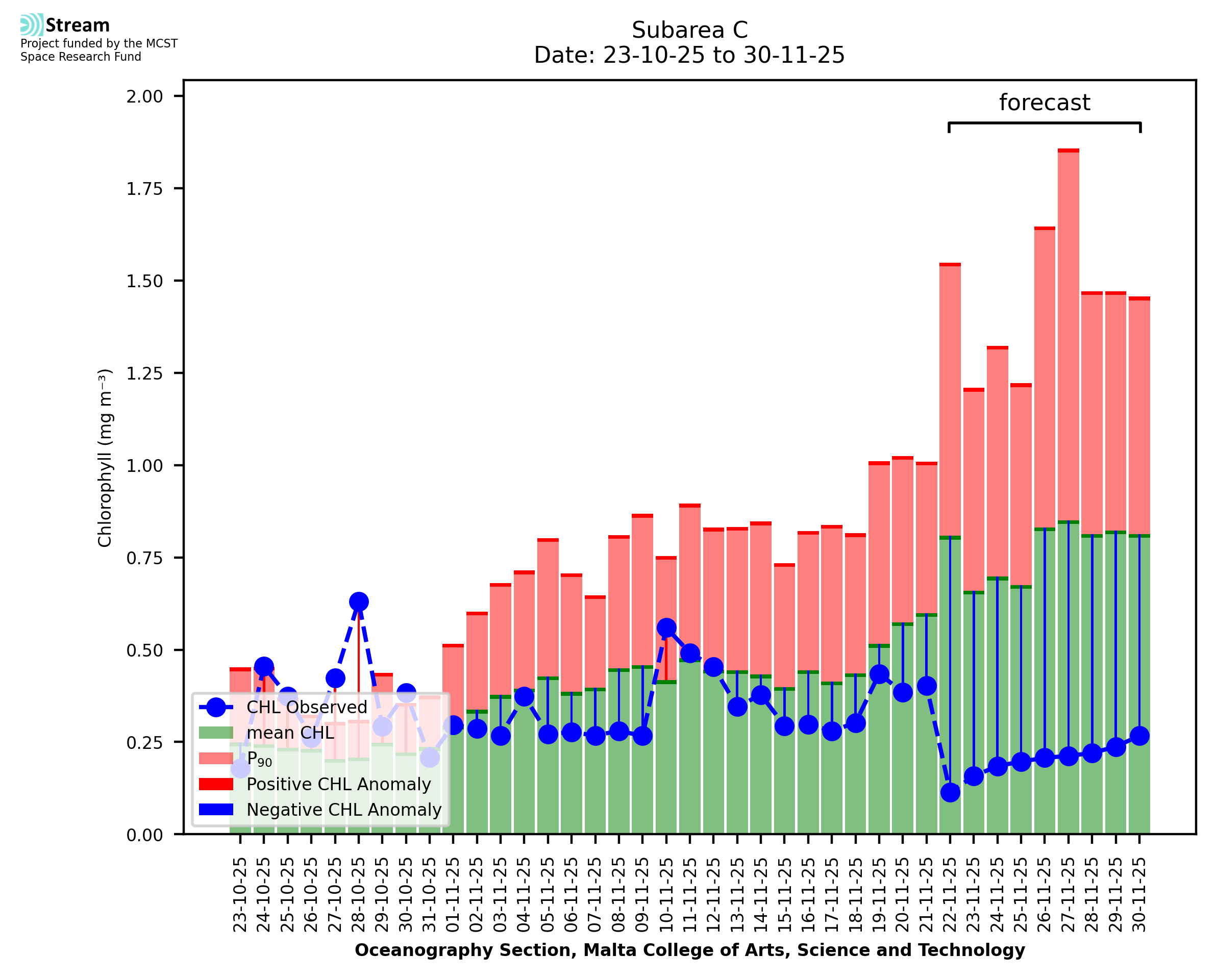 This STREAM service provides daily analysis of mass concentration of chlorophyll-a (CHL) anomalies, including spatial index maps for high chlorophyll occurrence and intensity in the Malta shelf area. User specific requests for data access and visualisation are planned for delivery on the STREAM mobile app. CHL is a core parameter in the Marine Strategy Framework Directive which provides the common framework for the assessment of the state of health of coastal seas to ensure coherence with the set goals of productive, healthy and clean European seas. CHL is considered to be a proxy of phythoplankton biomass and hence for eutrophication. Measuring chlorophyll is an indication of how much primary production is occurring in the sea.