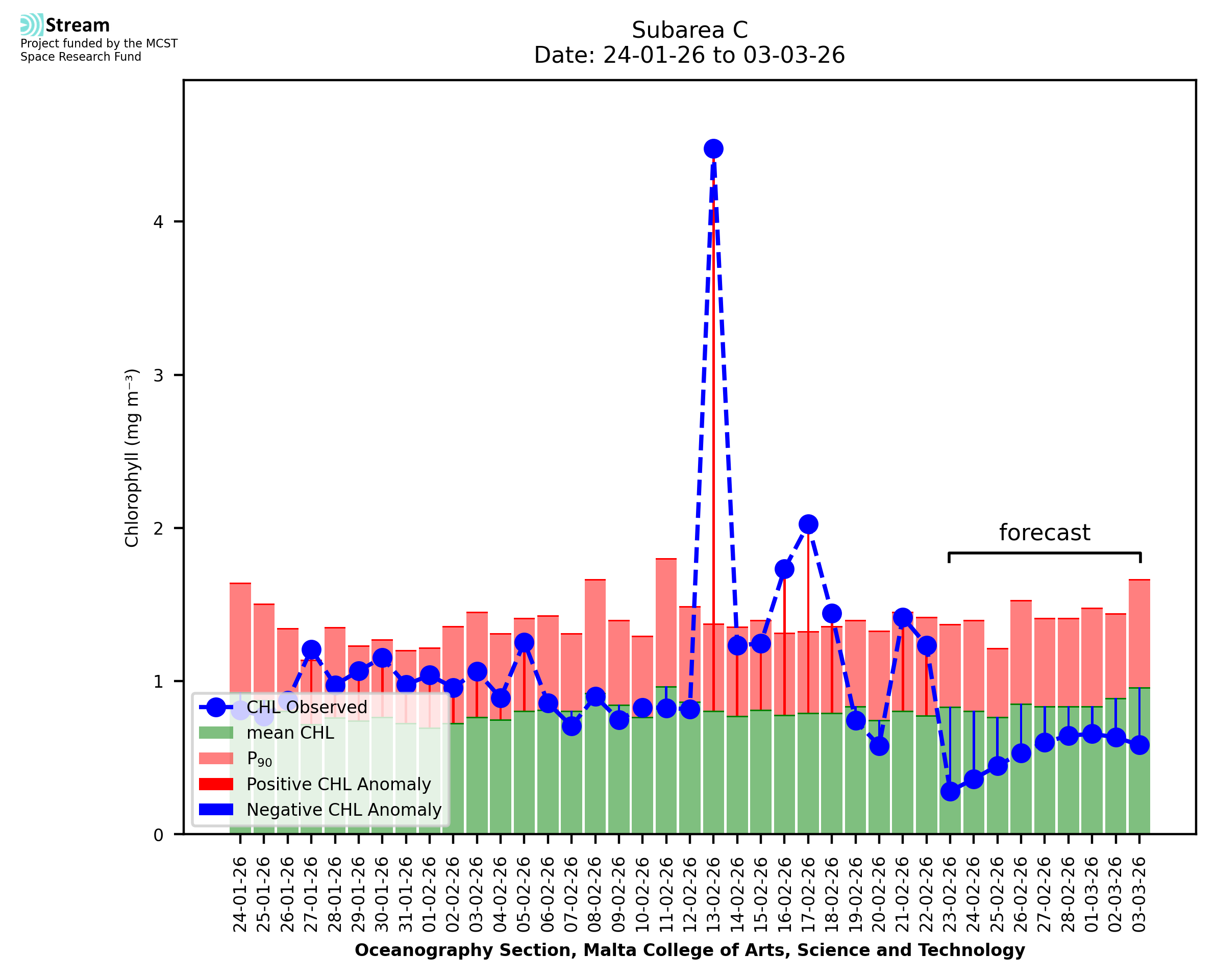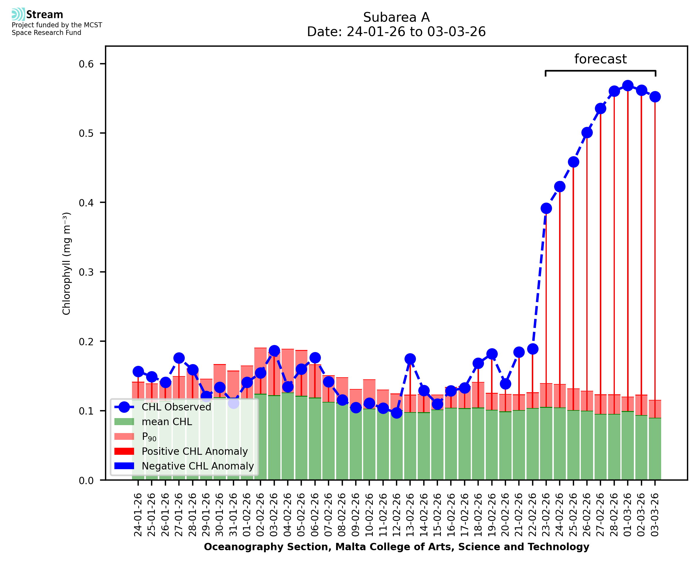 This STREAM service provides daily analysis of mass concentration of chlorophyll-a (CHL) anomalies, including spatial index maps for high chlorophyll occurrence and intensity in the Malta shelf area. User specific requests for data access and visualisation are planned for delivery on the STREAM mobile app. CHL is a core parameter in the Marine Strategy Framework Directive which provides the common framework for the assessment of the state of health of coastal seas to ensure coherence with the set goals of productive, healthy and clean European seas. CHL is considered to be a proxy of phythoplankton biomass and hence for eutrophication. Measuring chlorophyll is an indication of how much primary production is occurring in the sea.