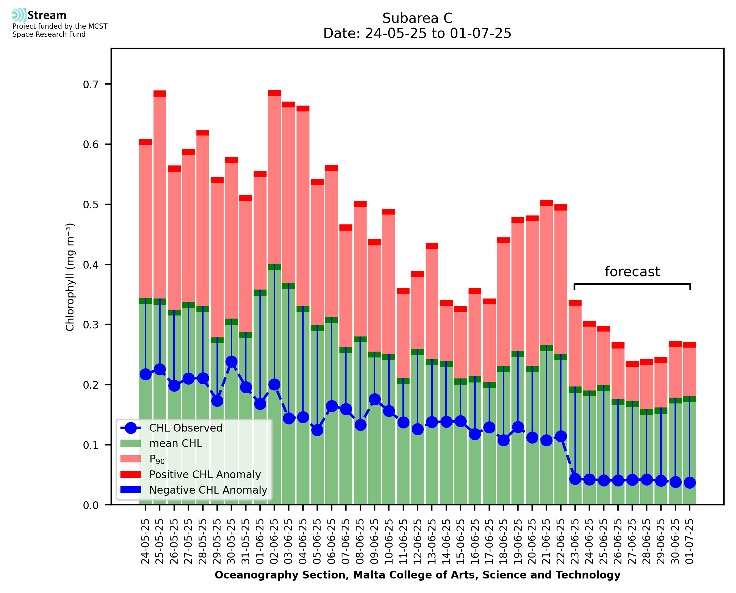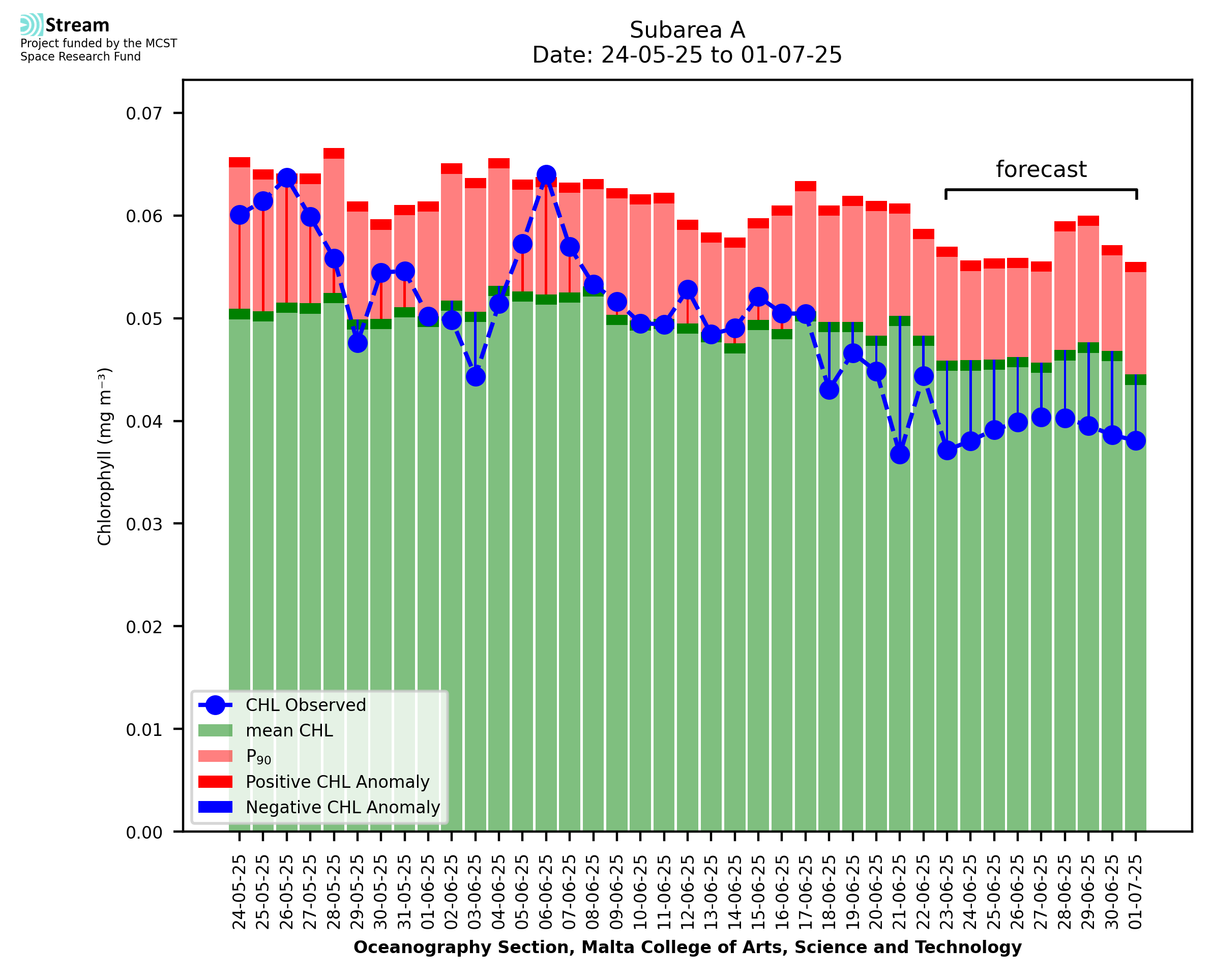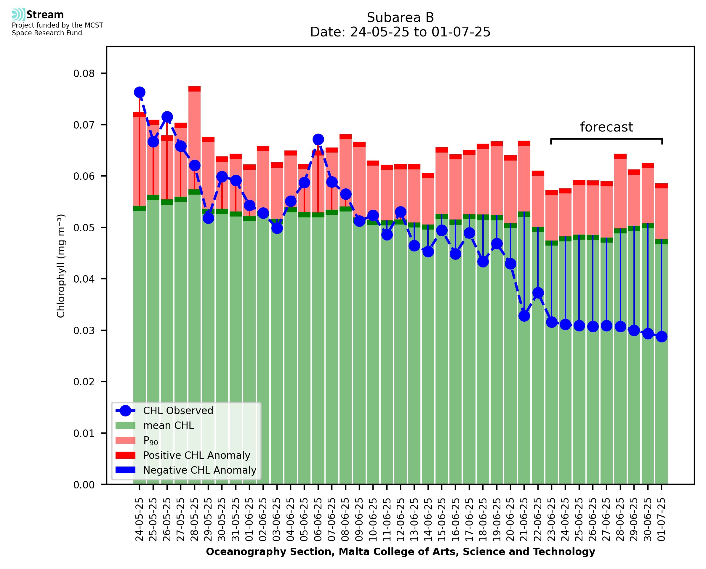 Spatial map of high chlorophyll occurrence and intensity. The CHL index is signalled when the CHL anomaly (CHLA) exceeds the CHL 90th percentile (CHL90) for at least 5 consecutive days. The CHL index gives a measure of the chlorophyll intensity, measured by the size of the CHLA compared to the difference between CHL90 and the climatological mean CHL.