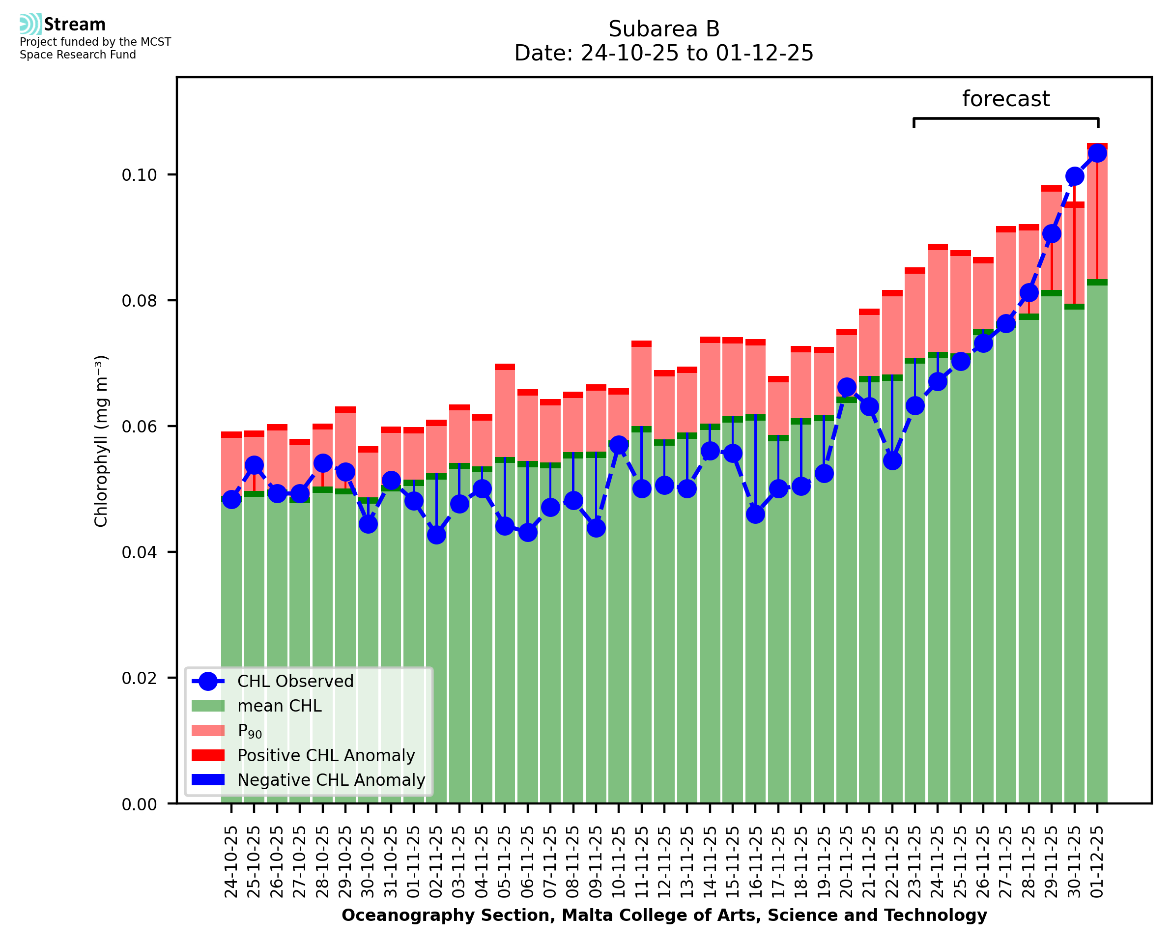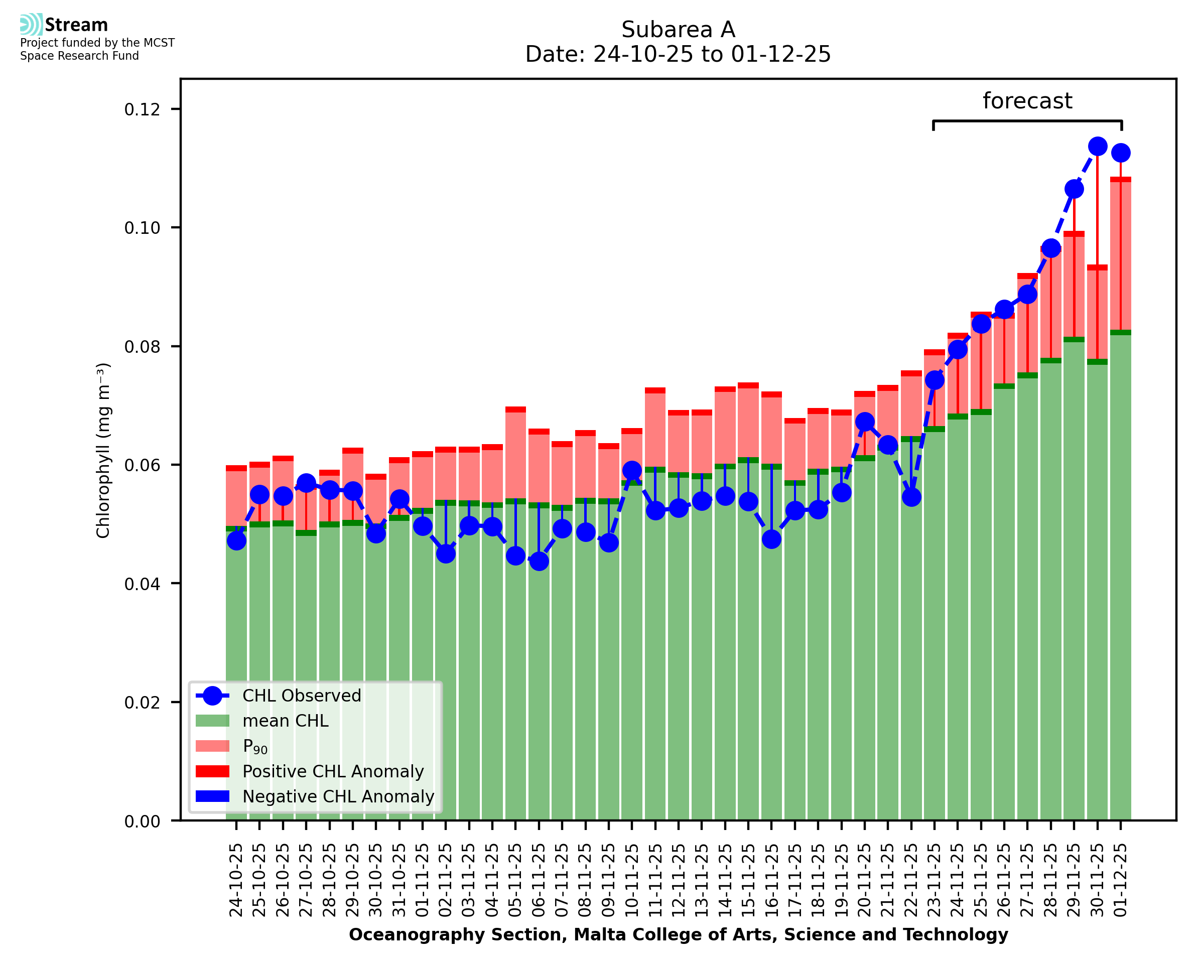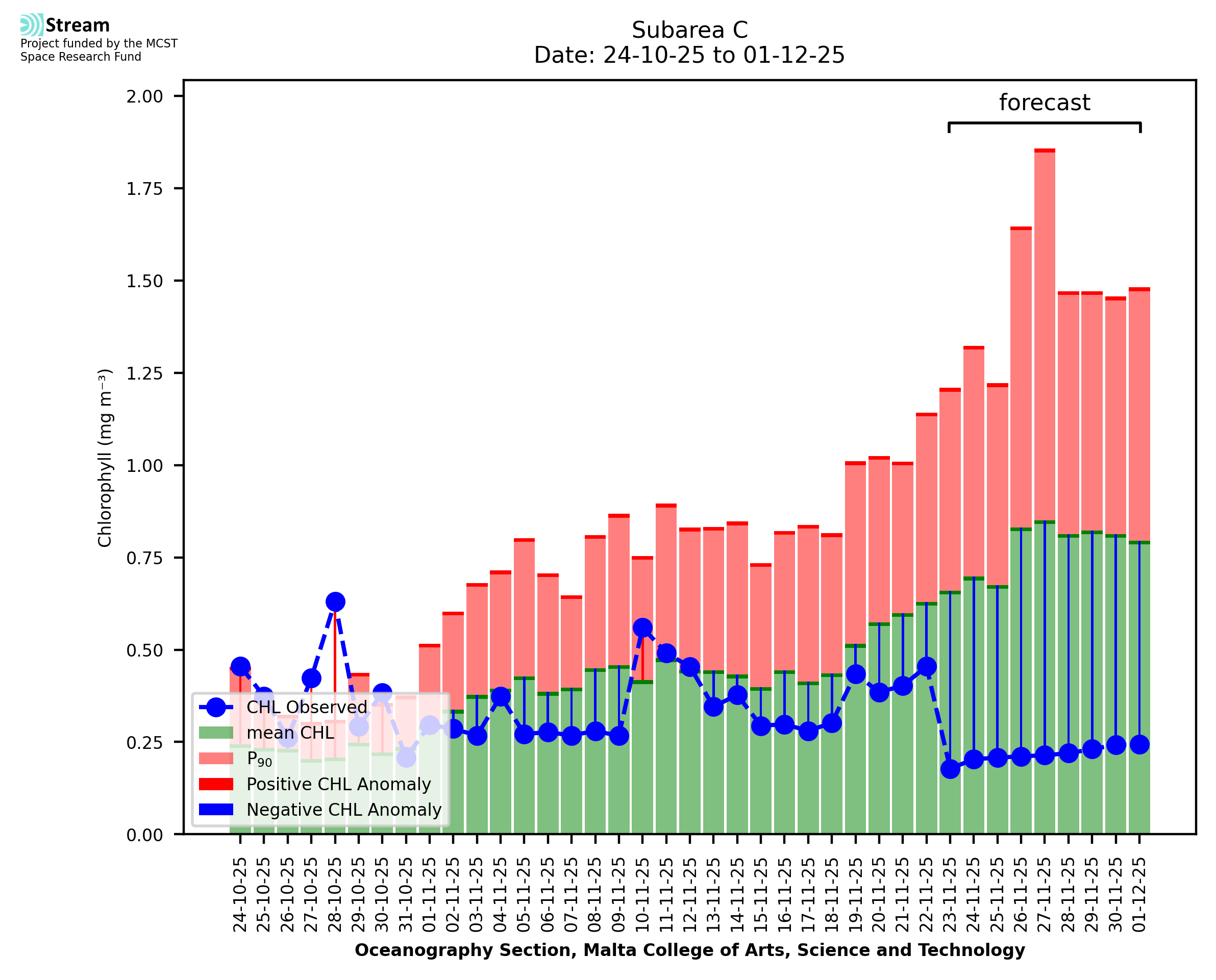 This STREAM service provides daily analysis of mass concentration of chlorophyll-a (CHL) anomalies, including spatial index maps for high chlorophyll occurrence and intensity in the Malta shelf area. User specific requests for data access and visualisation are planned for delivery on the STREAM mobile app. CHL is a core parameter in the Marine Strategy Framework Directive which provides the common framework for the assessment of the state of health of coastal seas to ensure coherence with the set goals of productive, healthy and clean European seas. CHL is considered to be a proxy of phythoplankton biomass and hence for eutrophication. Measuring chlorophyll is an indication of how much primary production is occurring in the sea.