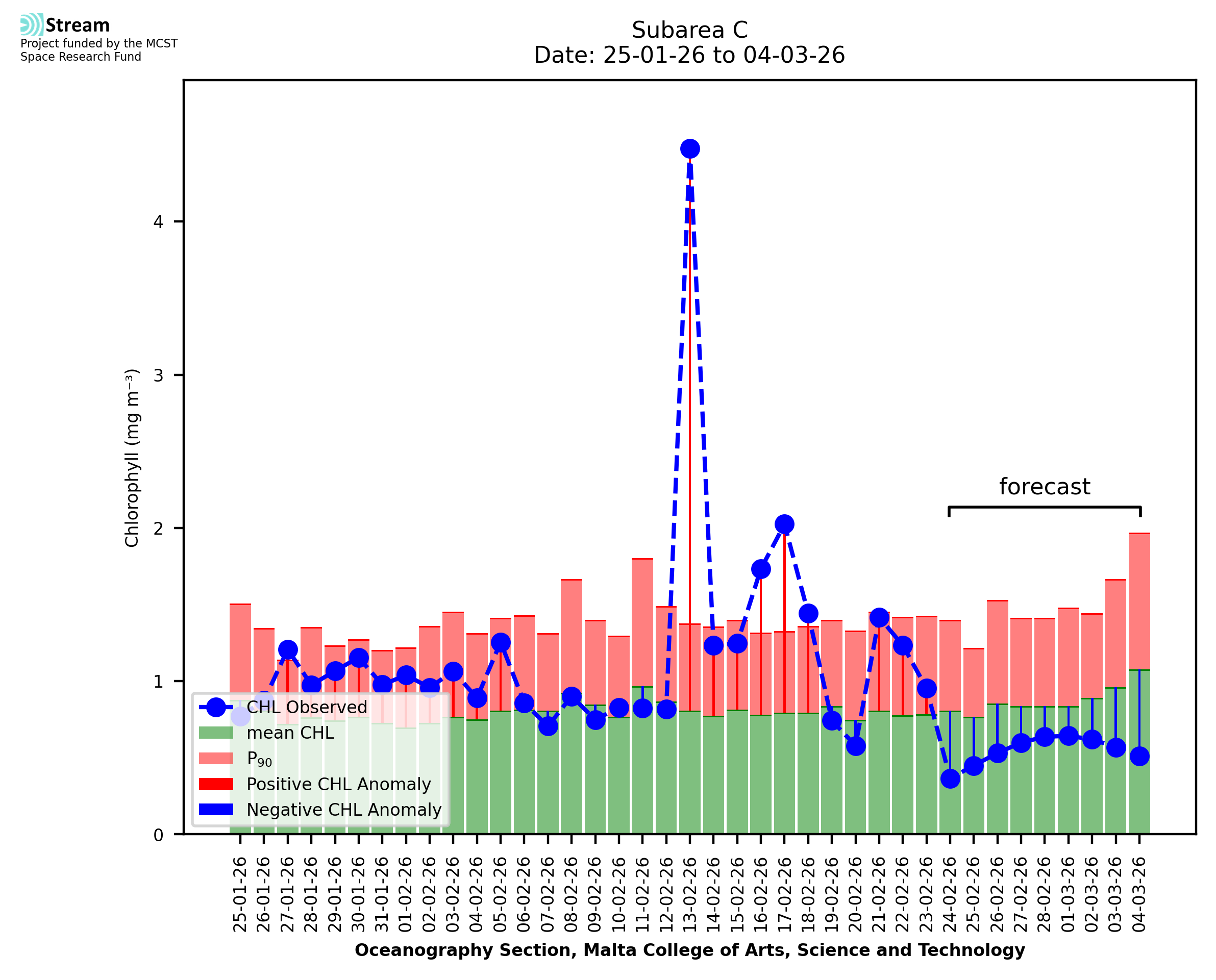 This STREAM service provides daily analysis of mass concentration of chlorophyll-a (CHL) anomalies, including spatial index maps for high chlorophyll occurrence and intensity in the Malta shelf area. User specific requests for data access and visualisation are planned for delivery on the STREAM mobile app. CHL is a core parameter in the Marine Strategy Framework Directive which provides the common framework for the assessment of the state of health of coastal seas to ensure coherence with the set goals of productive, healthy and clean European seas. CHL is considered to be a proxy of phythoplankton biomass and hence for eutrophication. Measuring chlorophyll is an indication of how much primary production is occurring in the sea.