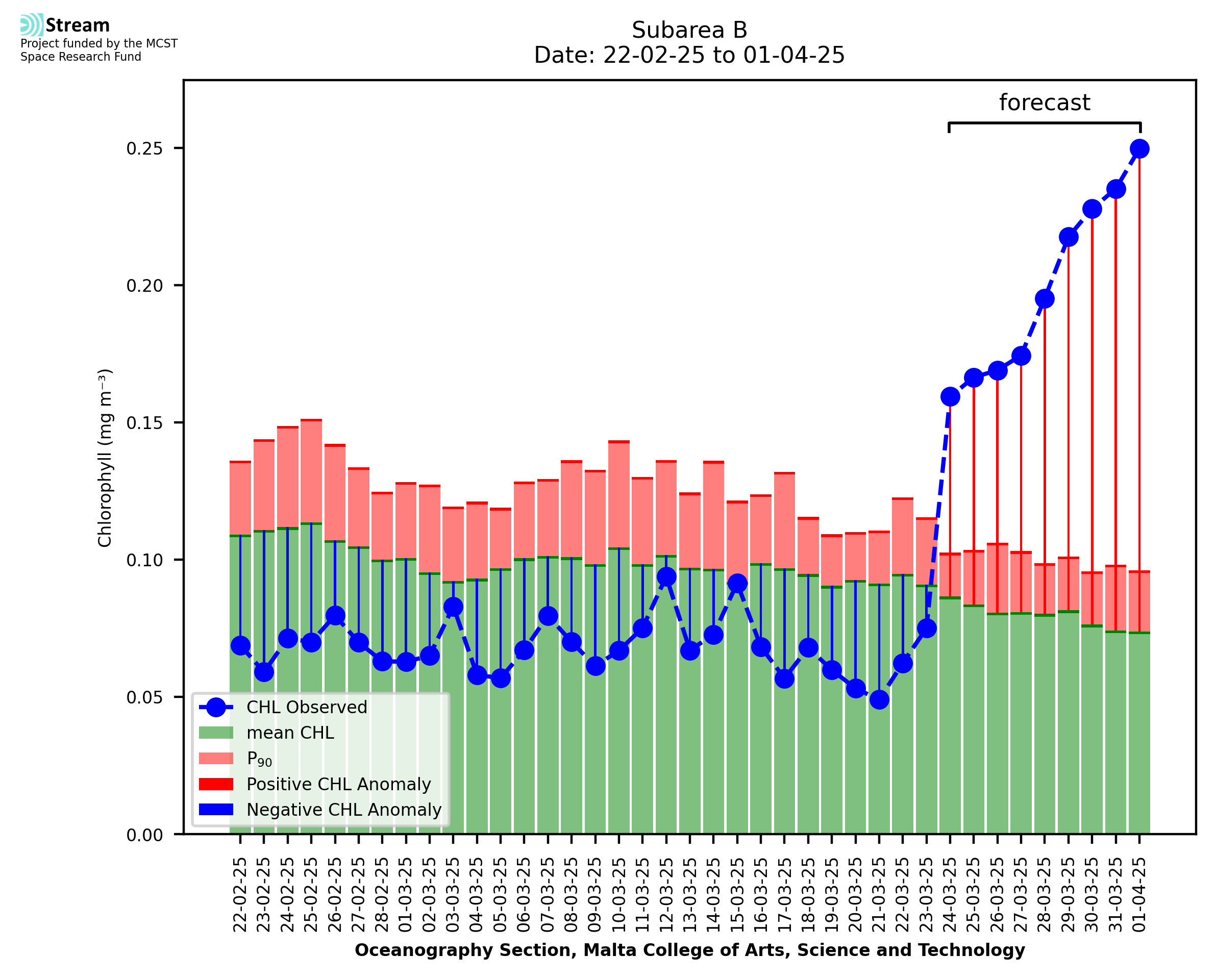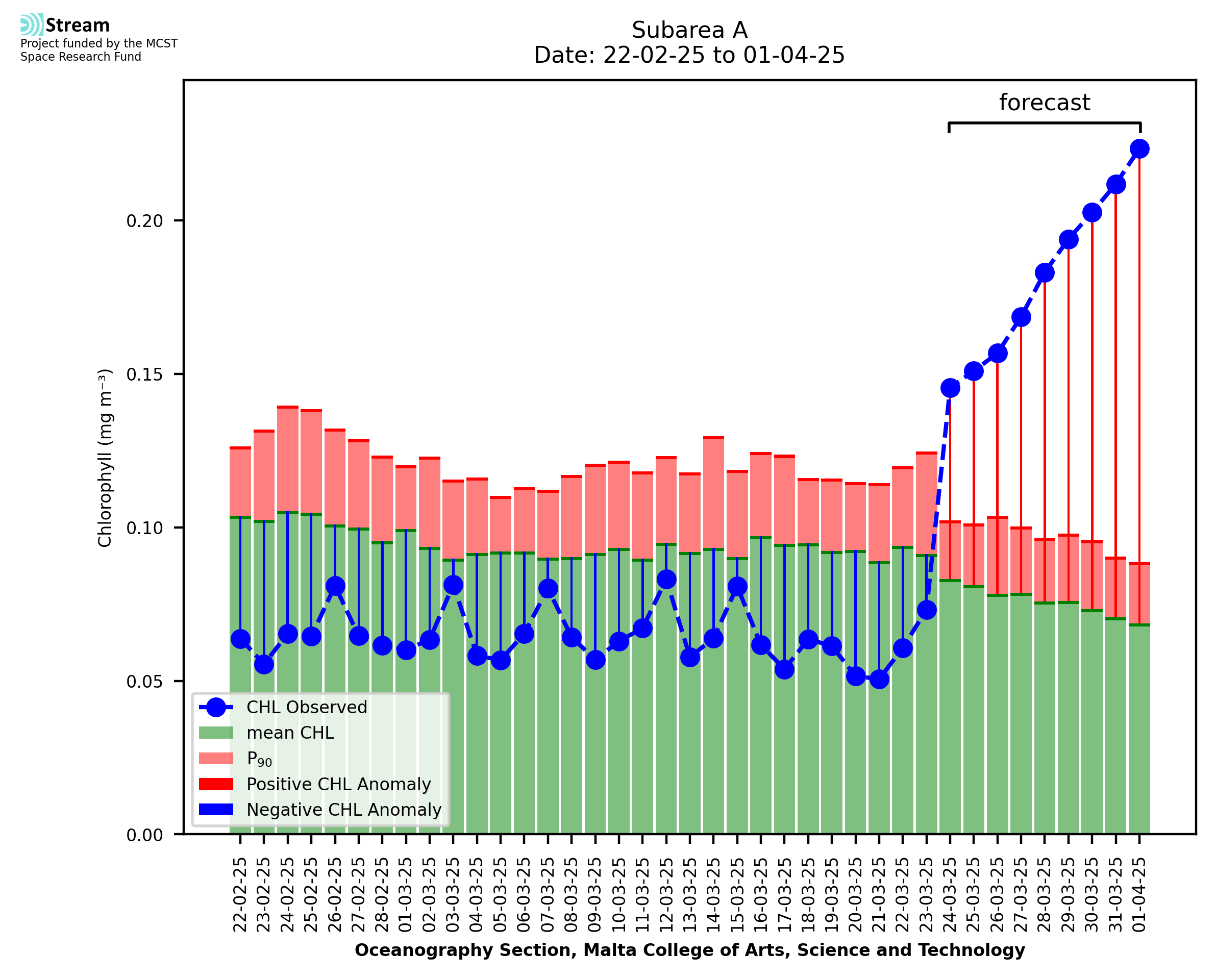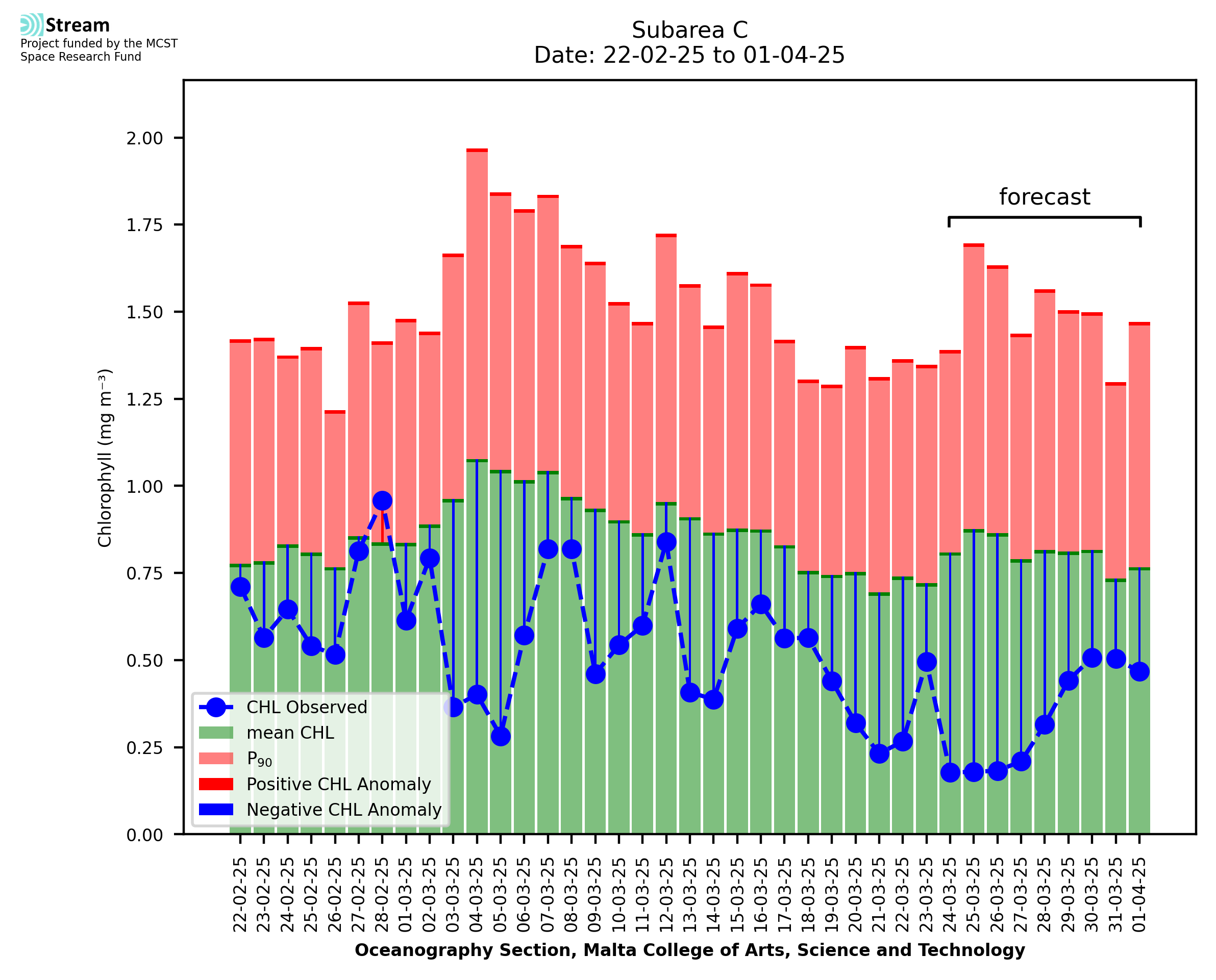 This STREAM service provides daily analysis of mass concentration of chlorophyll-a (CHL) anomalies, including spatial index maps for high chlorophyll occurrence and intensity in the Malta shelf area. User specific requests for data access and visualisation are planned for delivery on the STREAM mobile app. CHL is a core parameter in the Marine Strategy Framework Directive which provides the common framework for the assessment of the state of health of coastal seas to ensure coherence with the set goals of productive, healthy and clean European seas. CHL is considered to be a proxy of phythoplankton biomass and hence for eutrophication. Measuring chlorophyll is an indication of how much primary production is occurring in the sea.