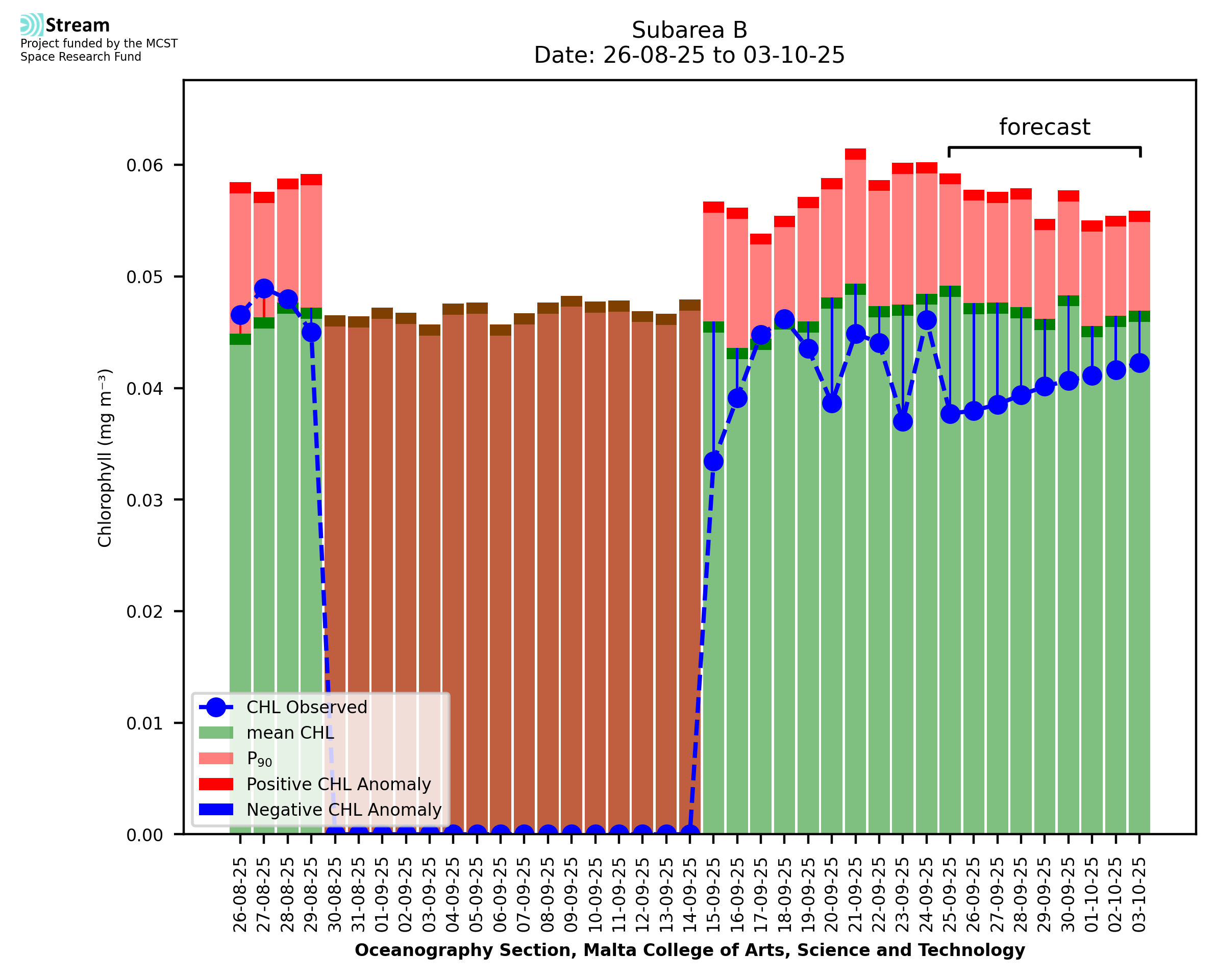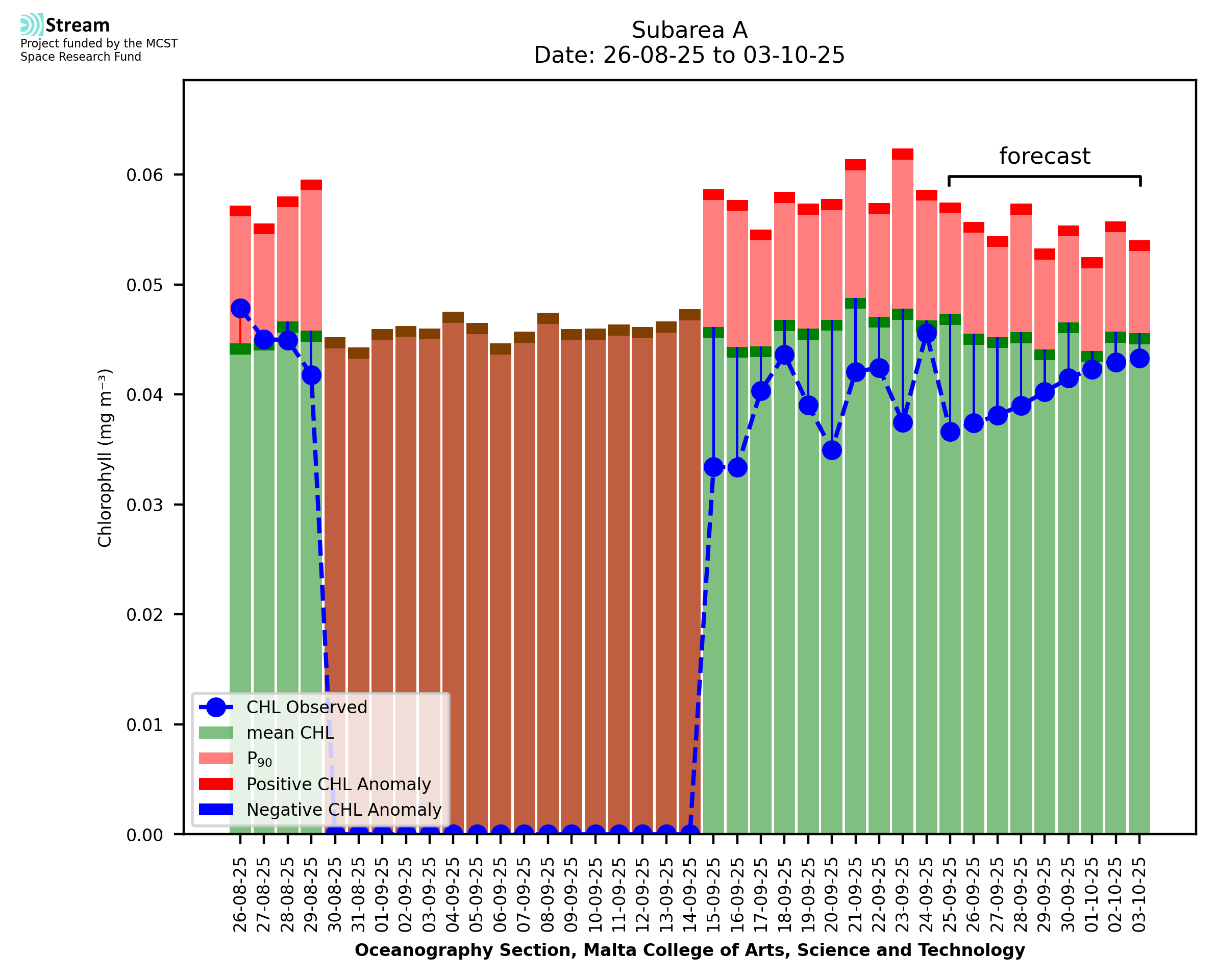 This STREAM service provides daily analysis of mass concentration of chlorophyll-a (CHL) anomalies, including spatial index maps for high chlorophyll occurrence and intensity in the Malta shelf area. User specific requests for data access and visualisation are planned for delivery on the STREAM mobile app. CHL is a core parameter in the Marine Strategy Framework Directive which provides the common framework for the assessment of the state of health of coastal seas to ensure coherence with the set goals of productive, healthy and clean European seas. CHL is considered to be a proxy of phythoplankton biomass and hence for eutrophication. Measuring chlorophyll is an indication of how much primary production is occurring in the sea.