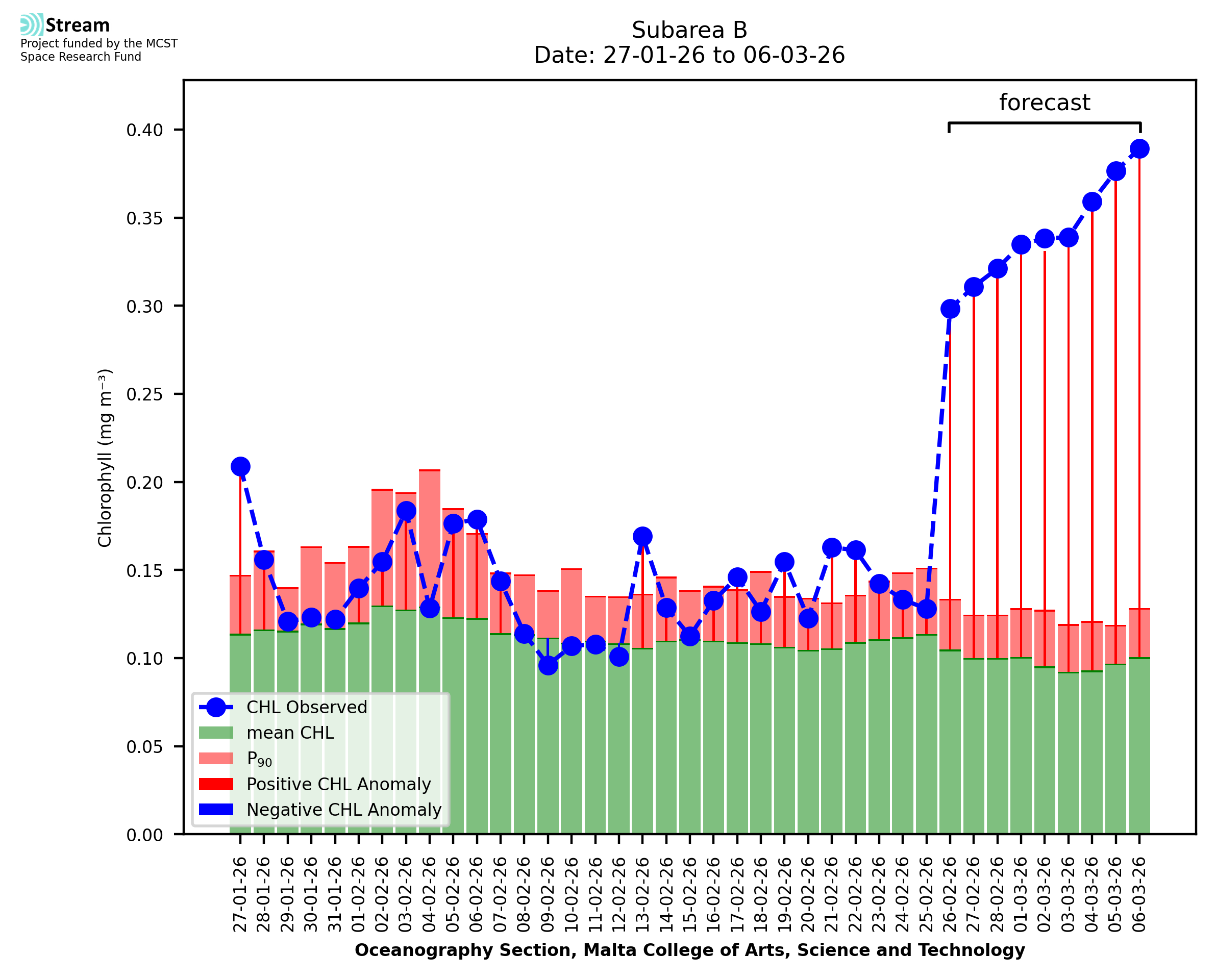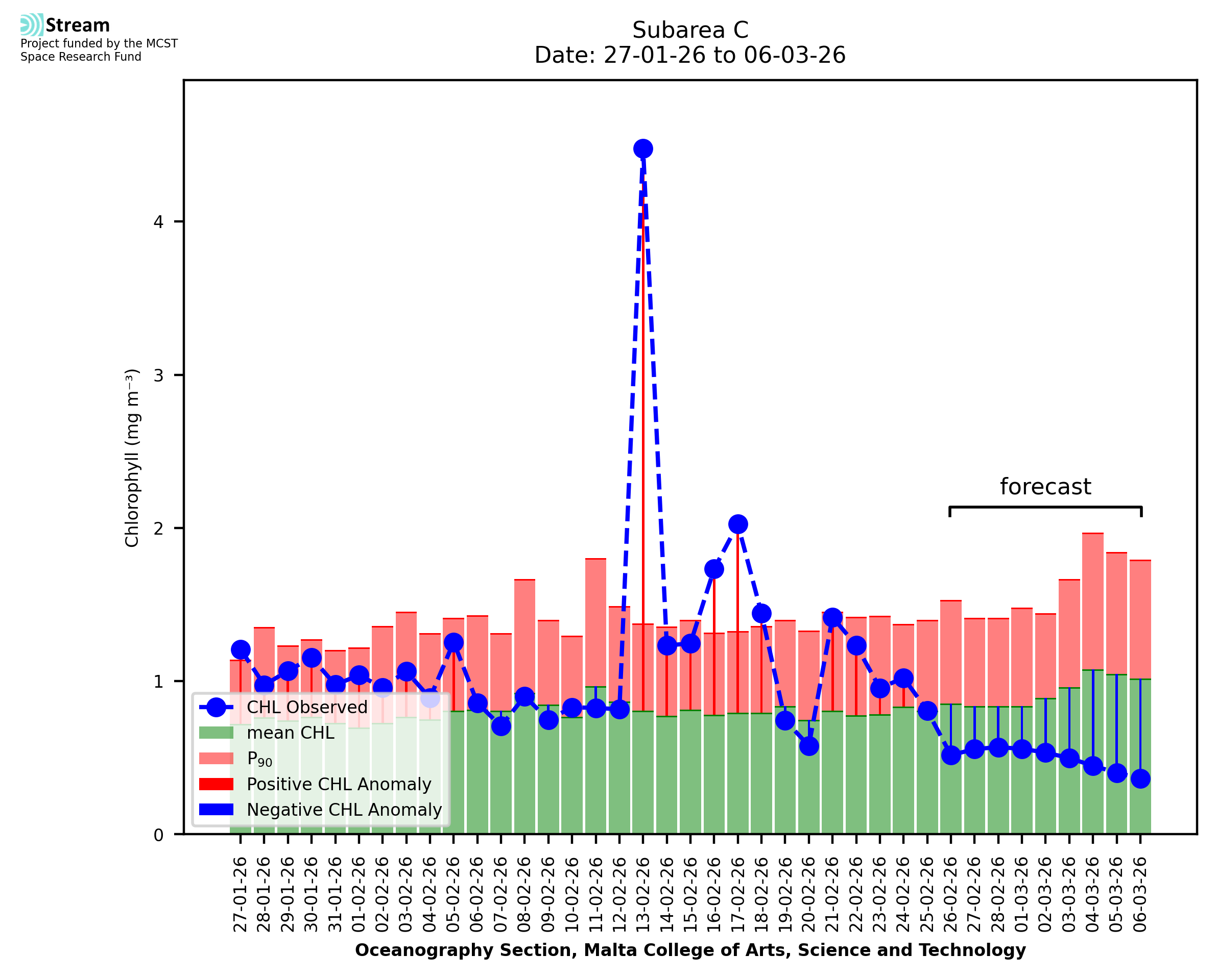 This STREAM service provides daily analysis of mass concentration of chlorophyll-a (CHL) anomalies, including spatial index maps for high chlorophyll occurrence and intensity in the Malta shelf area. User specific requests for data access and visualisation are planned for delivery on the STREAM mobile app. CHL is a core parameter in the Marine Strategy Framework Directive which provides the common framework for the assessment of the state of health of coastal seas to ensure coherence with the set goals of productive, healthy and clean European seas. CHL is considered to be a proxy of phythoplankton biomass and hence for eutrophication. Measuring chlorophyll is an indication of how much primary production is occurring in the sea.