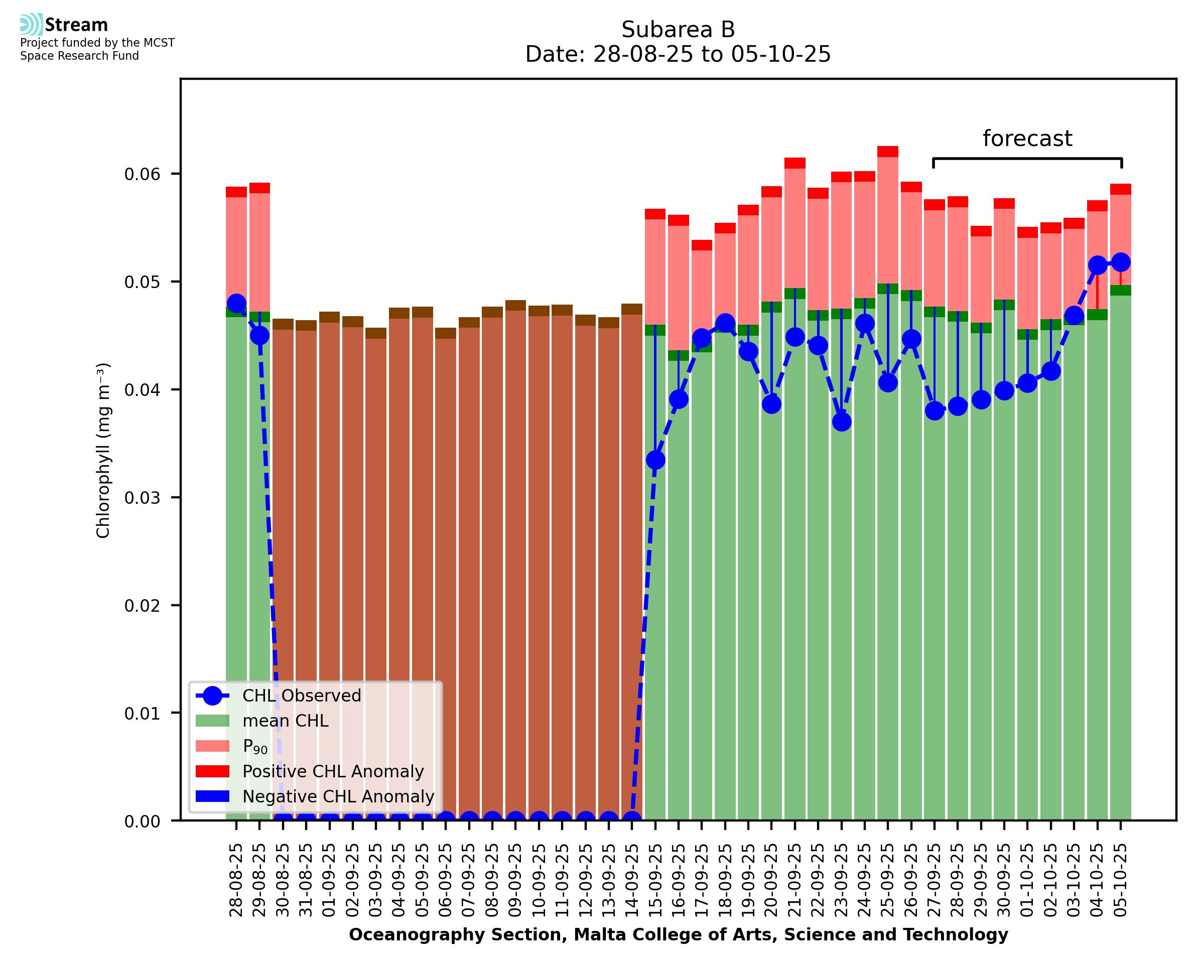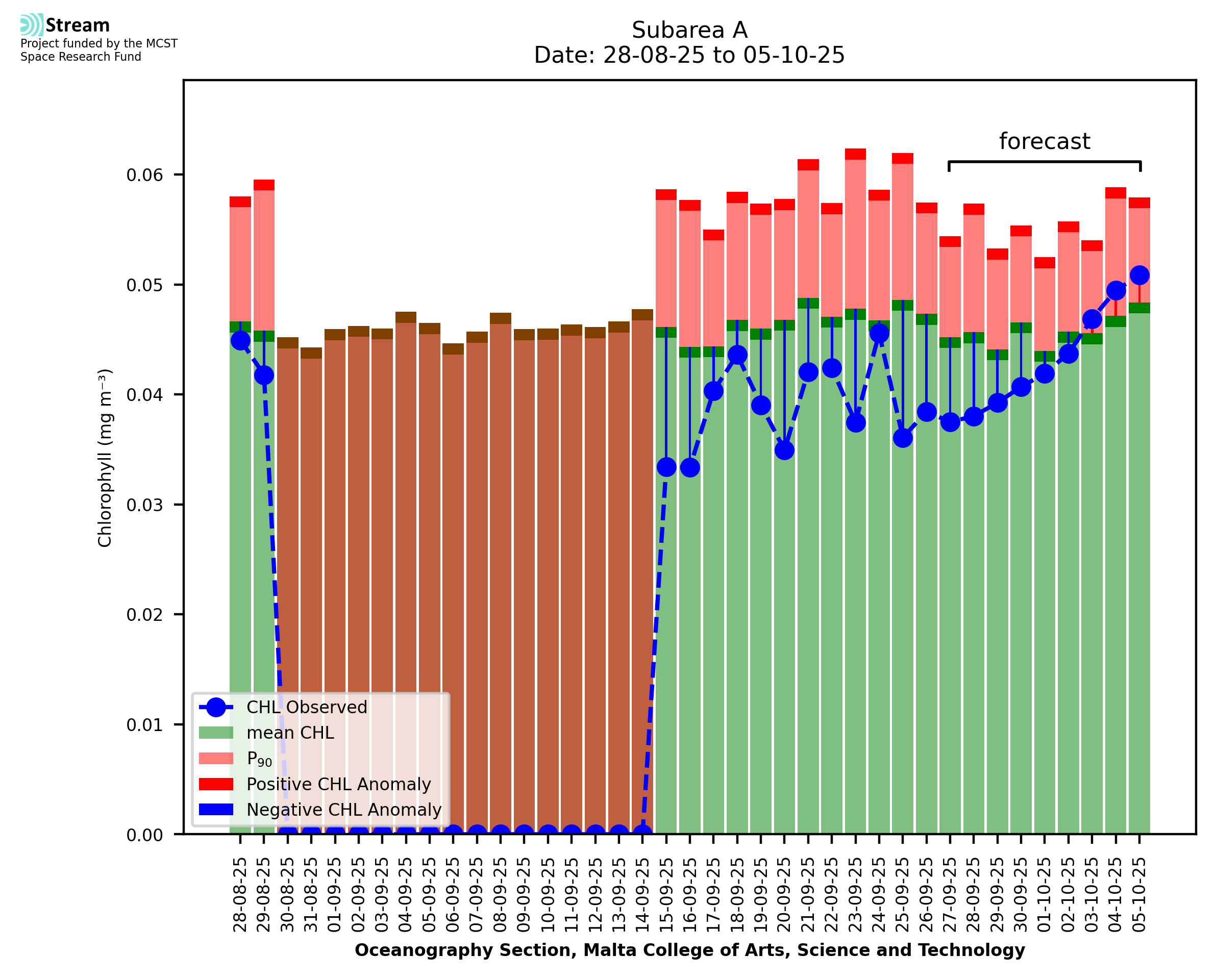 This STREAM service provides daily analysis of mass concentration of chlorophyll-a (CHL) anomalies, including spatial index maps for high chlorophyll occurrence and intensity in the Malta shelf area. User specific requests for data access and visualisation are planned for delivery on the STREAM mobile app. CHL is a core parameter in the Marine Strategy Framework Directive which provides the common framework for the assessment of the state of health of coastal seas to ensure coherence with the set goals of productive, healthy and clean European seas. CHL is considered to be a proxy of phythoplankton biomass and hence for eutrophication. Measuring chlorophyll is an indication of how much primary production is occurring in the sea.